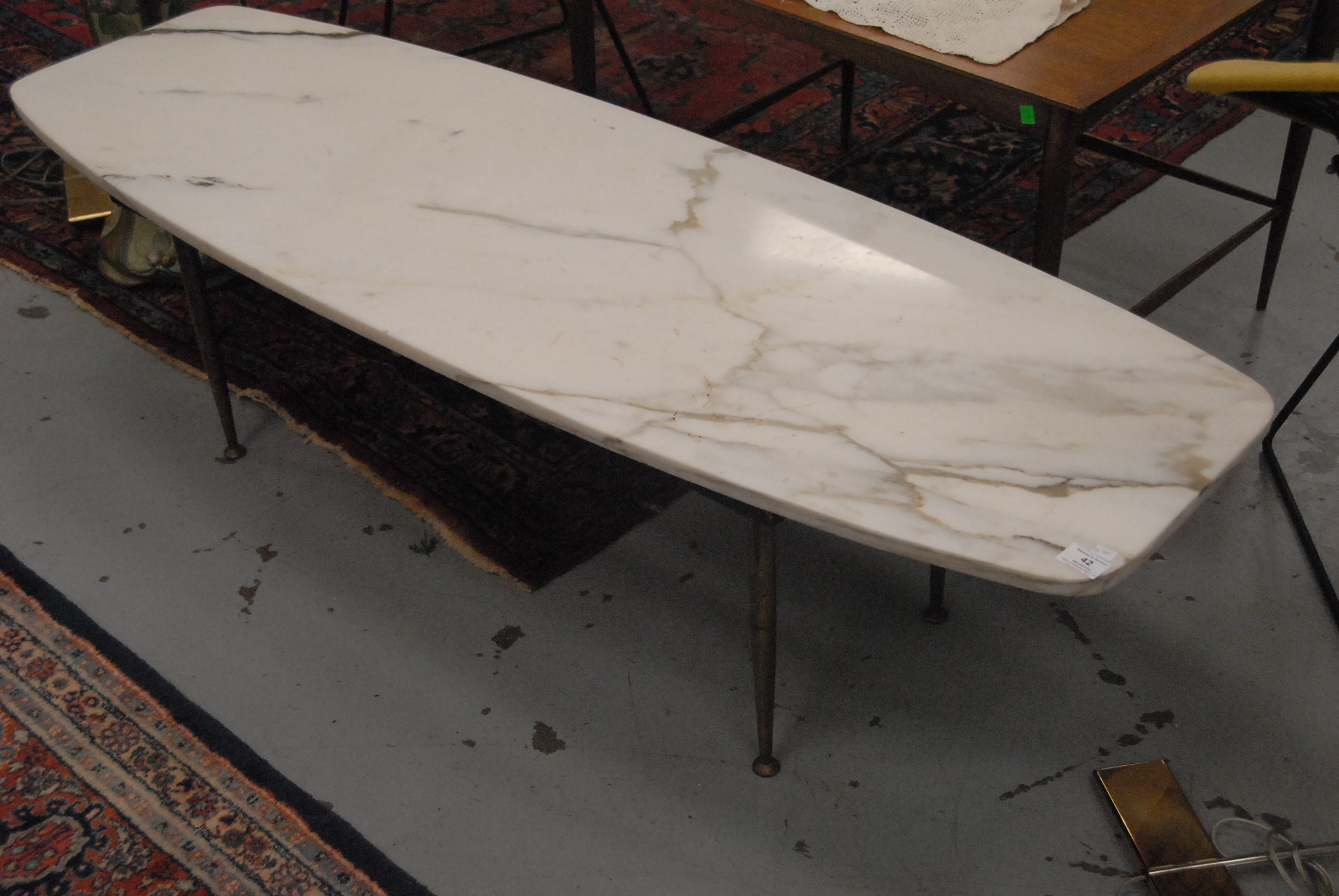 Lot 42: Boat tail marble top coffee table with brass legs, in very good condition, ht. 16 1/2in. wd. 20in. lg. 60in.