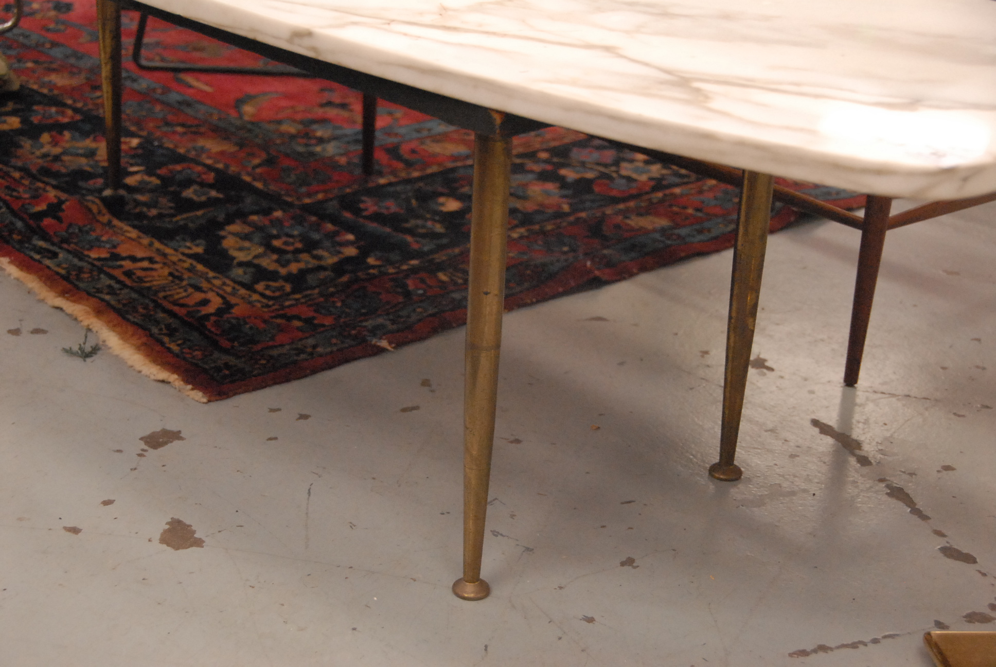 Boat tail marble top coffee table with brass legs, in very good condition, ht. 16 1/2in. wd. 20in. lg. 60in.
