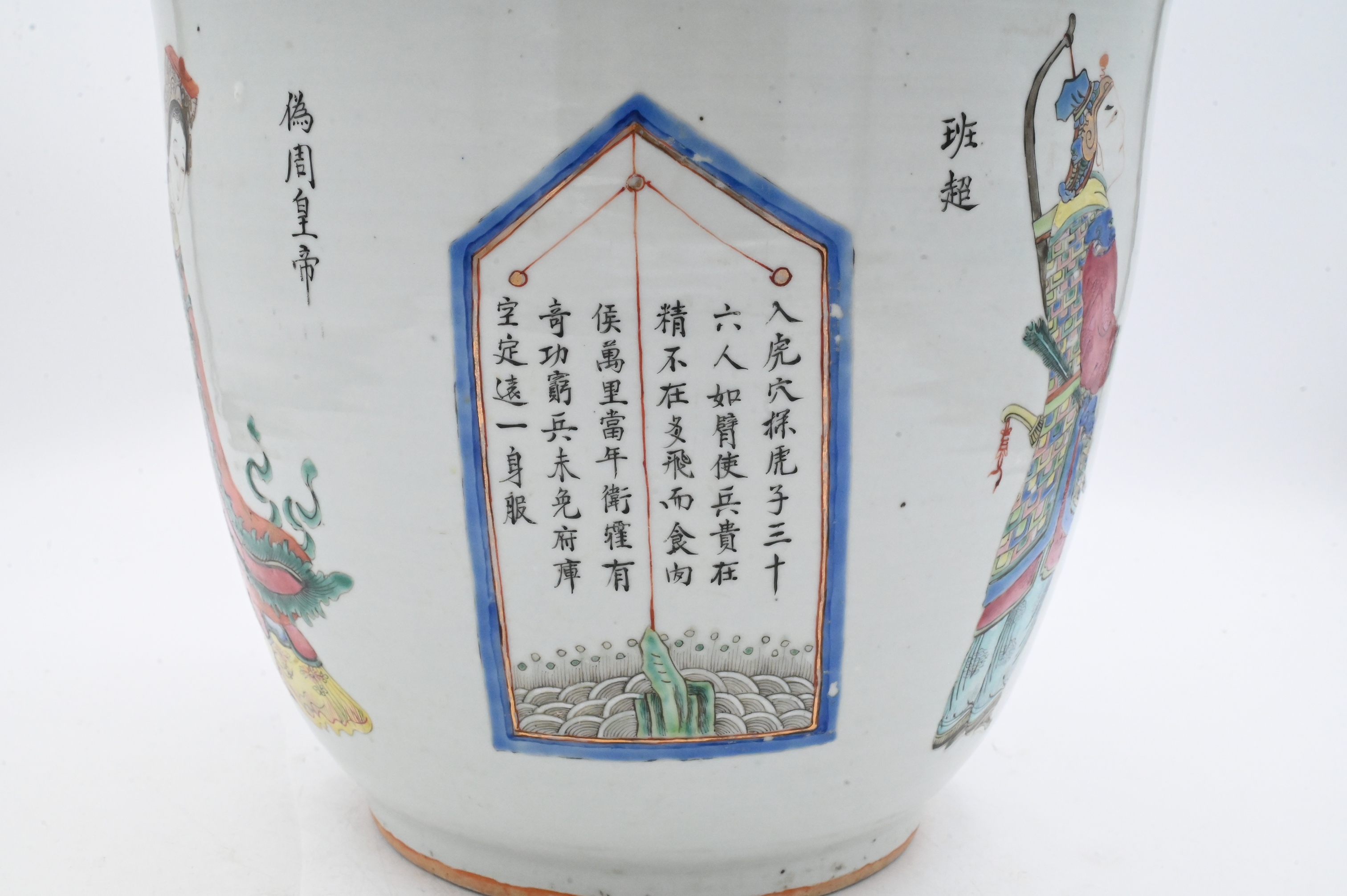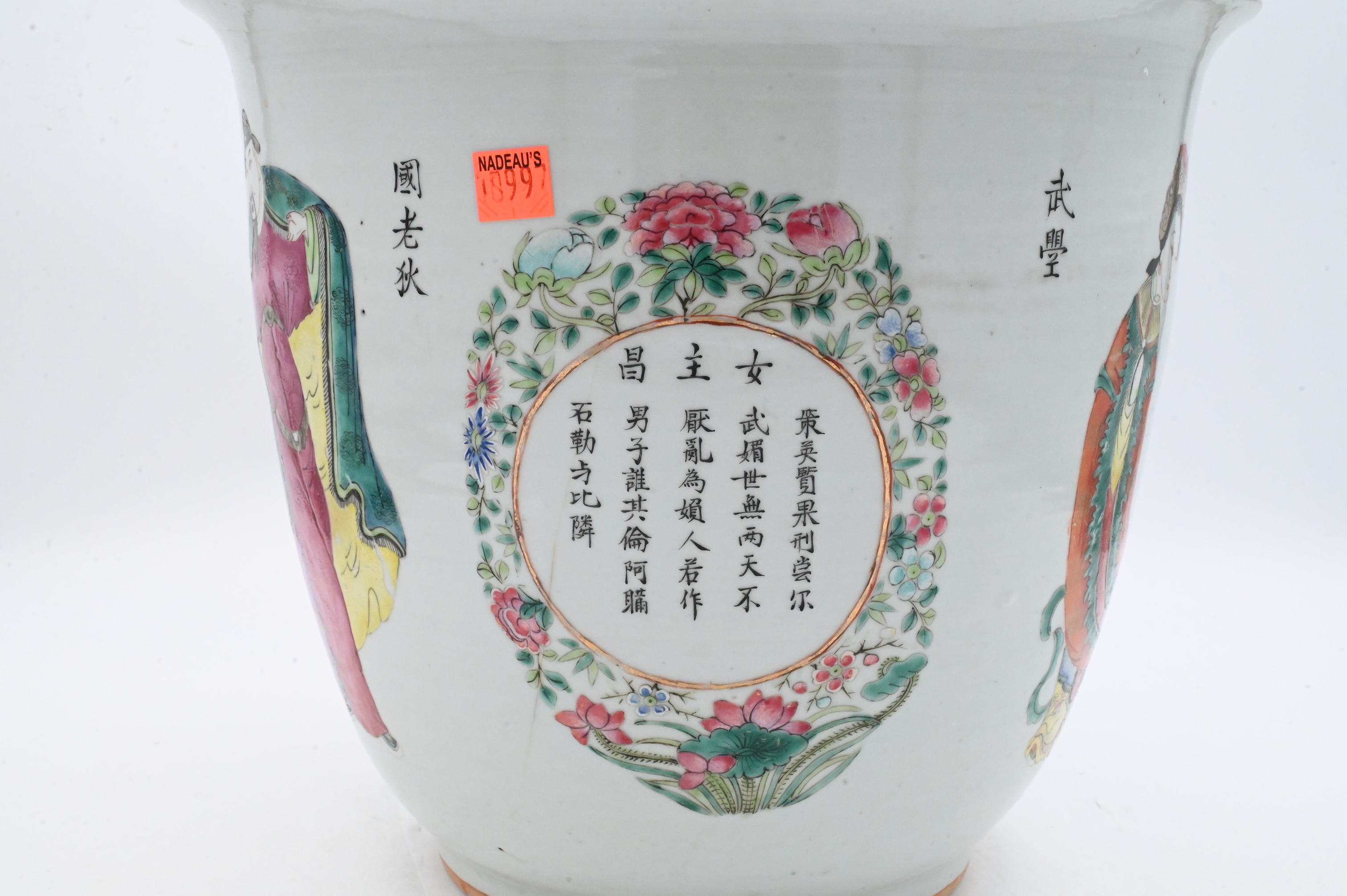 historical figures from the “Table of Peerless Heroes”, planter painted in famille rose enamels with alternating panels of scholars and warrior figures, each with identifying inscriptions, interspersed with calligraphic panels. The decoration executed in a fine palette of pinks, greens, and iron red, drainage hole
