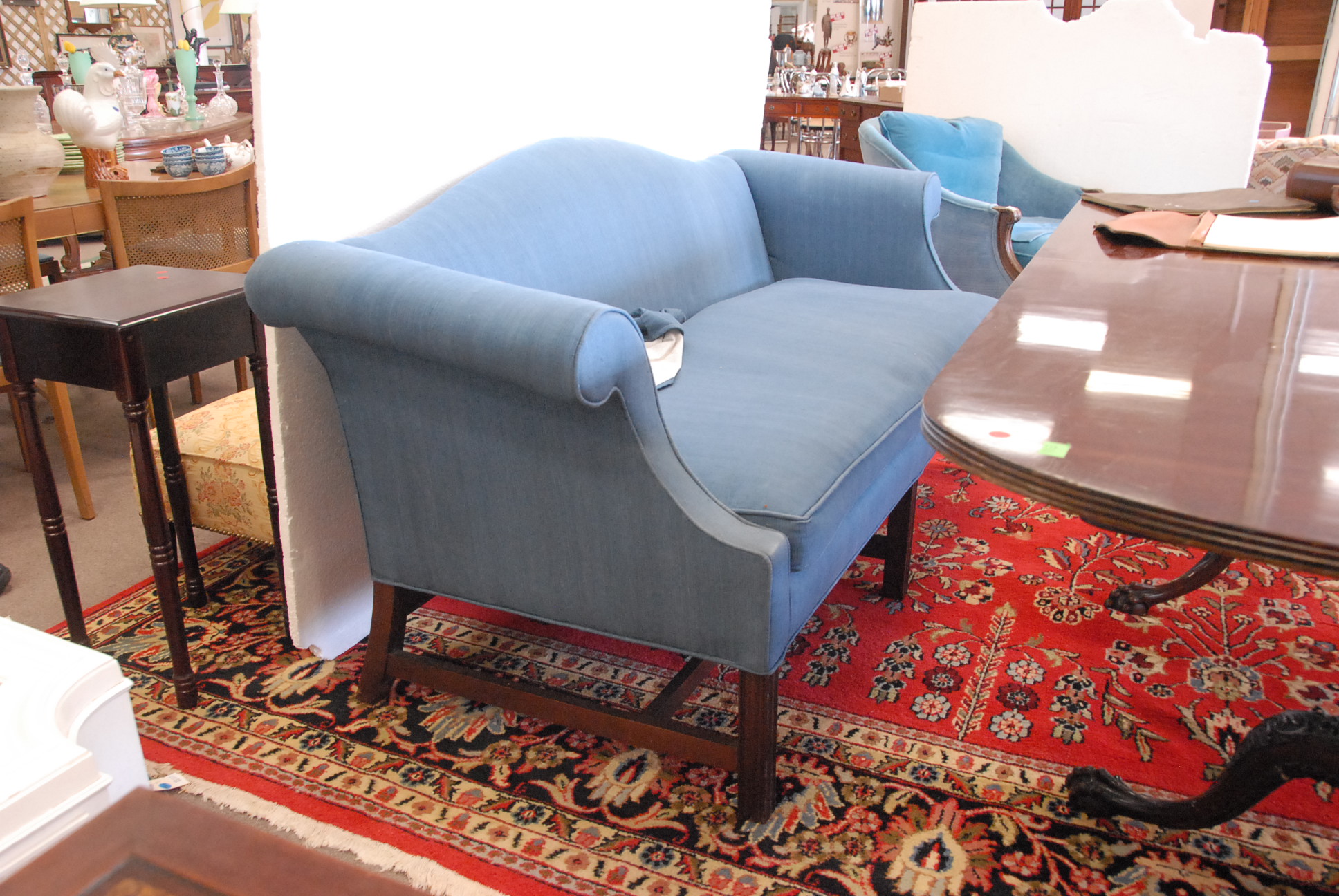 Chippendale style upholstered camel back sofa.