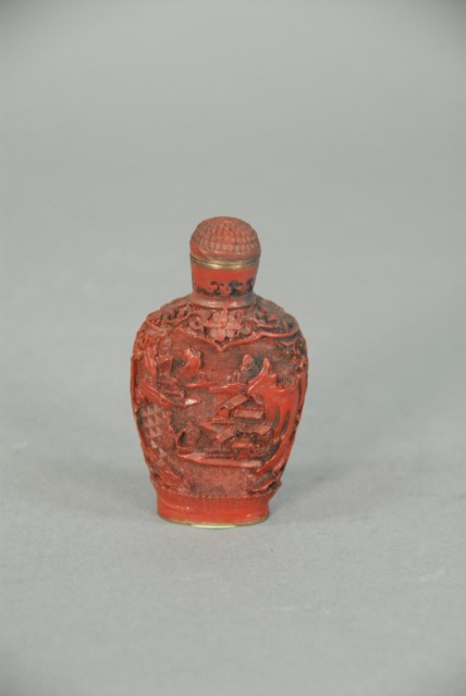 Cinnabar lacquered metal snuff bottle with a scene of ocean and houses.