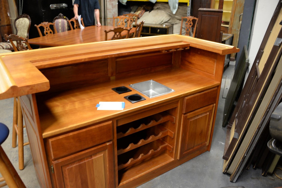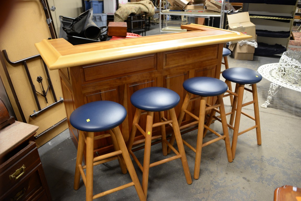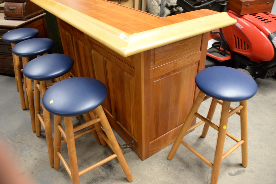 Custom cherry bar and five bar stools with dry sink, and bottle and glass holders. ht. 43 in. wd. 77 in. dp. 34 in.