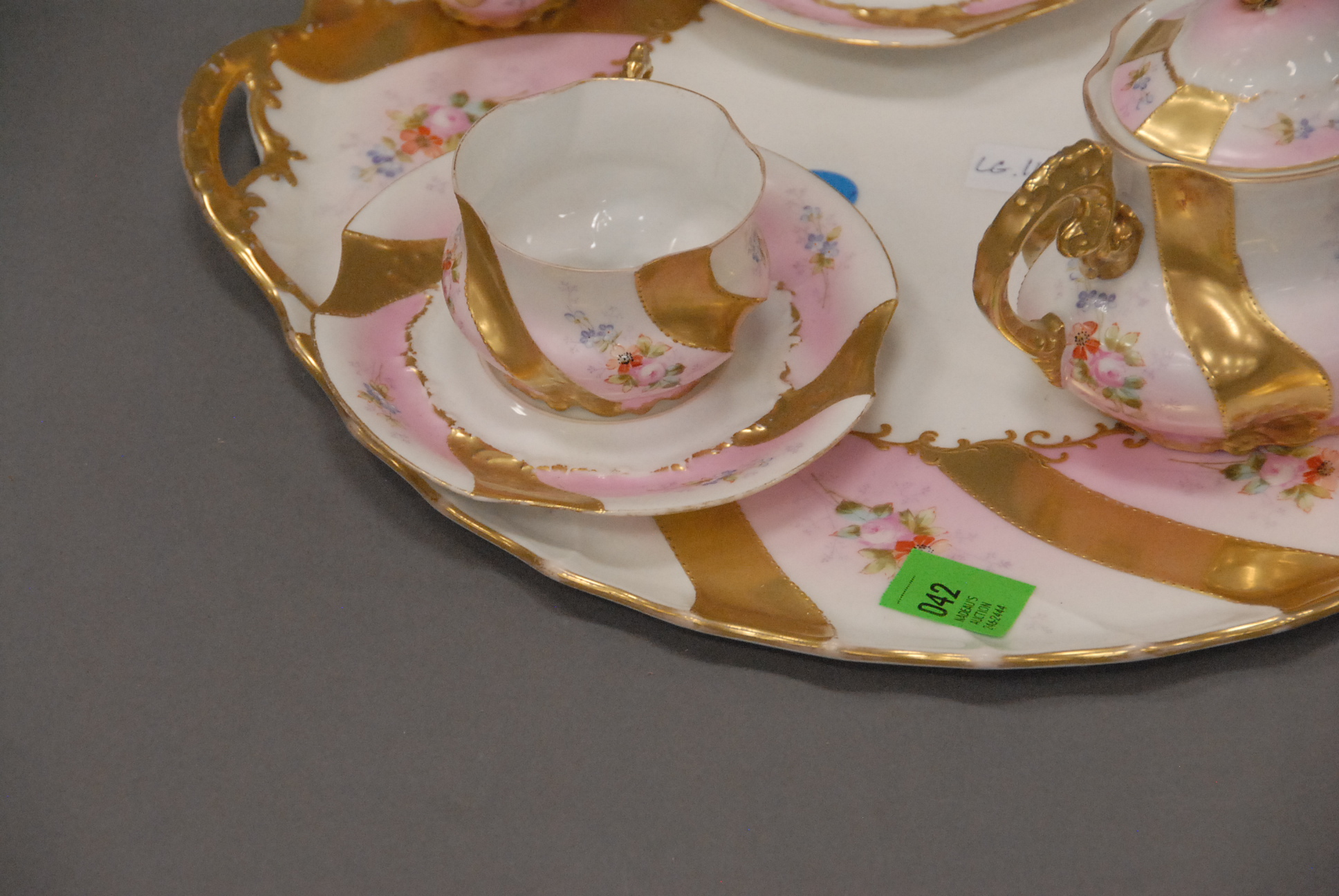 Eight piece Limoges tea set including a tray, two cups and saucers, covered sugar bowl, covered tea pot, and creamer, one finial broken on sugar bowl
