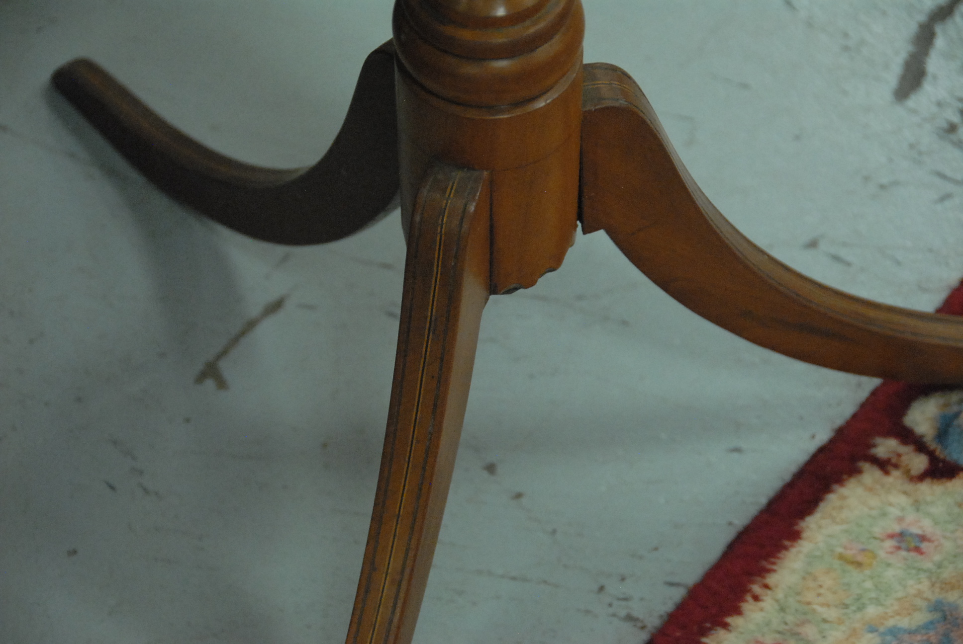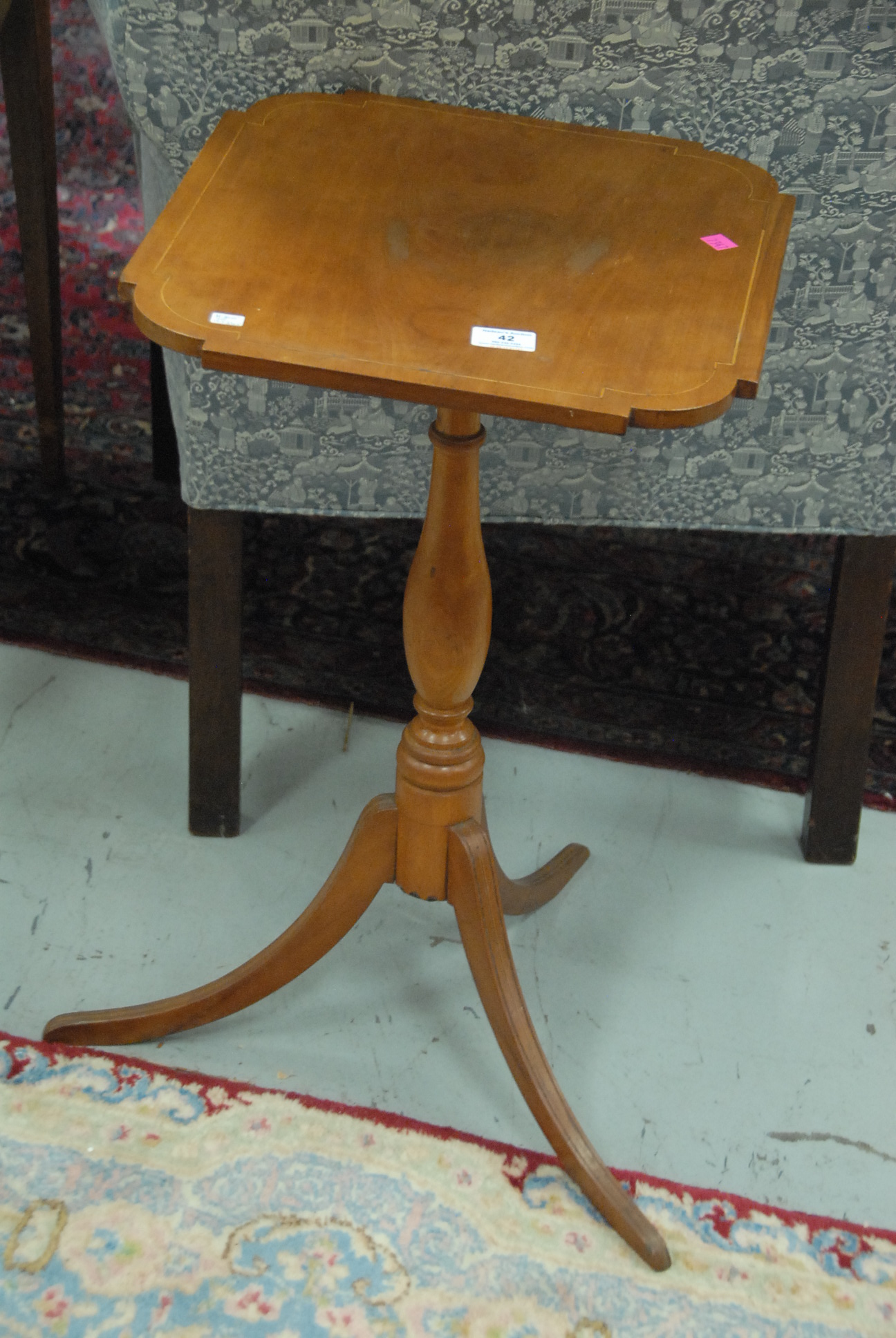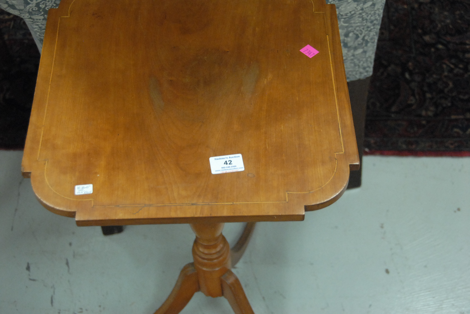 Lot 42: Federal cherry candlestand with shaped top having turned shaft on three down swept members, with line inlaid top and legs. ht. 26 1/2 in. top: 15 1/2 x 16 1/2 Provenance: Property from The Estate of W. Scott Van Alstyne of Essex, Con