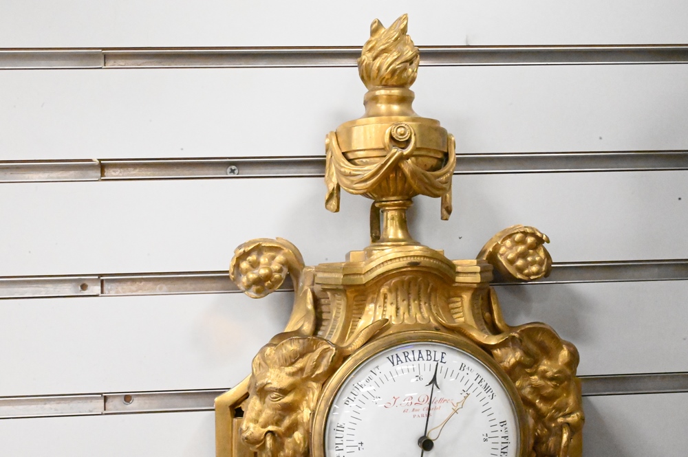 J.B. Delettrez French Bronze Barometer, having flaming urn finial over gilt bronze body with rams heads over mask, enameled dial marked J.B. Delettrez Paris, height 16 inches.