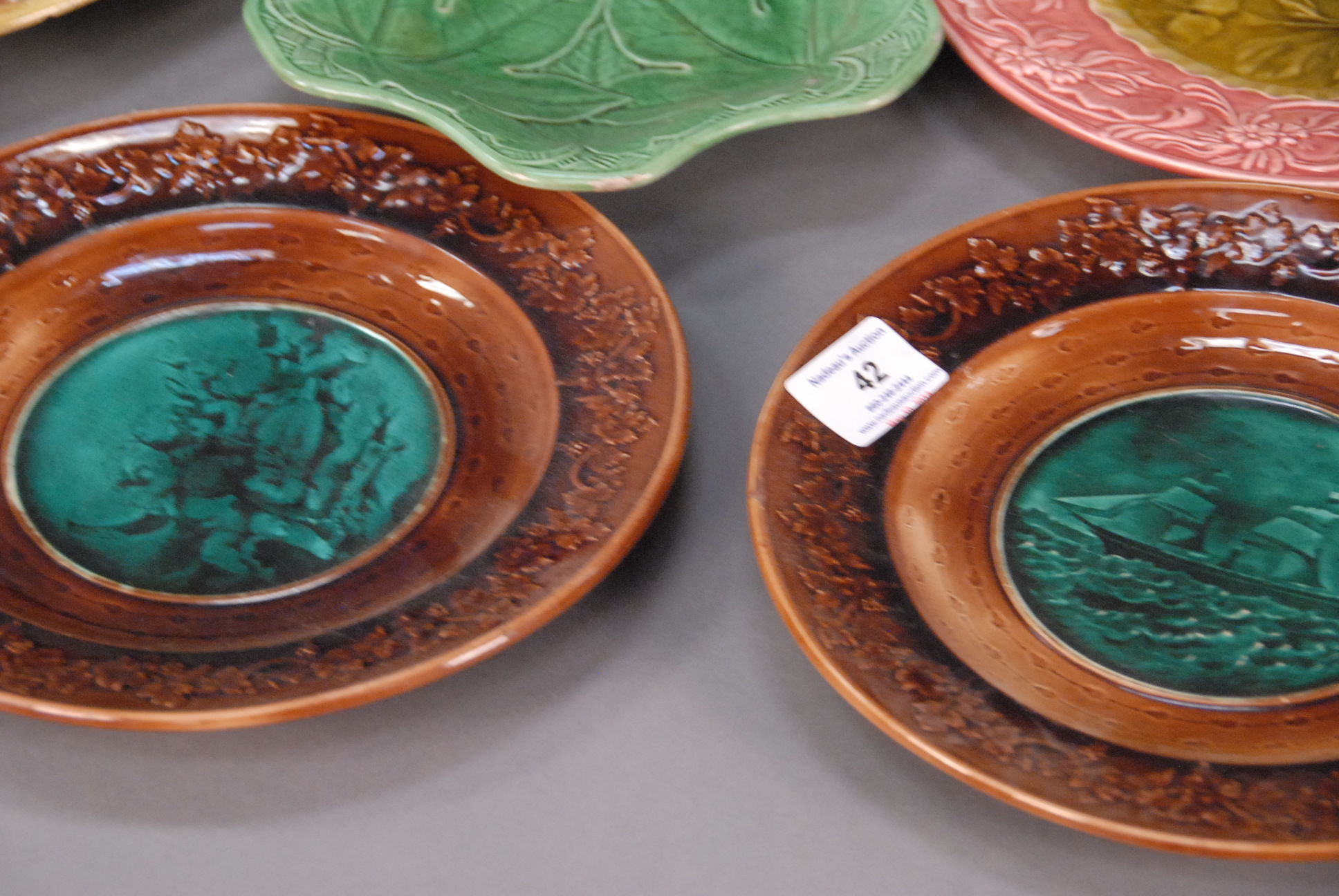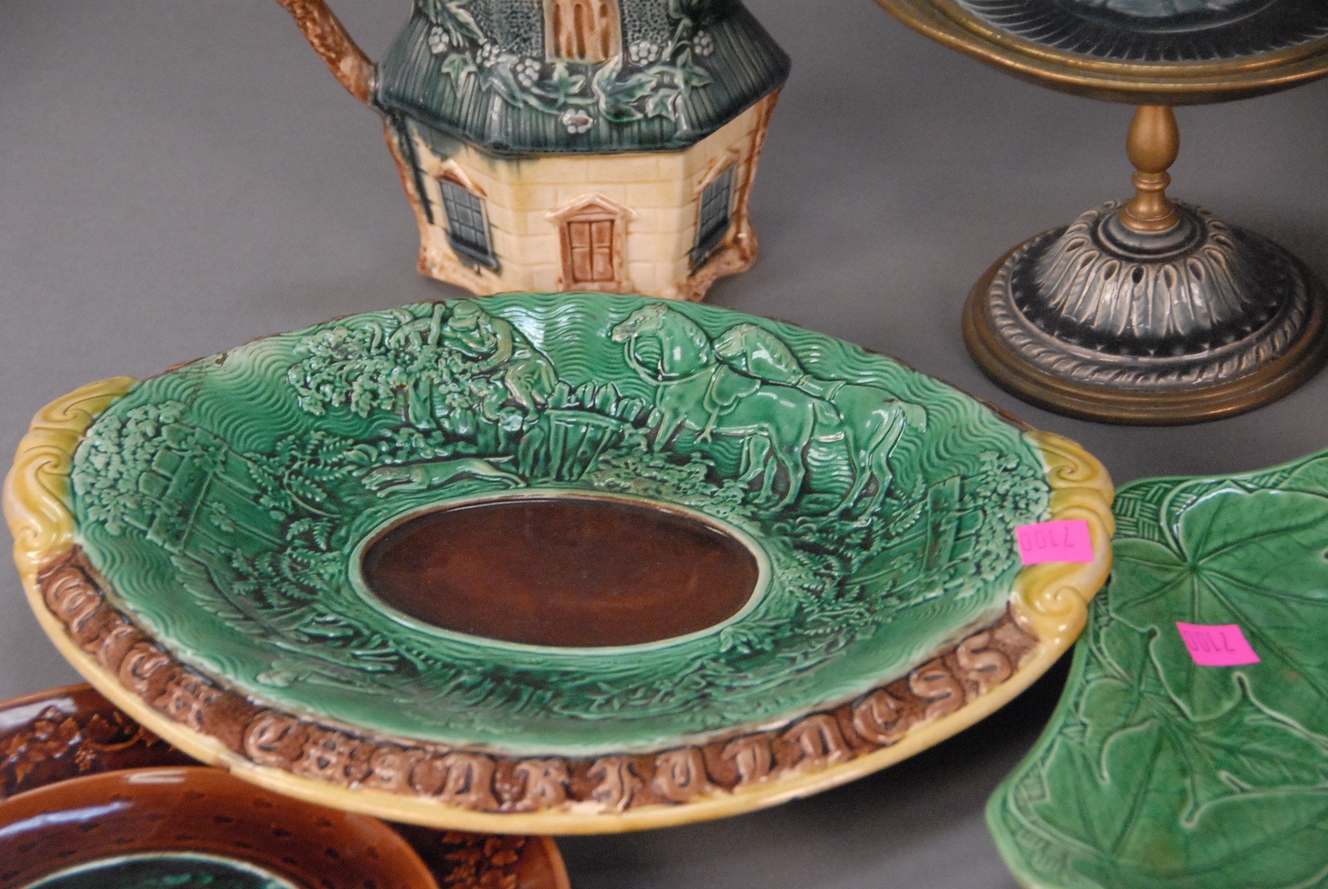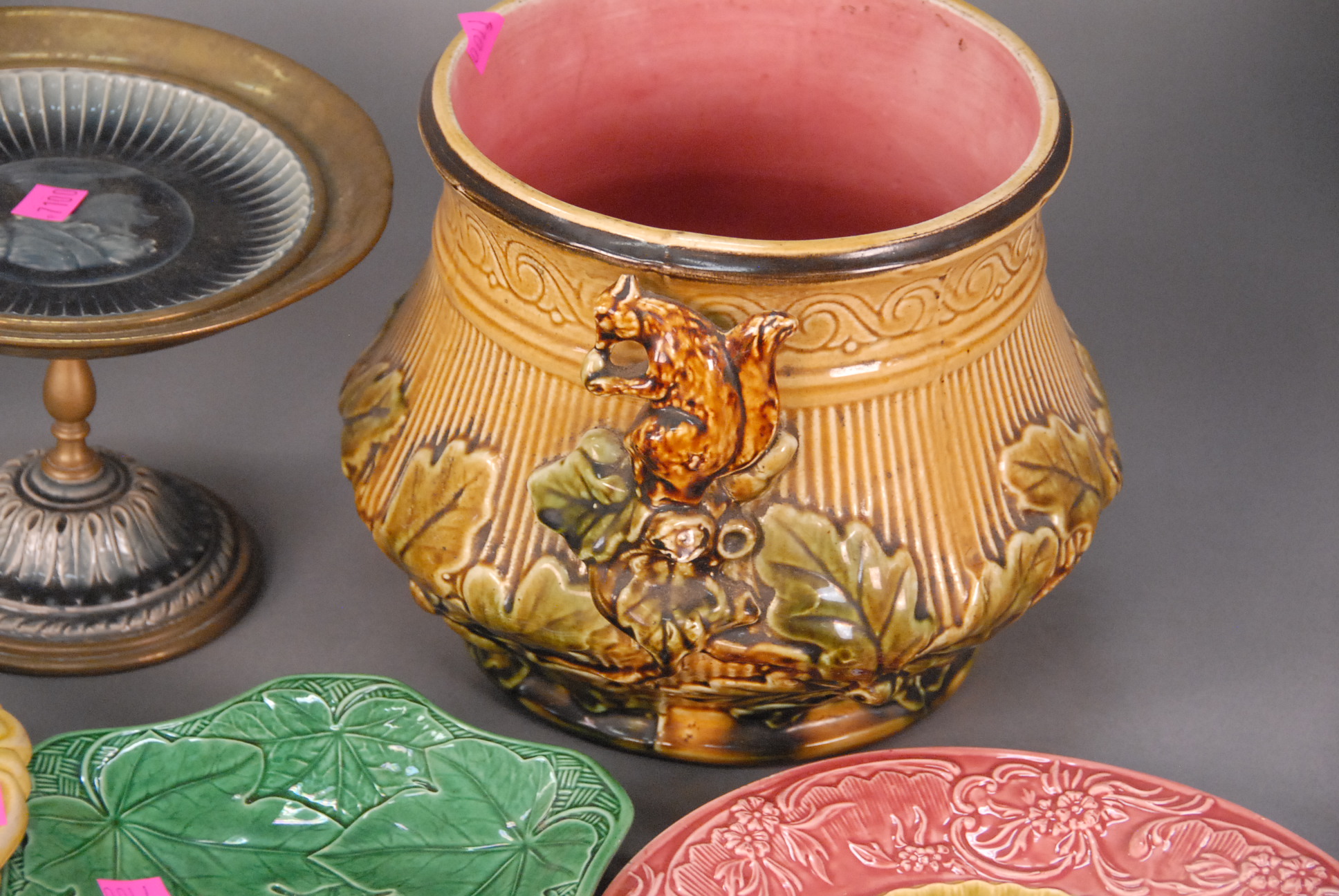 Nine piece Majolica lot to include plates, urn, compote, etc.