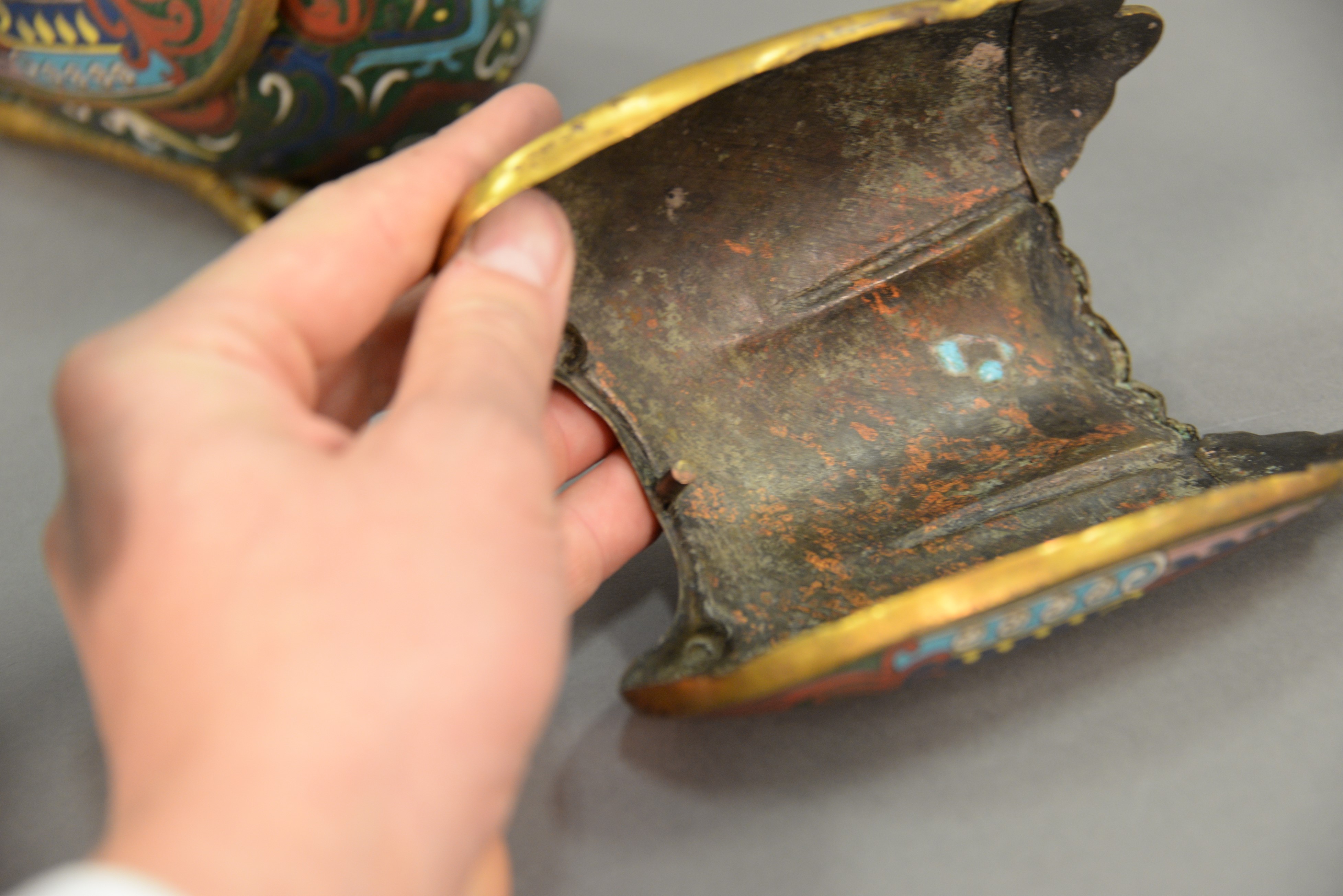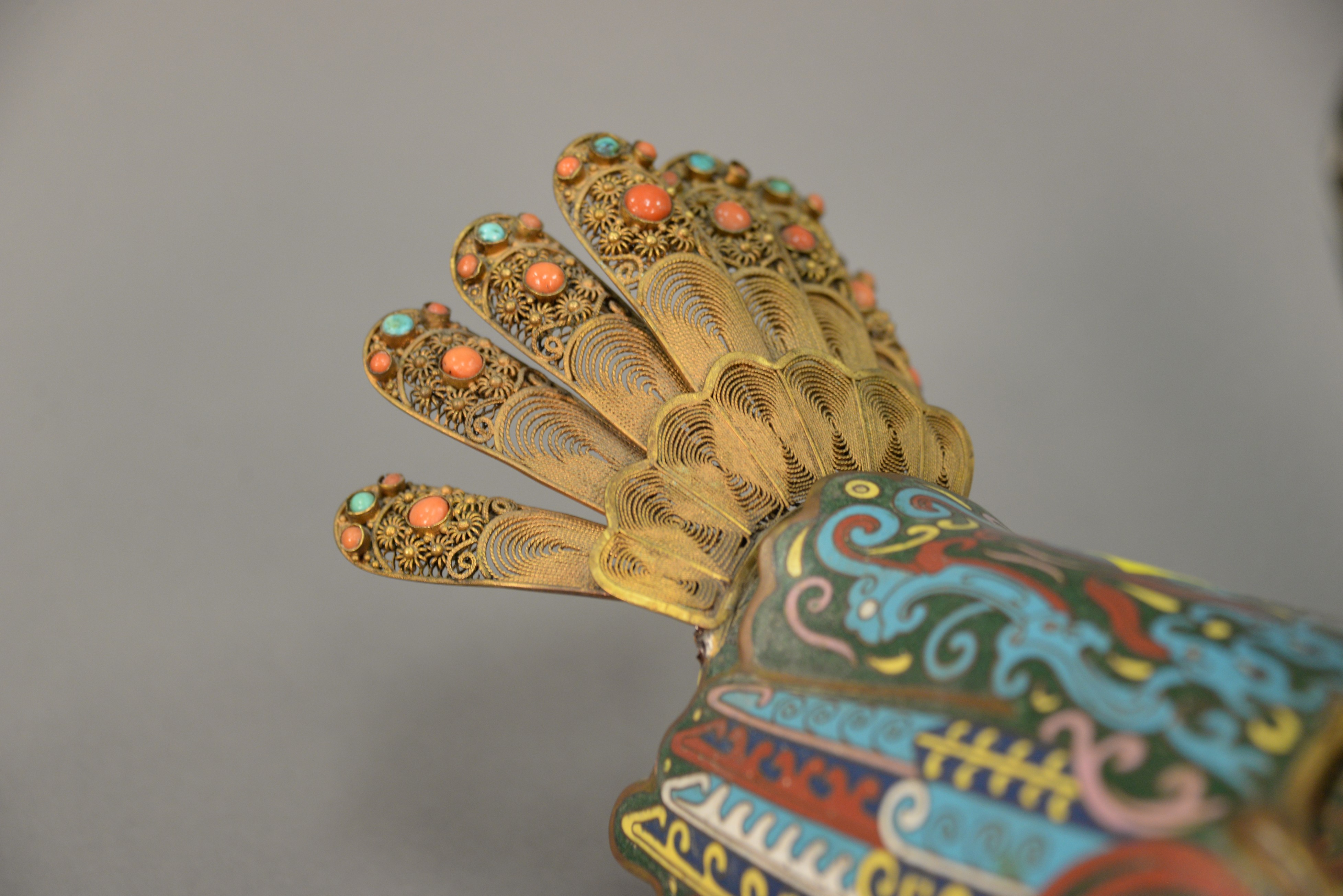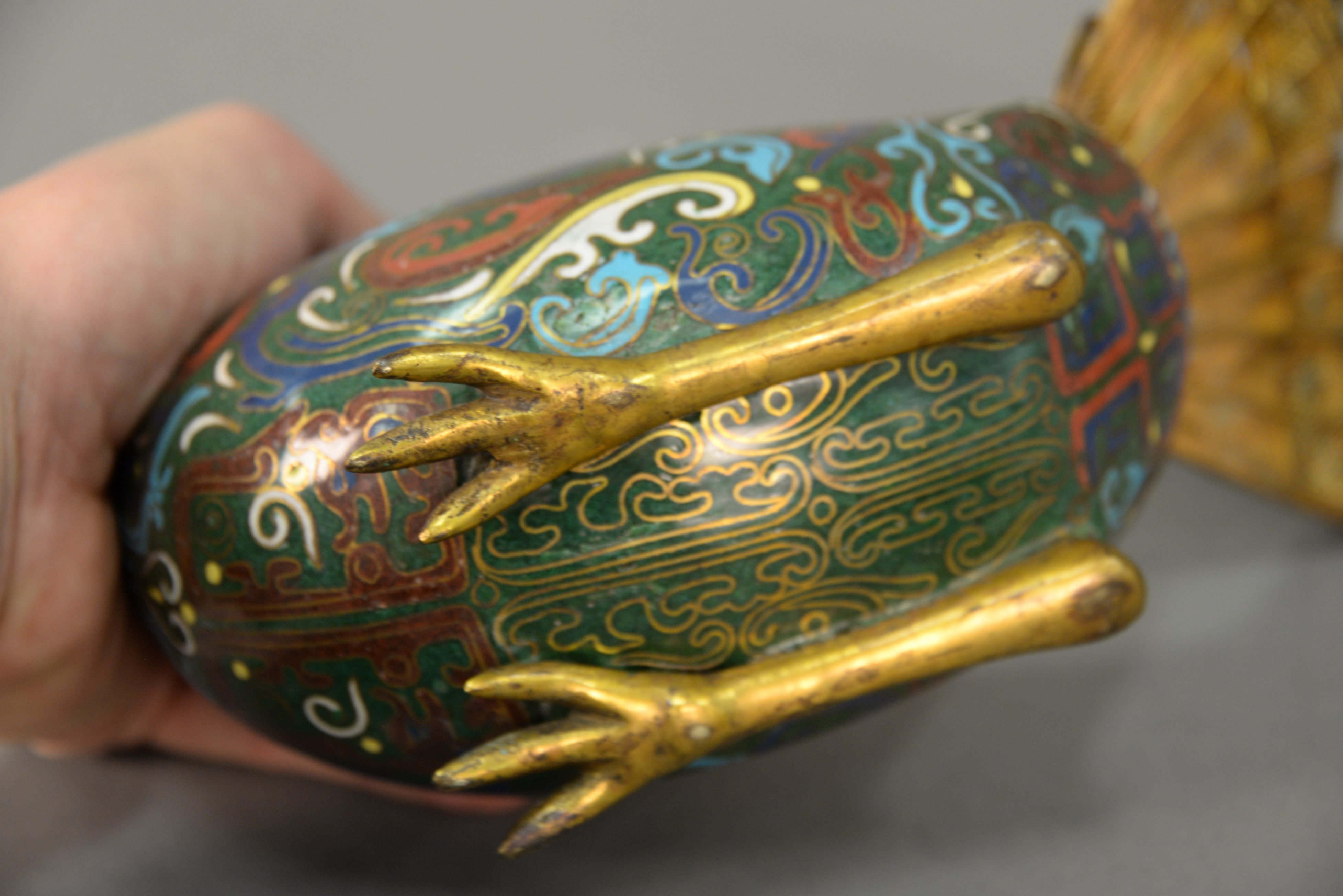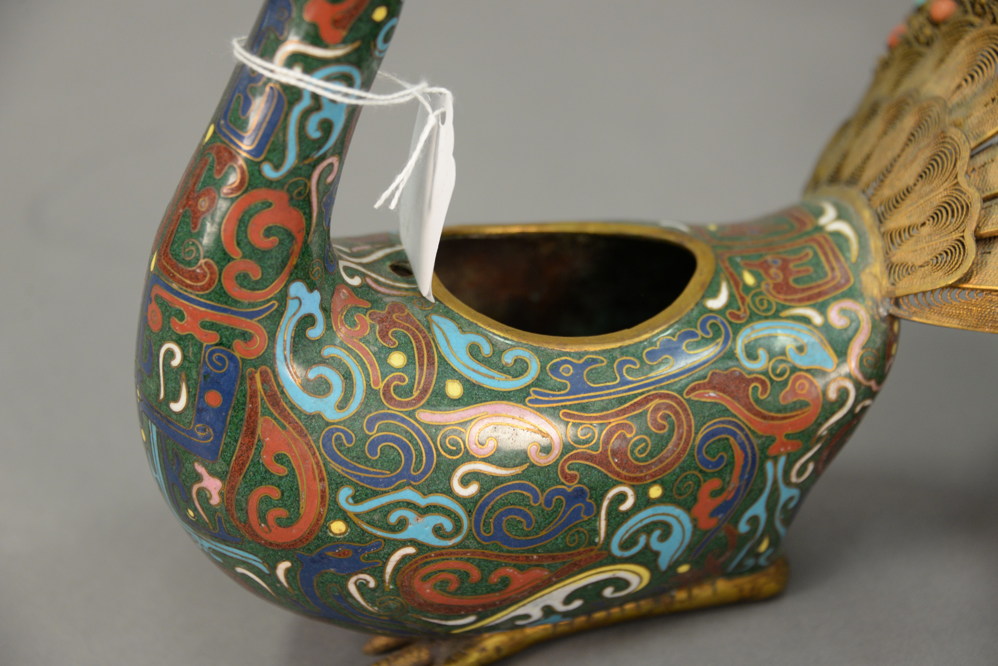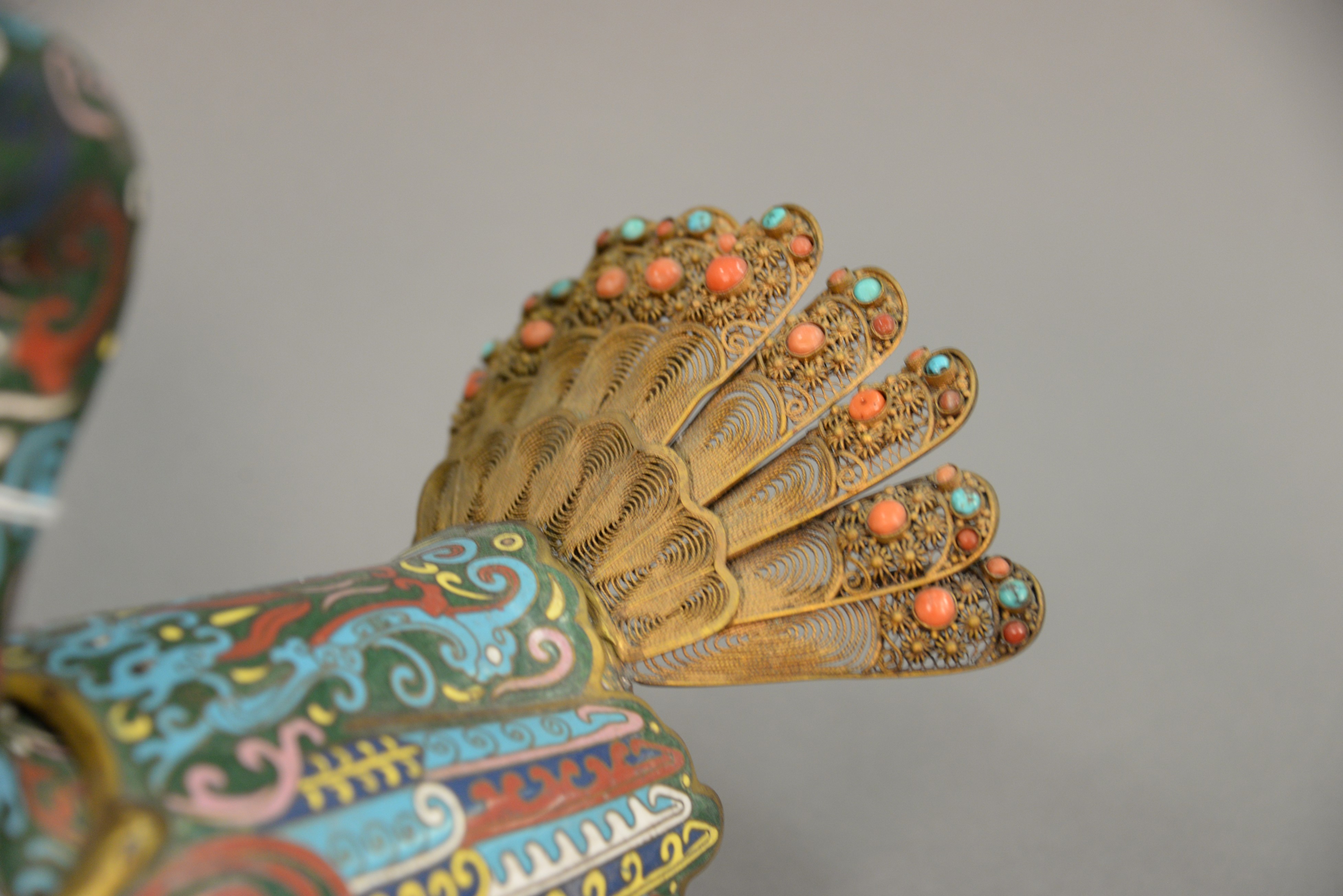 Lot 42: Pair of cloisonne enameled covered bird boxes having filligree and stone tail feathers. ht. 8 1/2 in. lg. 10 1/2 in.