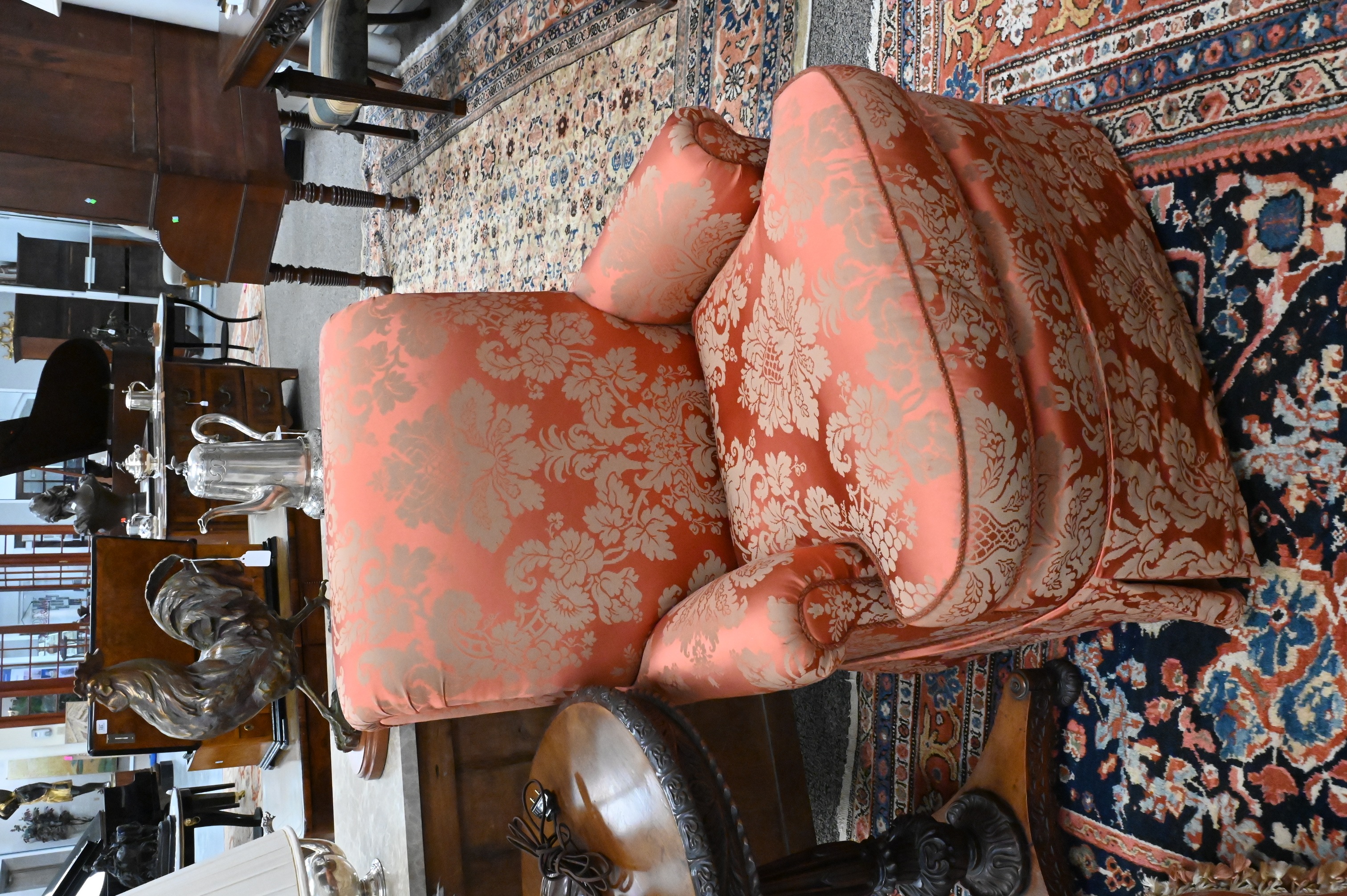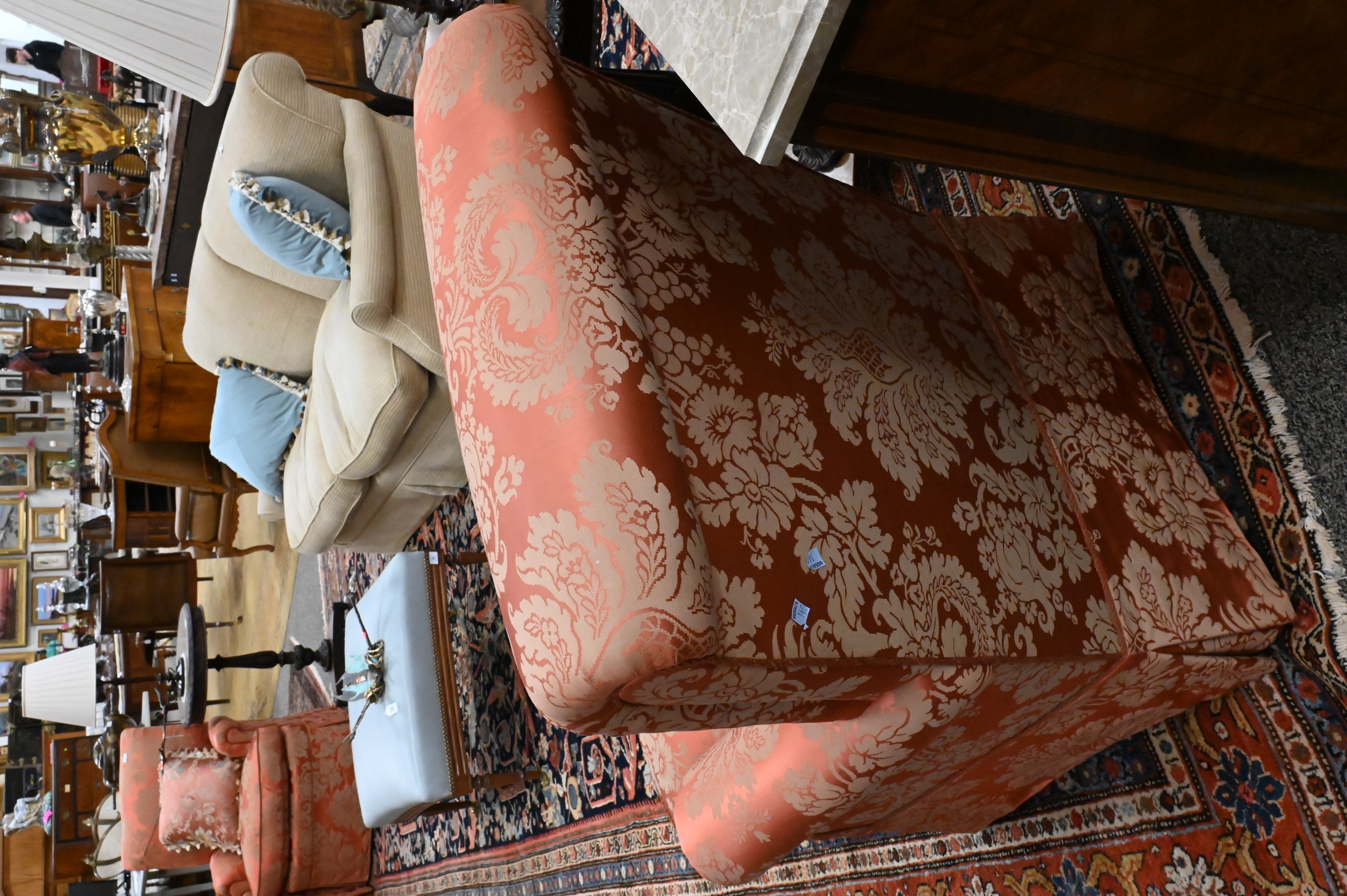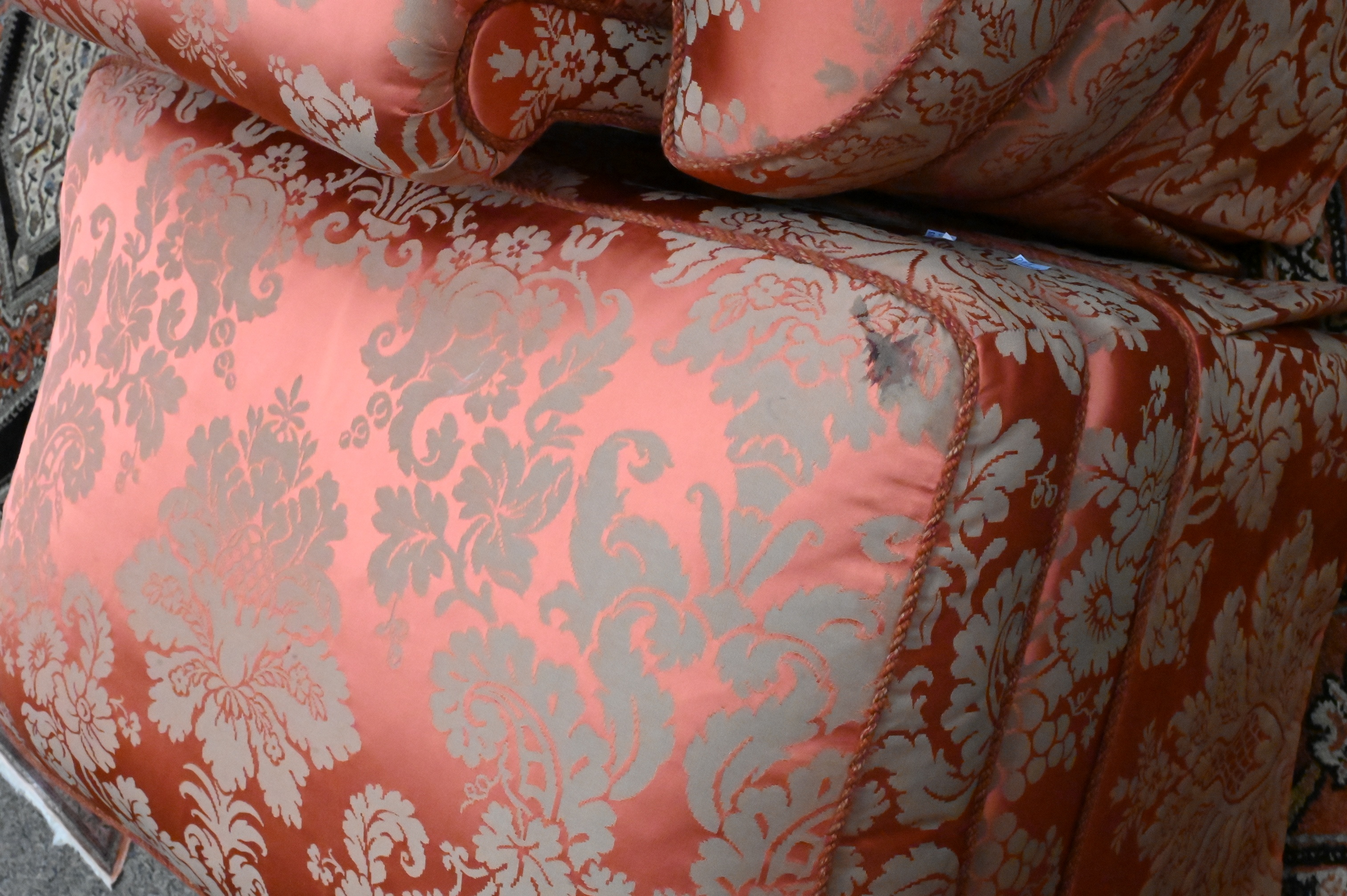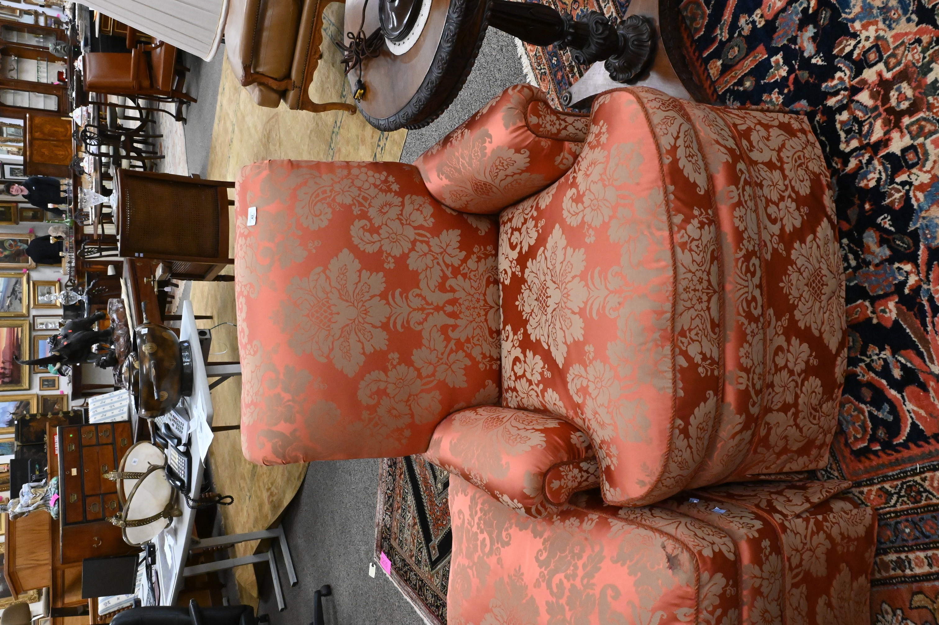 pair of traditional rolled-arm club chairs and a matching ottoman, all upholstered in coral and gold damask fabric, each chair with a coordinating tasseled accent pillow, comfortable, tailored forms with skirted bases