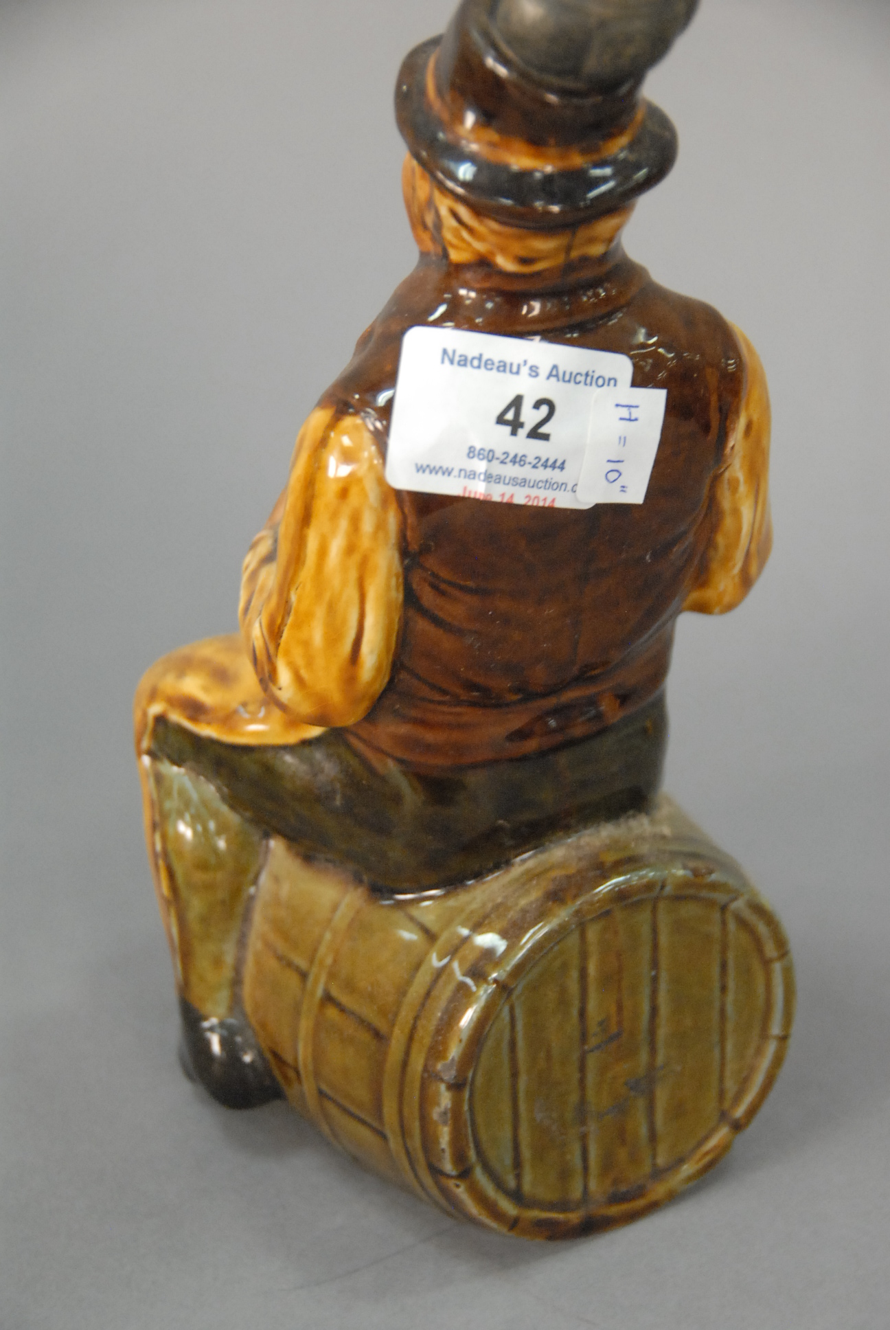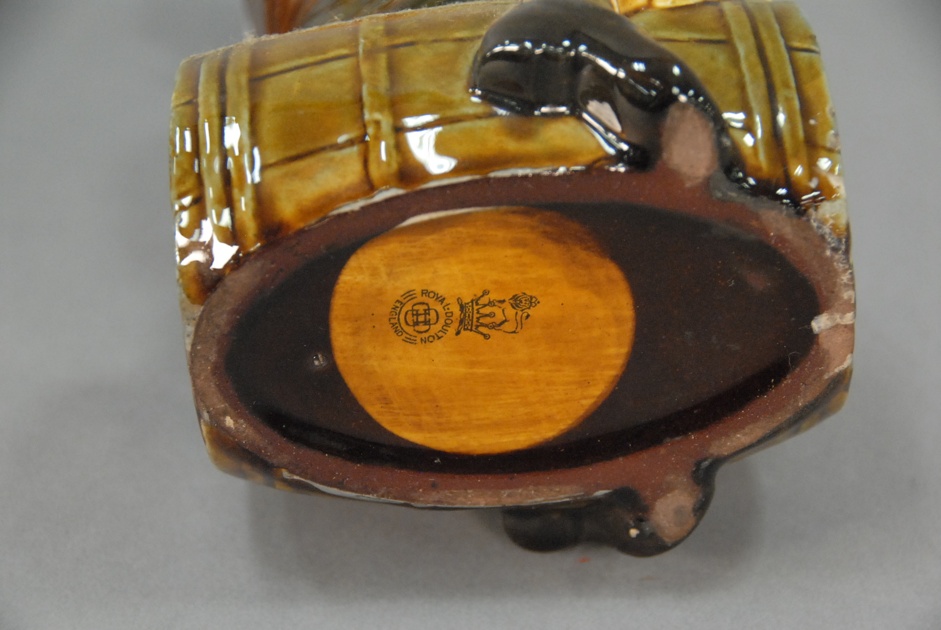 Lot 42: Royal Doulton Kingsware figural flask of man on barrel with original stopper God of Wine, ht. 10in.