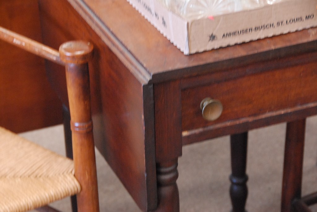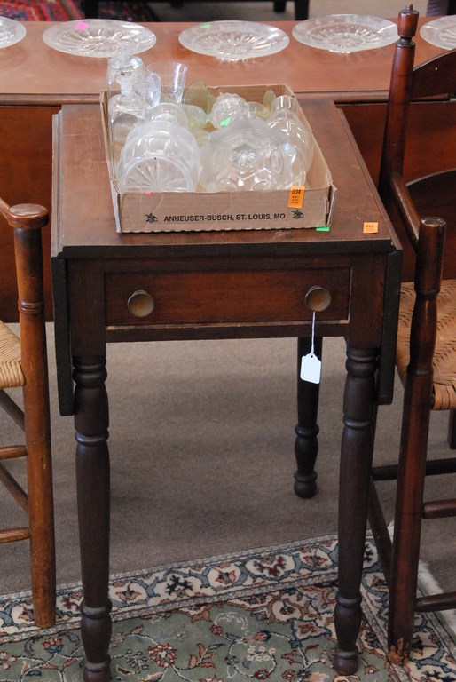 Lot 42: Sheraton cherry drop leaf stand on turned legs with one drawer. Provenance: Brown Family, Windsor, Connecticut