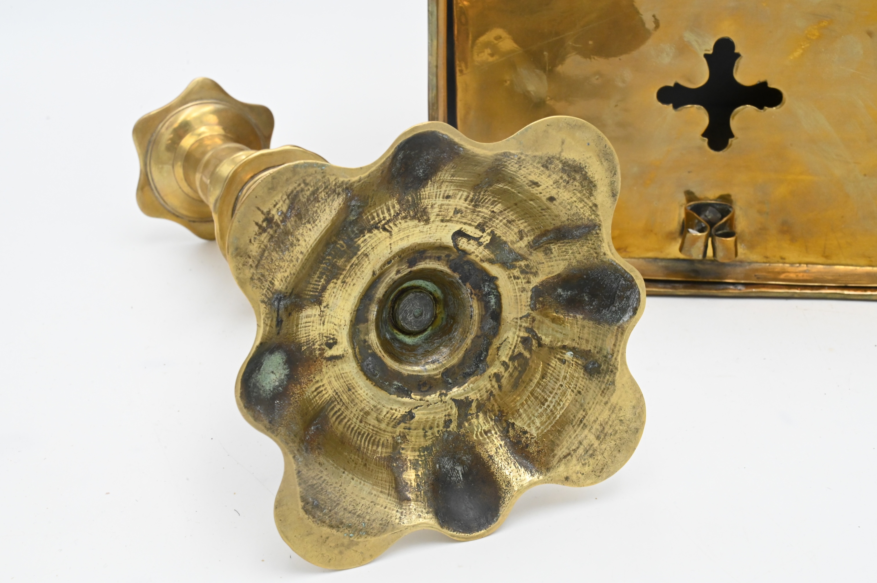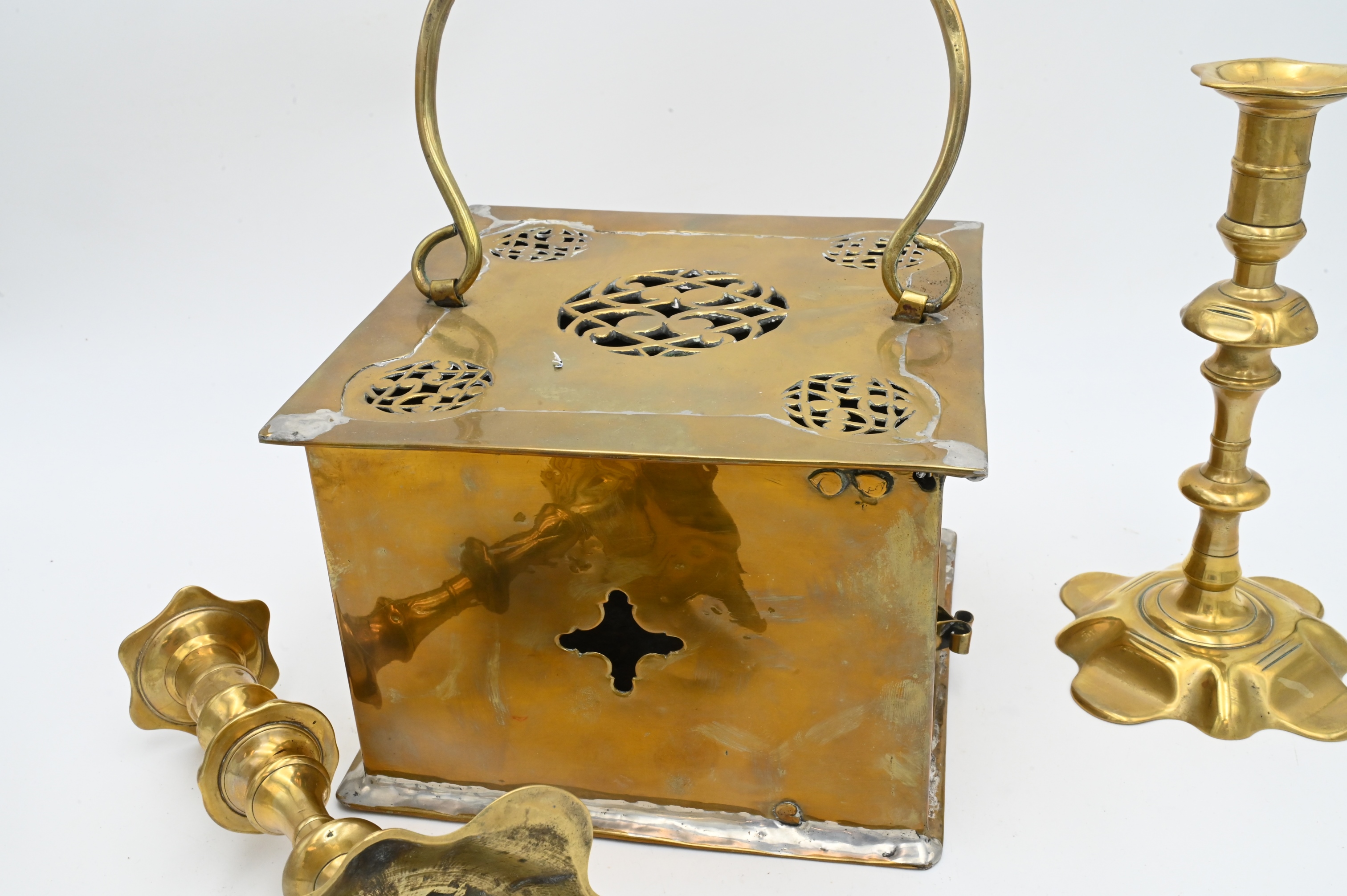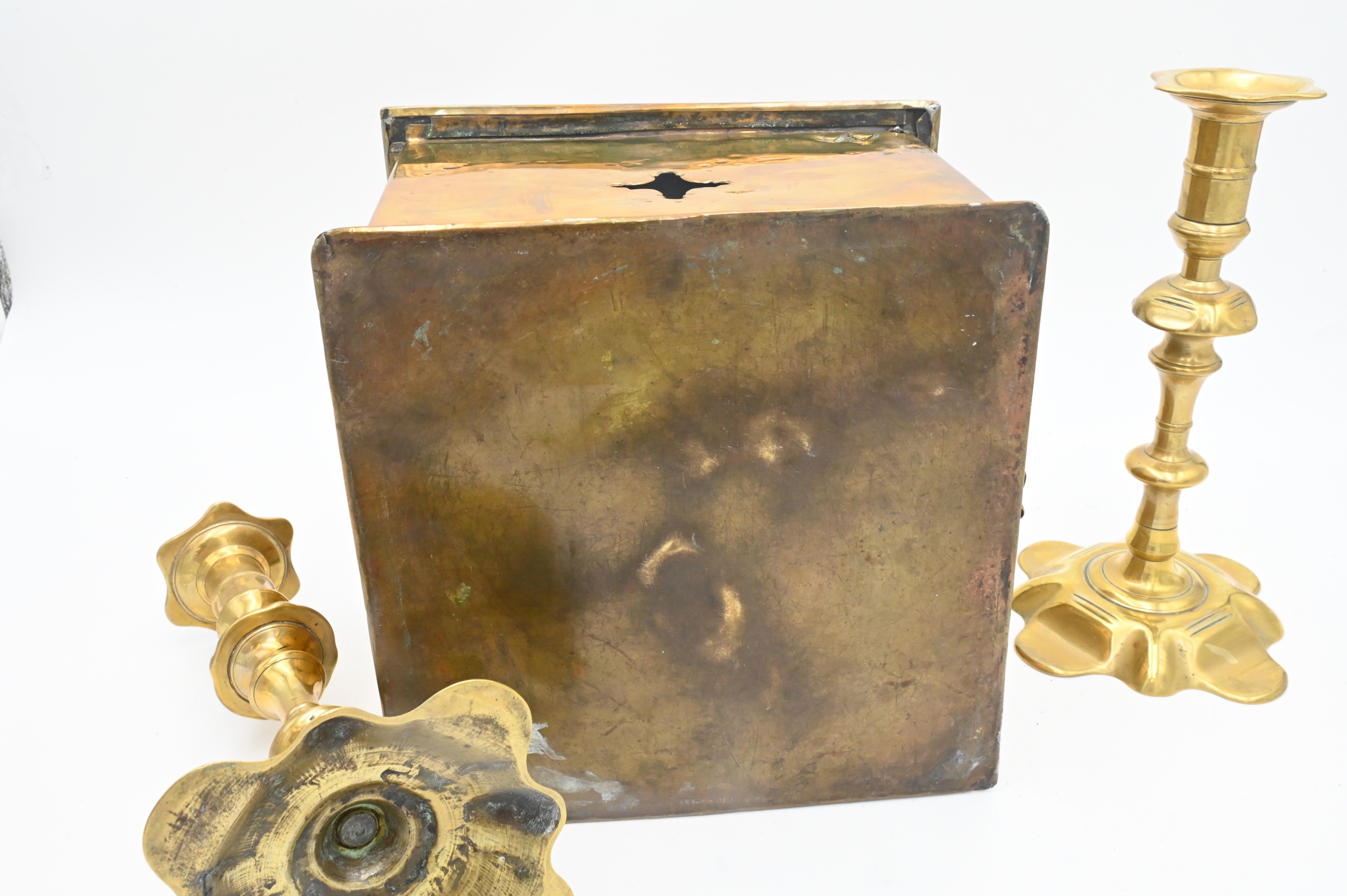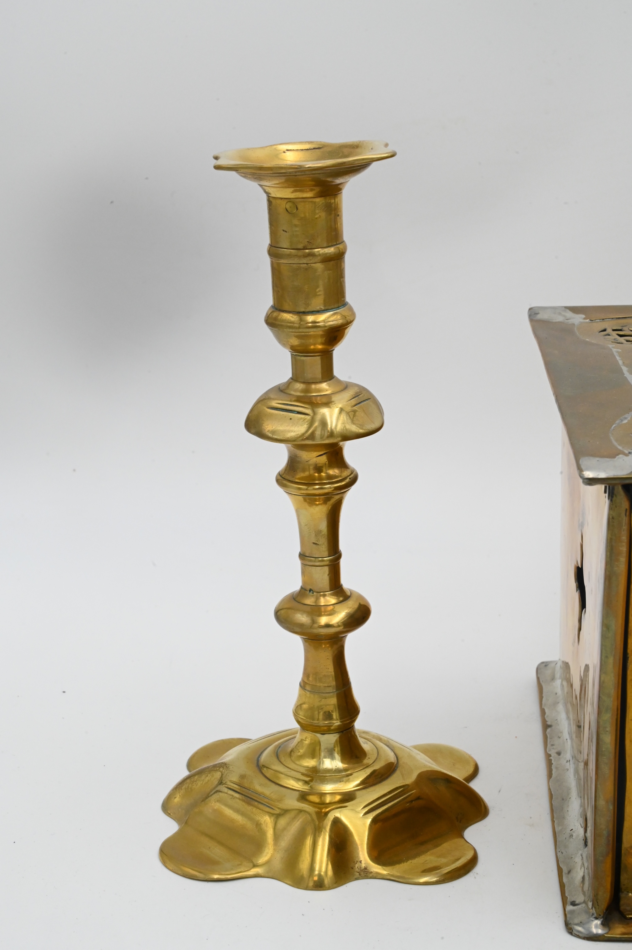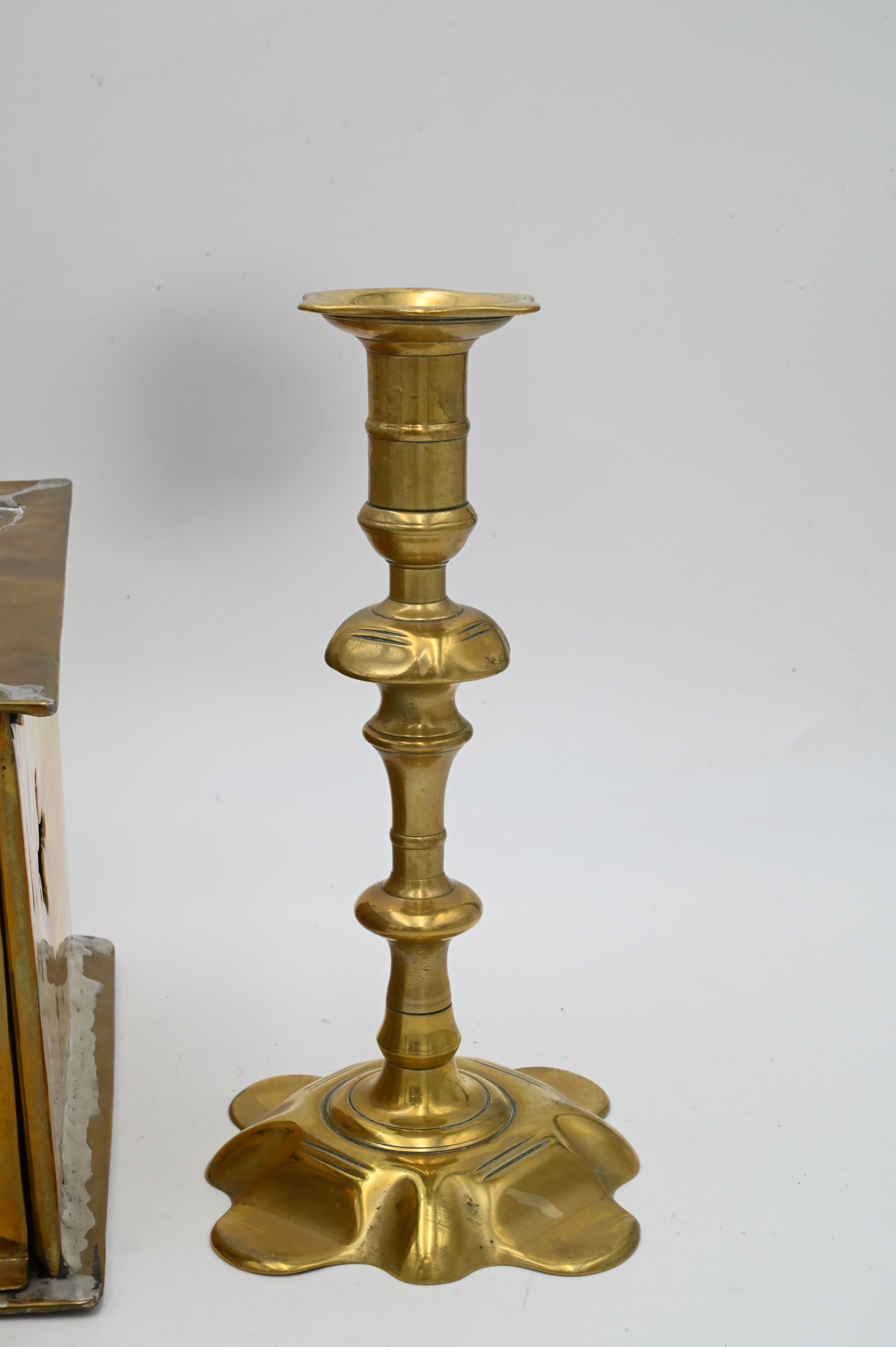 To include a pair of brass Queen Anne candlesticks with petal bases