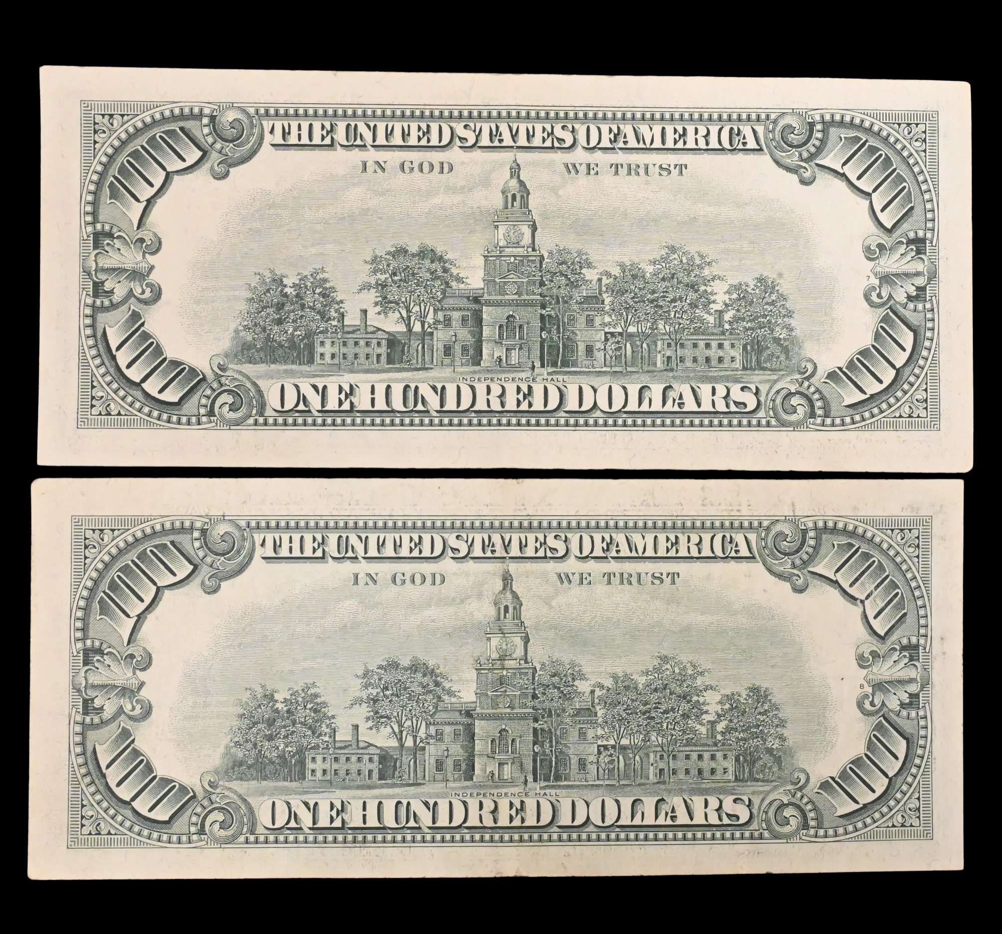 Two U.S. $100 Notes 1966 FR1551 in AU and FR1550 in UNC