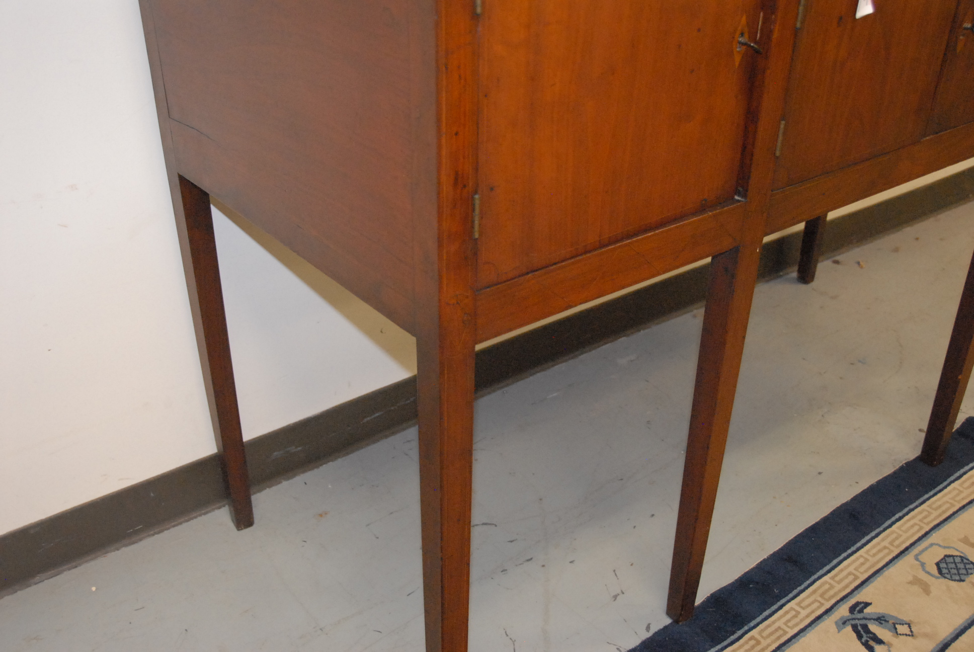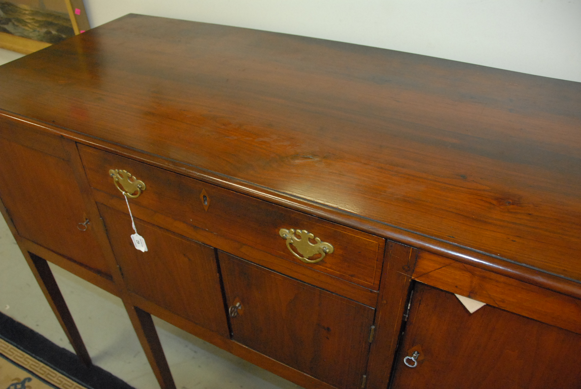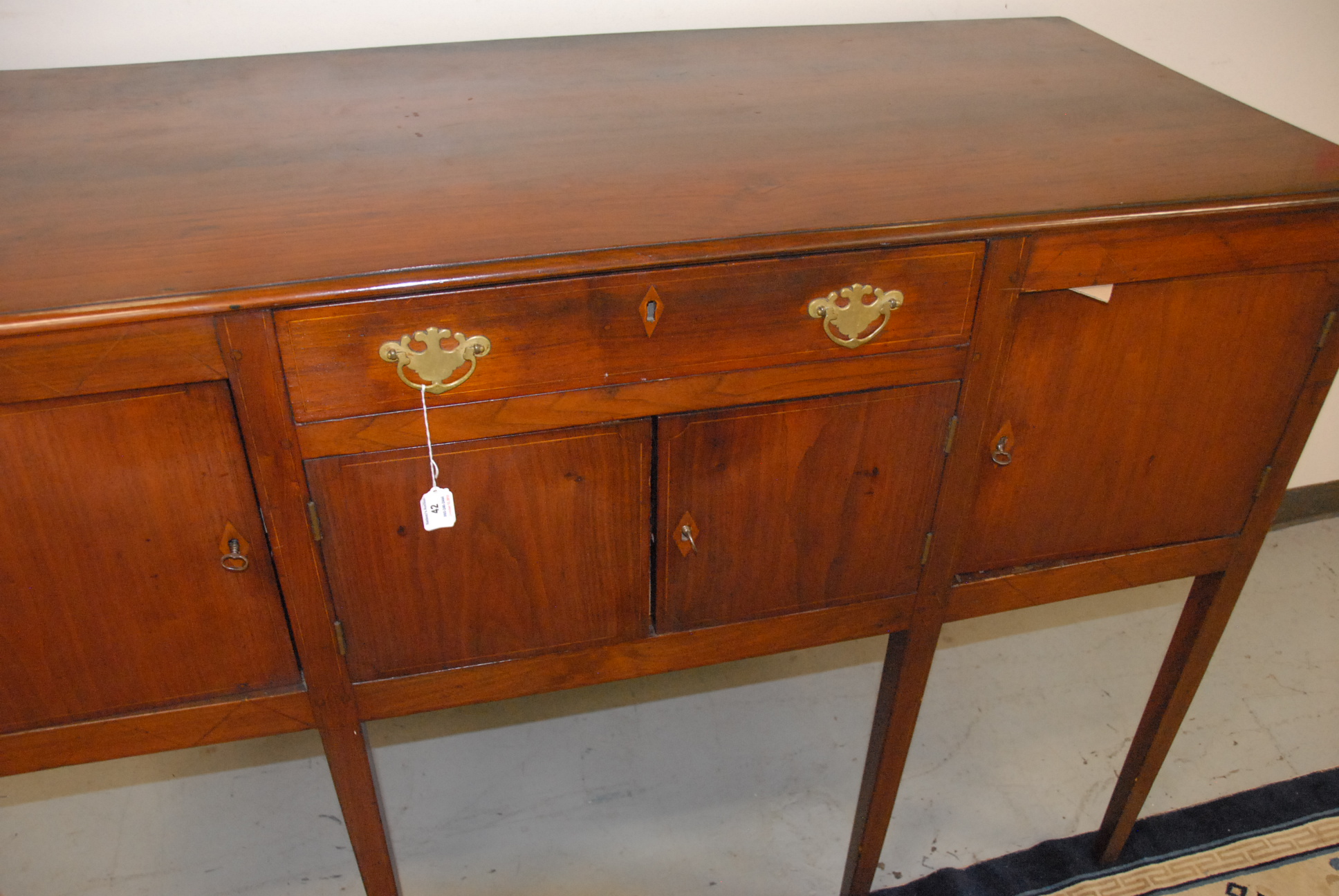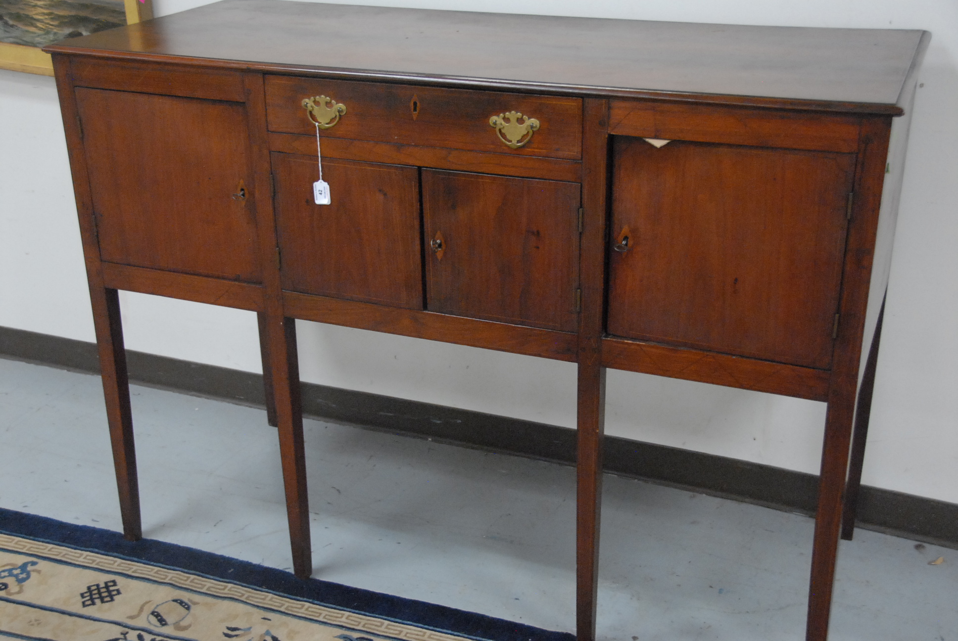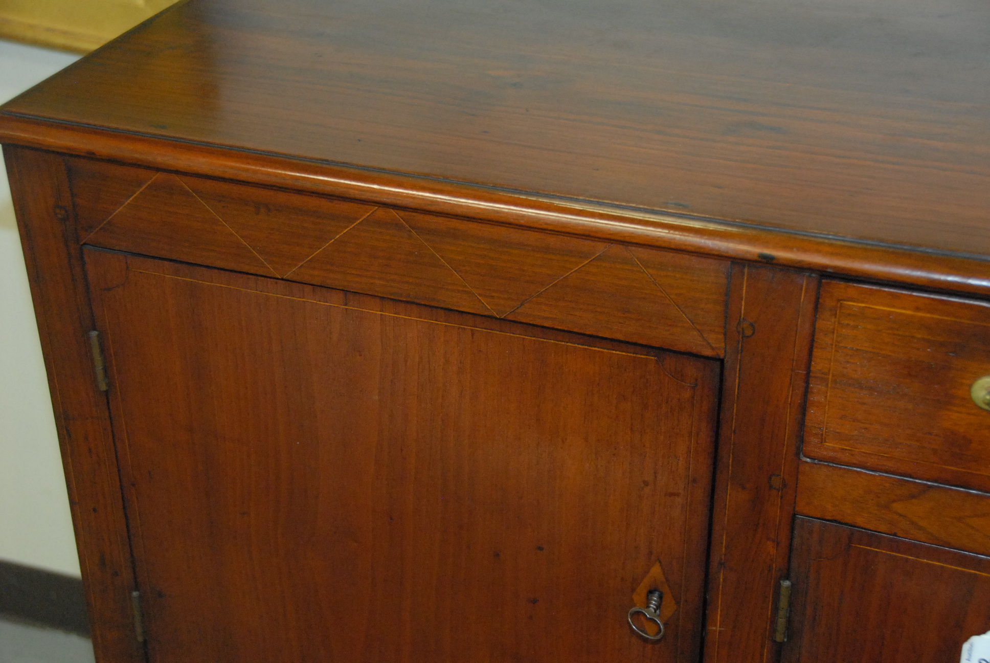 Lot 42: Walnut Federal sideboard having rectangle top over center drawer over two doors flanked by doors all set on square tapered legs, line and diamond shaped inlays, probably Southern, circa 1790-1810. dp. 24 3/4in., lg. 58 1/2in., ht. 42 1/2in.