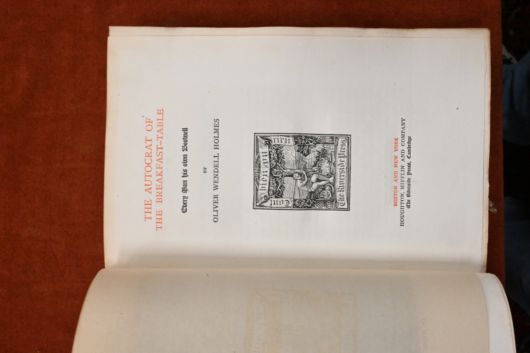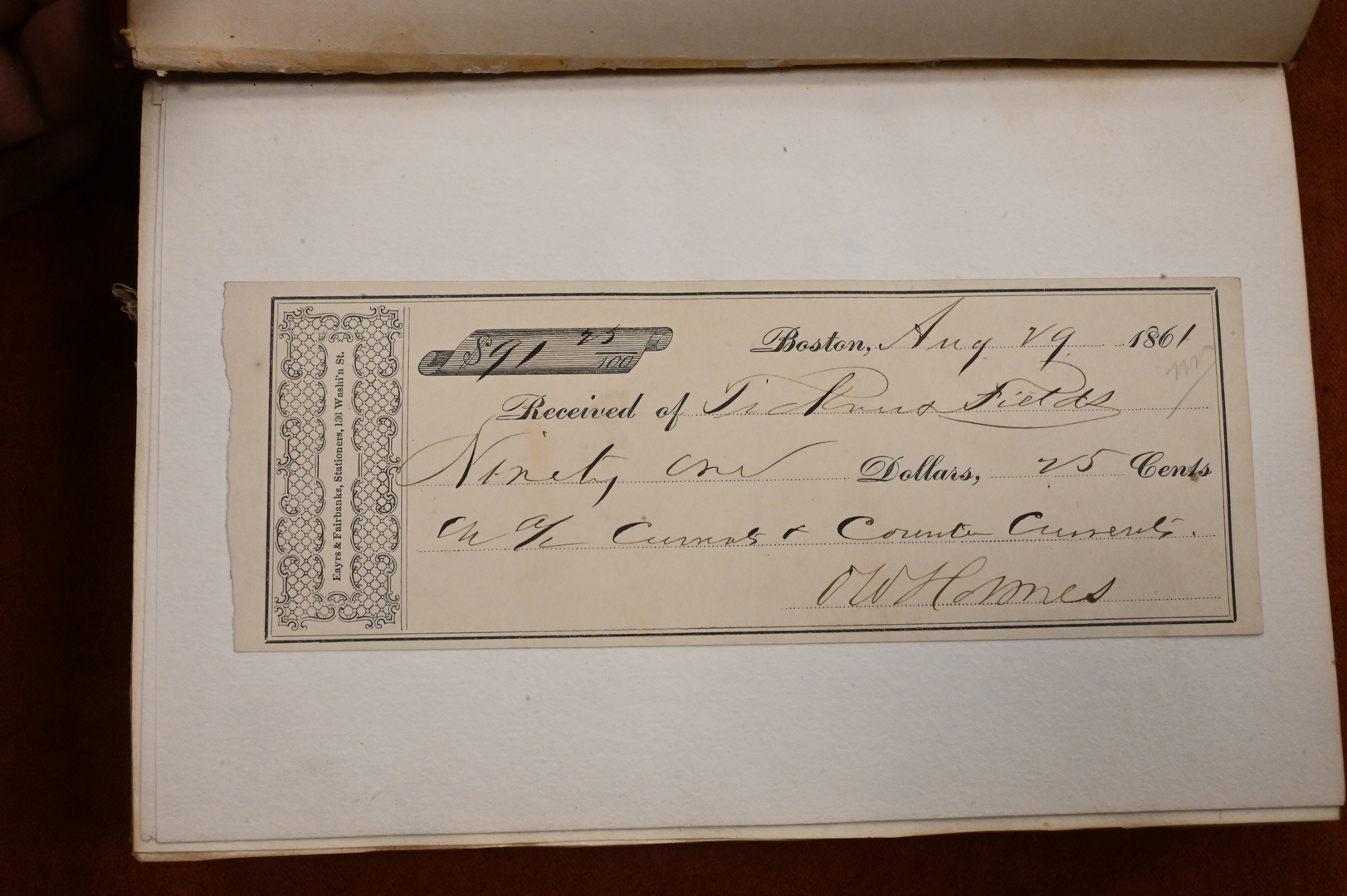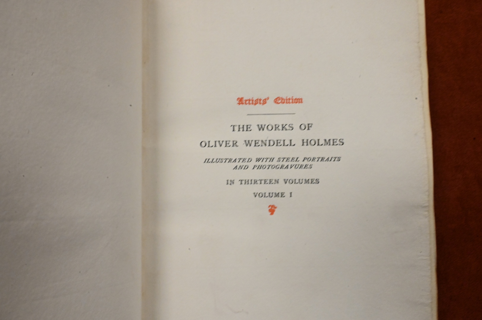 Complete 13 Volume Limited Edition Set of “The Works of Oliver Wendell Holmes”, #437/750, published in 1892, first volume having receipt from 1861, signed by Holmes, Provenance: Estate of Cyril H. Moore Jr, Kent, Connecticut.