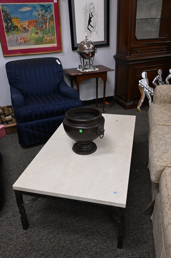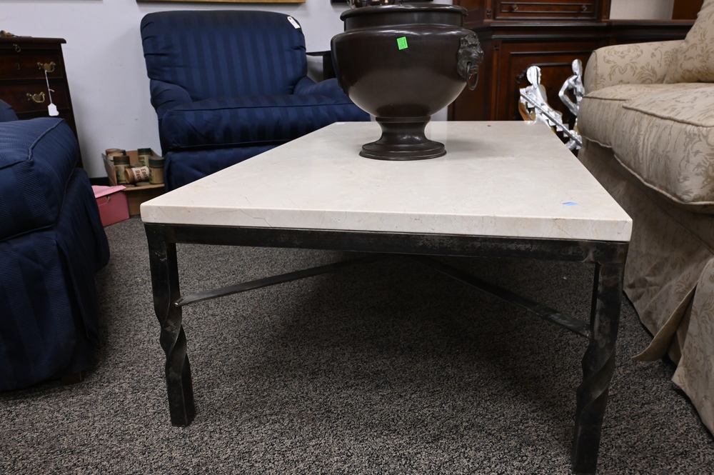 Lot 420: Contemporary Coffee Table, having iron base and marble top, height 16 inches, top 28″ x 48″.