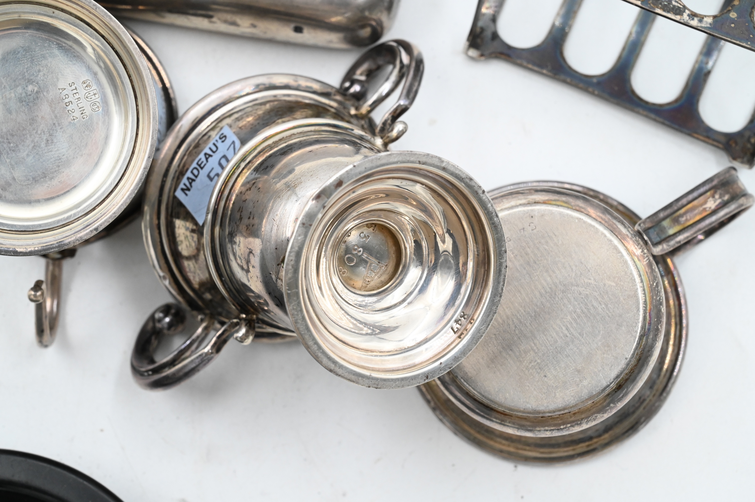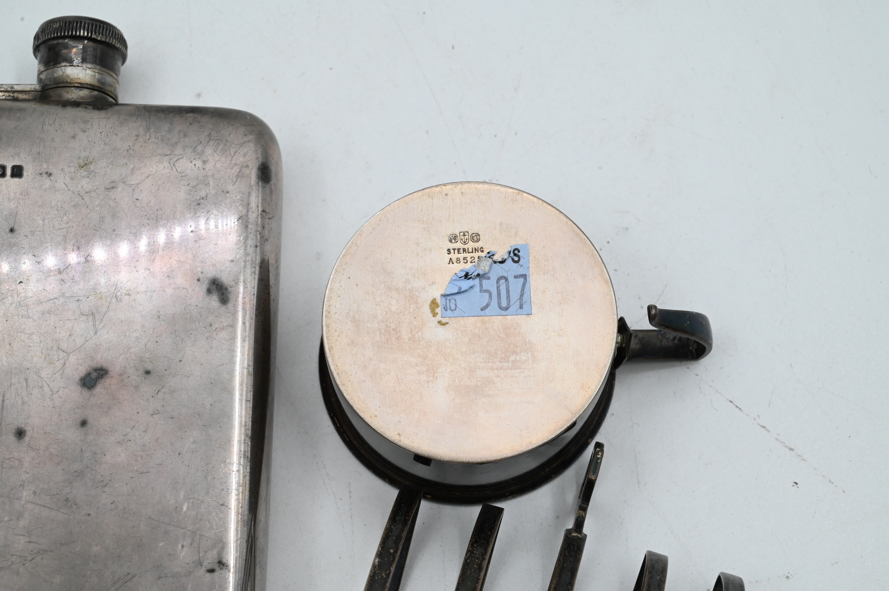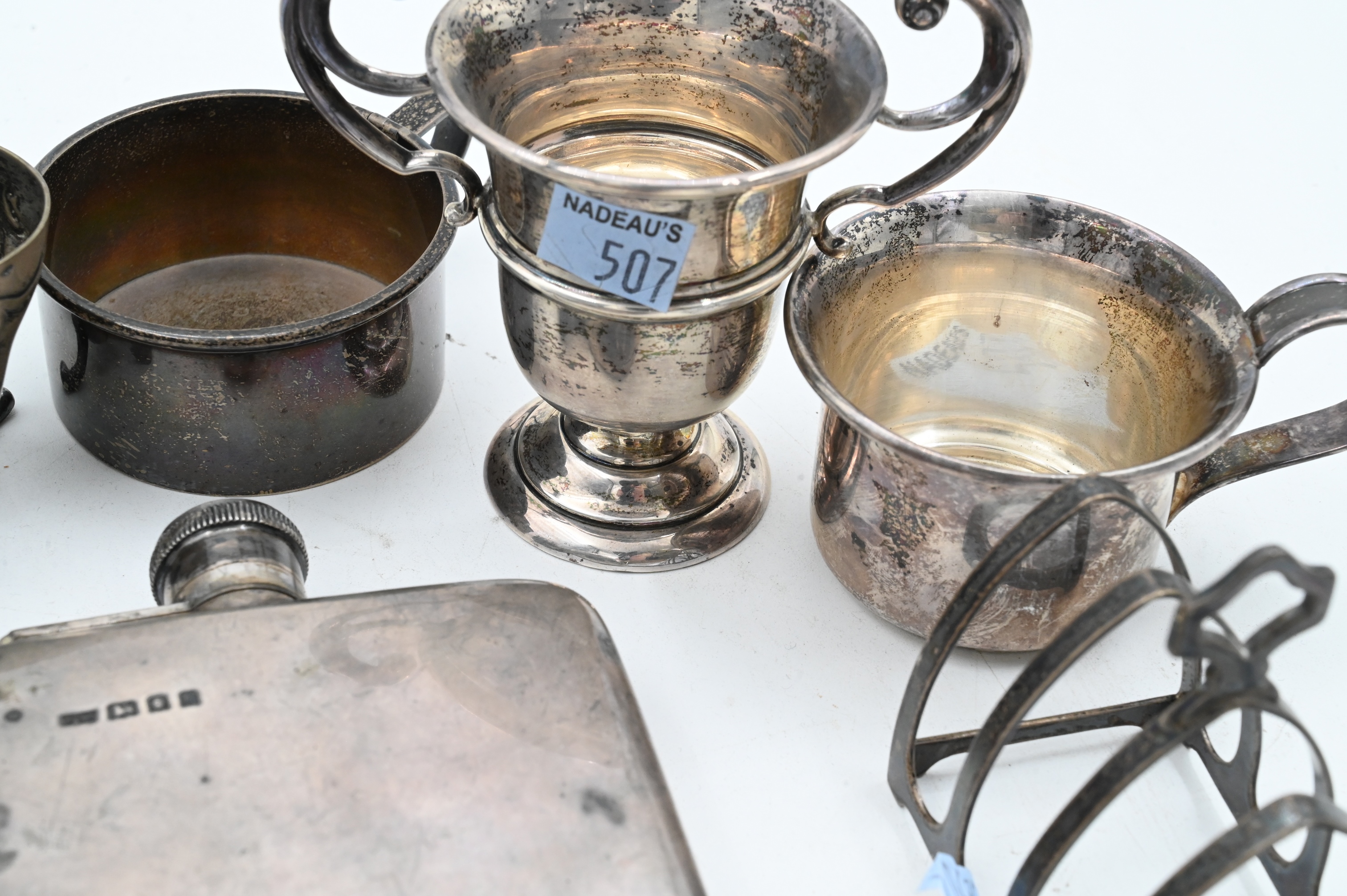 to include sterling flask, three cups, one toast rack, one two handled cup, pair of tongs, and small three footed cup