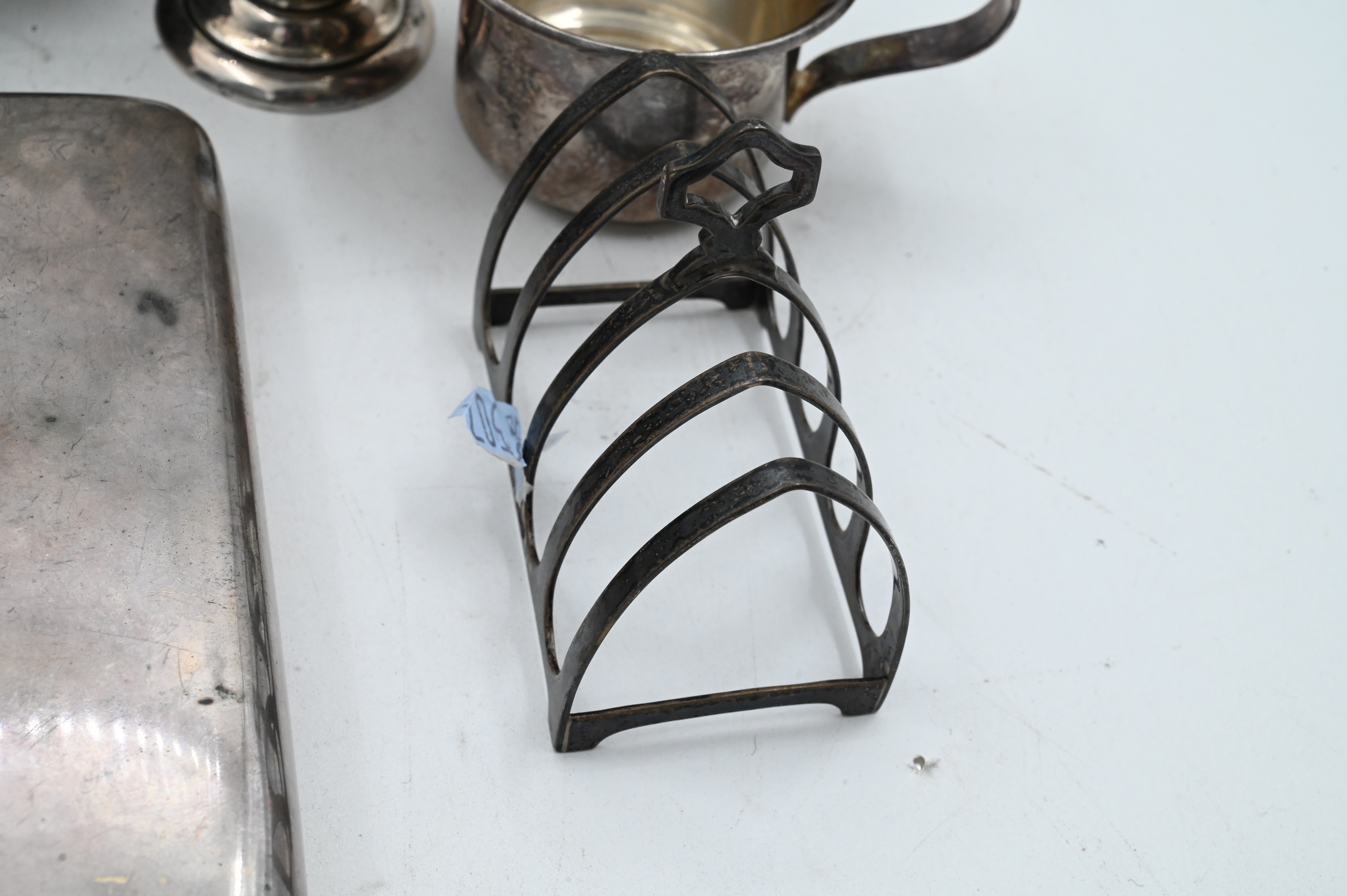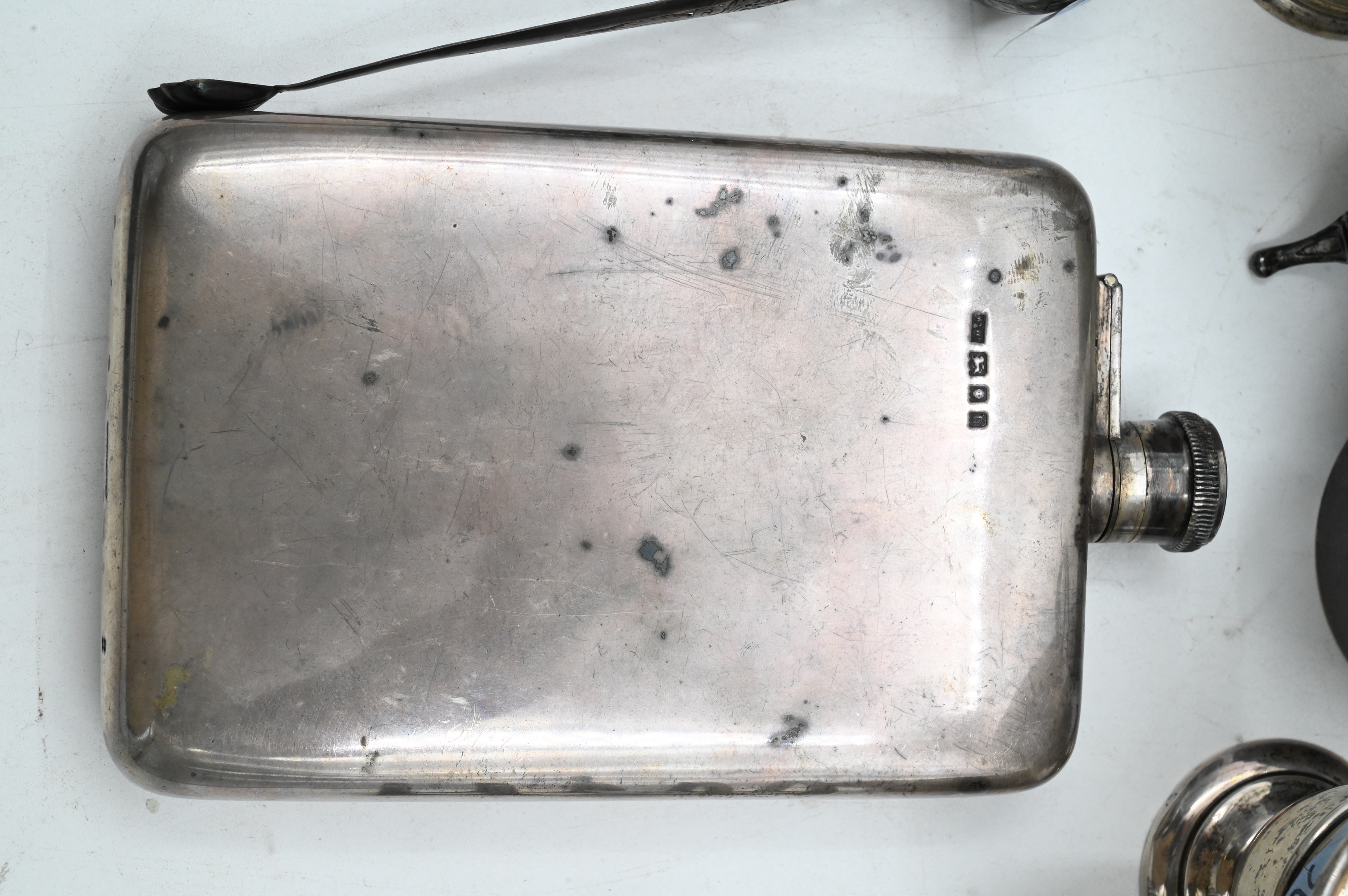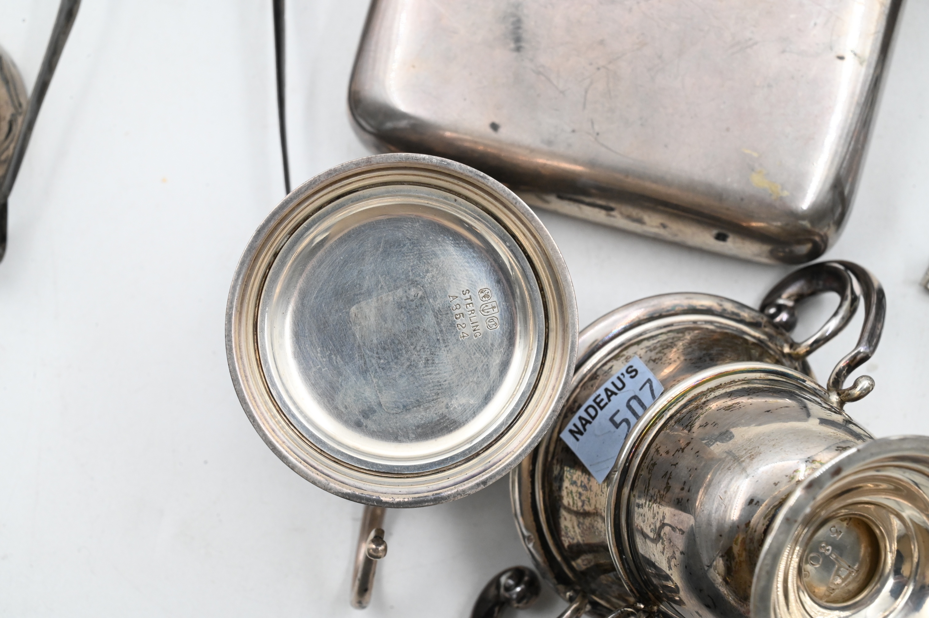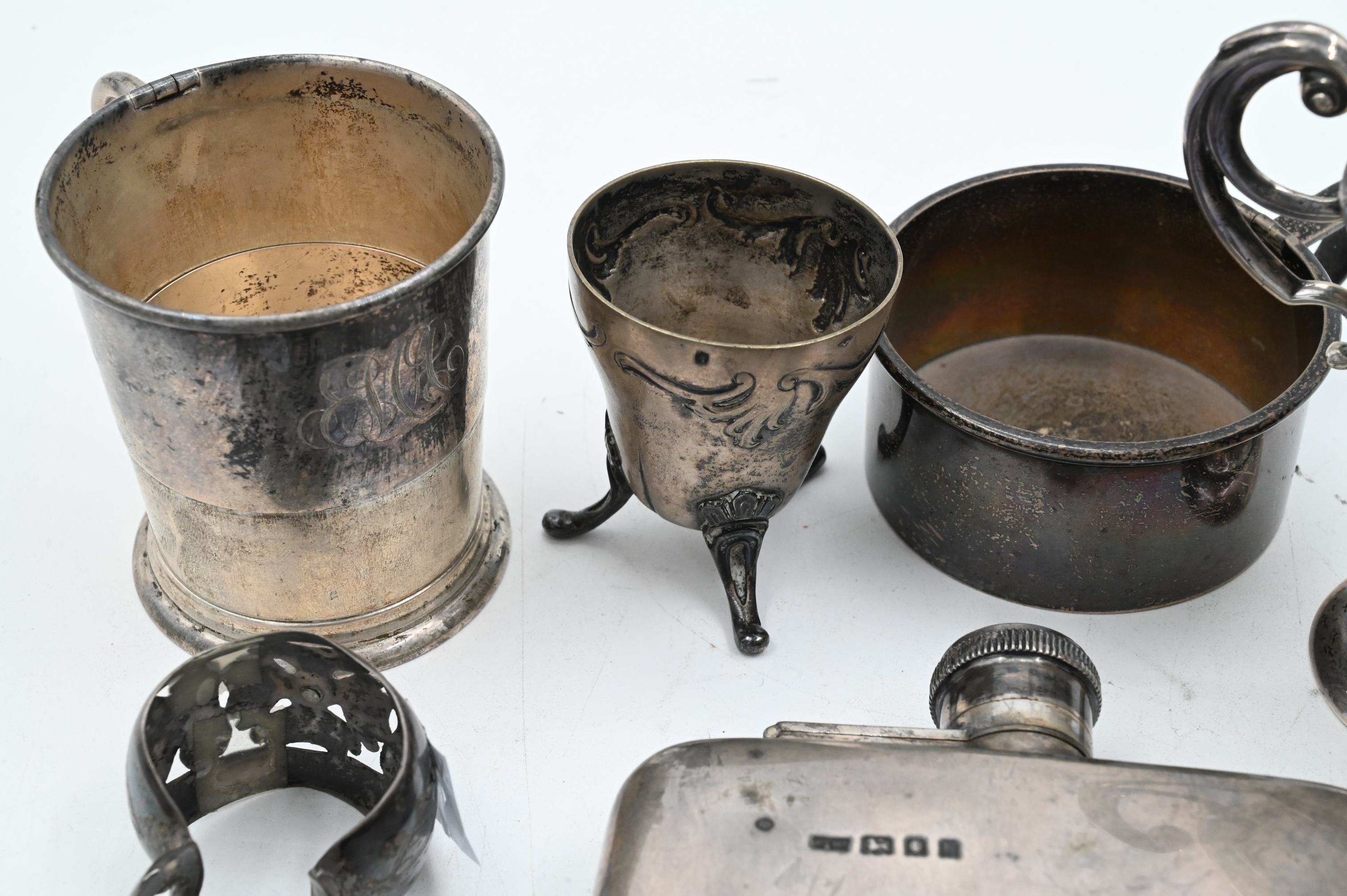 to include sterling flask, three cups, one toast rack, one two handled cup, pair of tongs, and small three footed cup