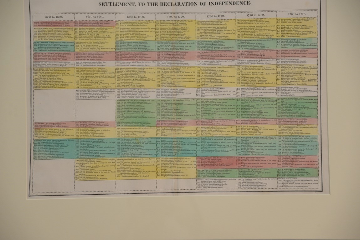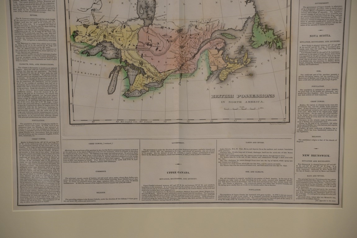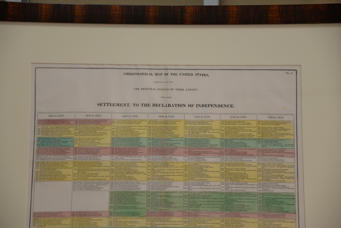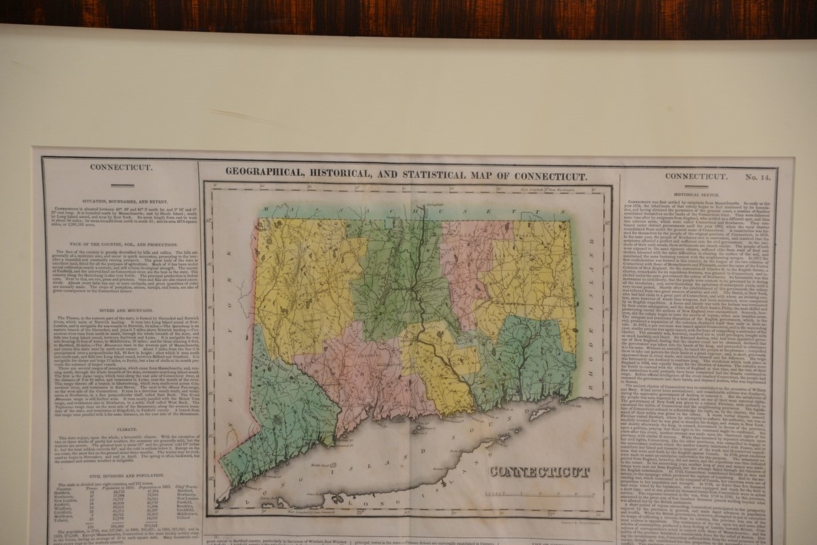 Group of four maps to include Geographical, Historical, and Statistical Maps of Upper and Lower Canada, Maine, and Connecticut Plate #’s 4, 10, & 14 and Chronological Map of The United States Settlement to the Declaration of Independence Plate # 8 hand colored double page engravings having information text in borders engraved by Young & Delleker after F. Lucas published by Henry Charles Carey & Isaac Lea sight size: 17 x 21 1/4 Provenance: Property from Credit Suisse’s Americana Collection