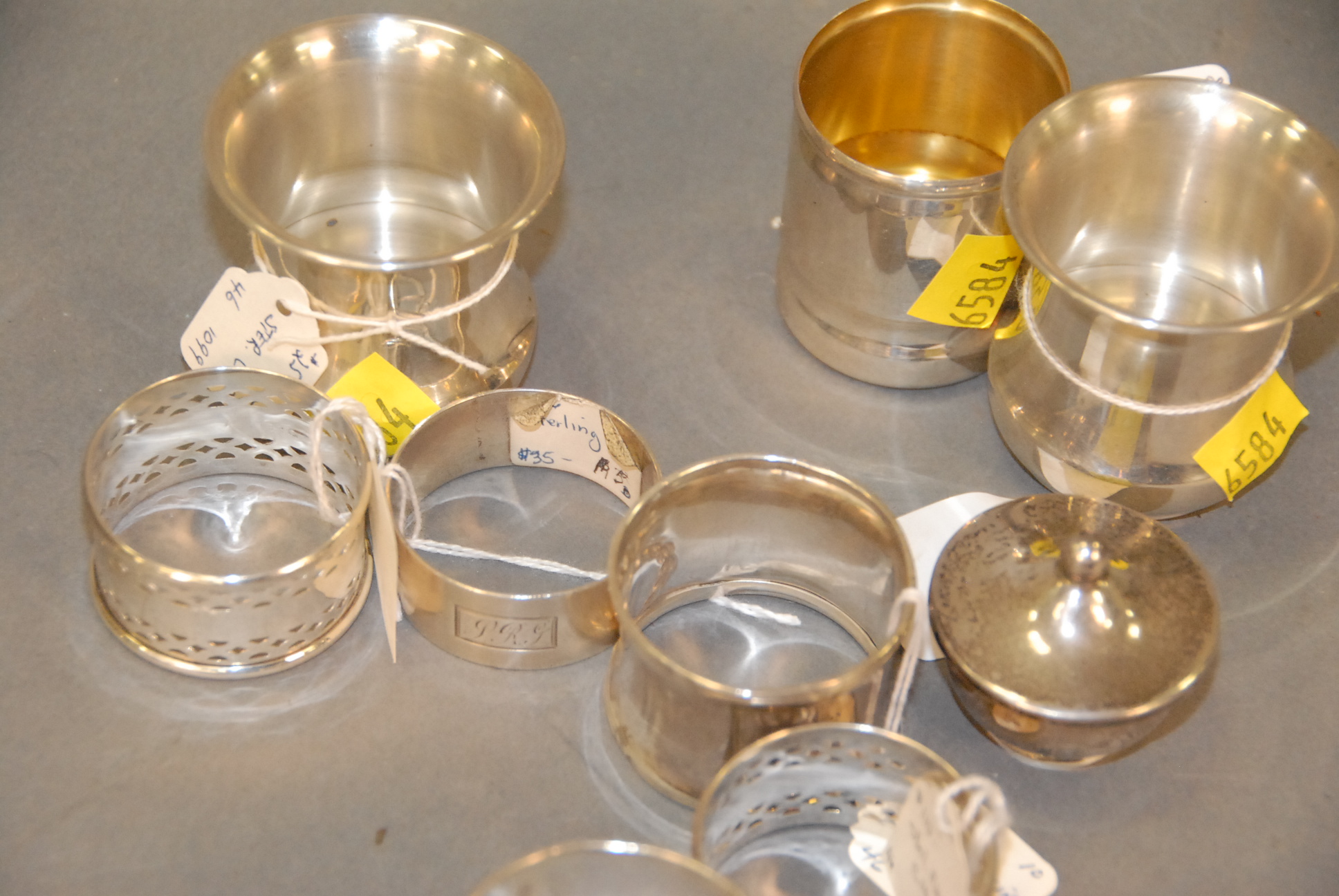 Group of sterling five sterling napkin rings, two sterling cups, jigger, and small salt, 7.3 t oz.