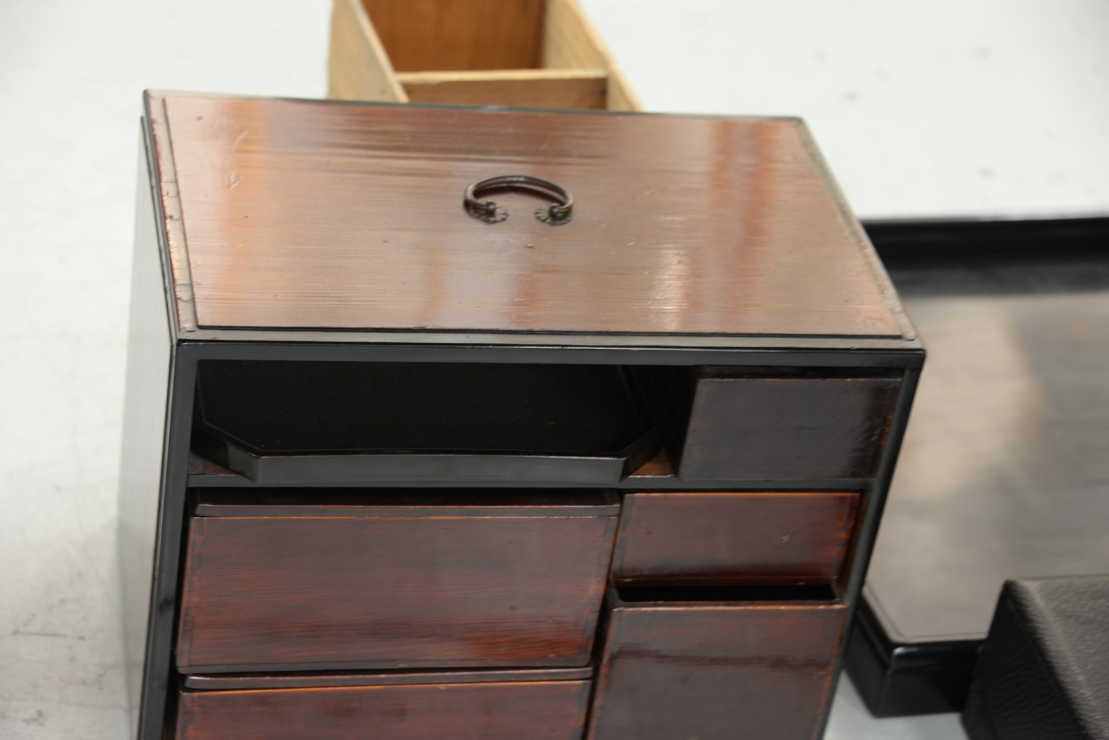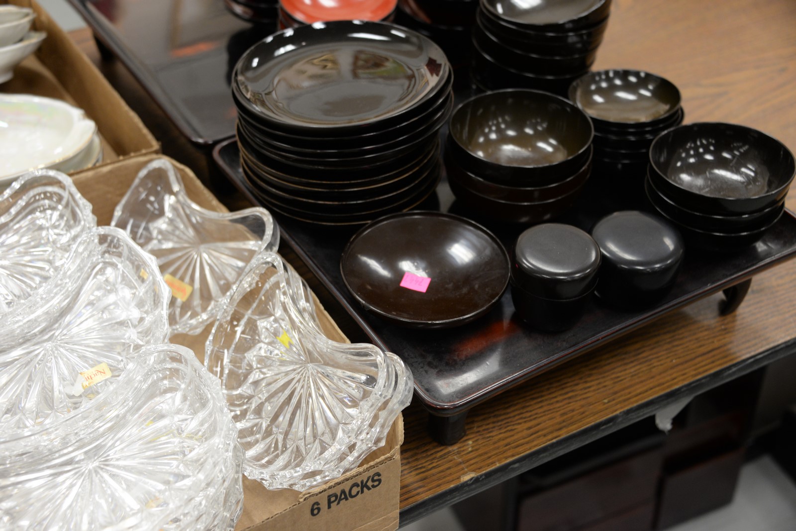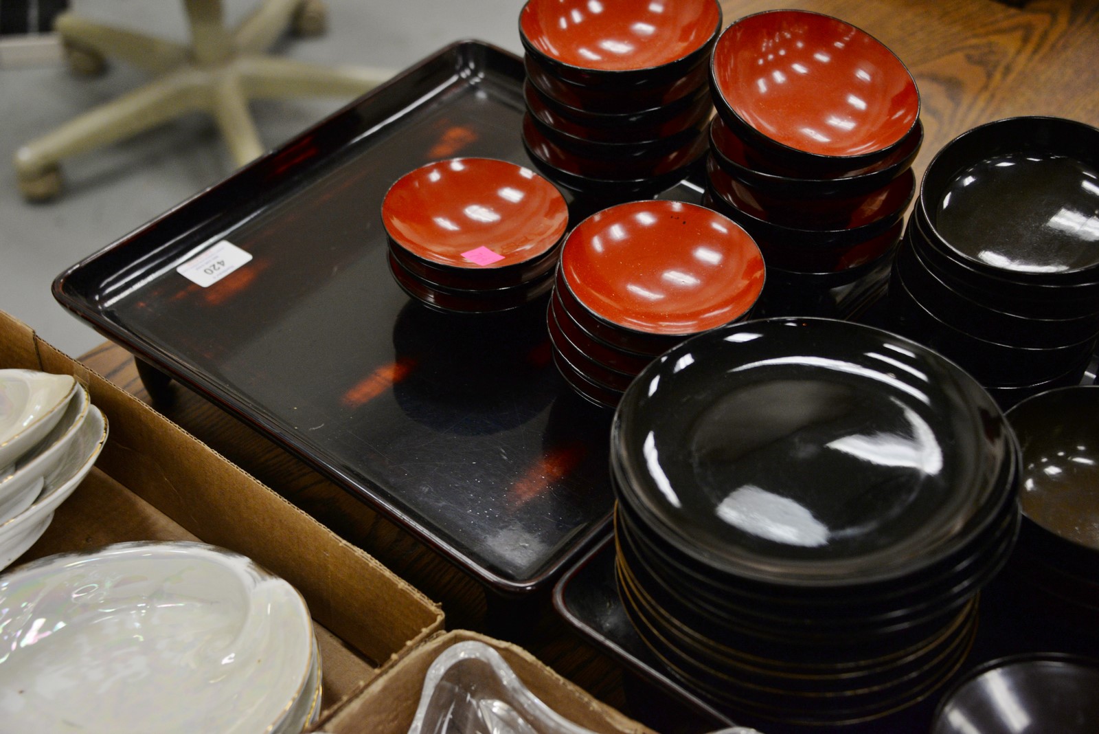 Large lot of Japanese lacquer bowls, plates, trays, box, crystal, dishes, and vases.