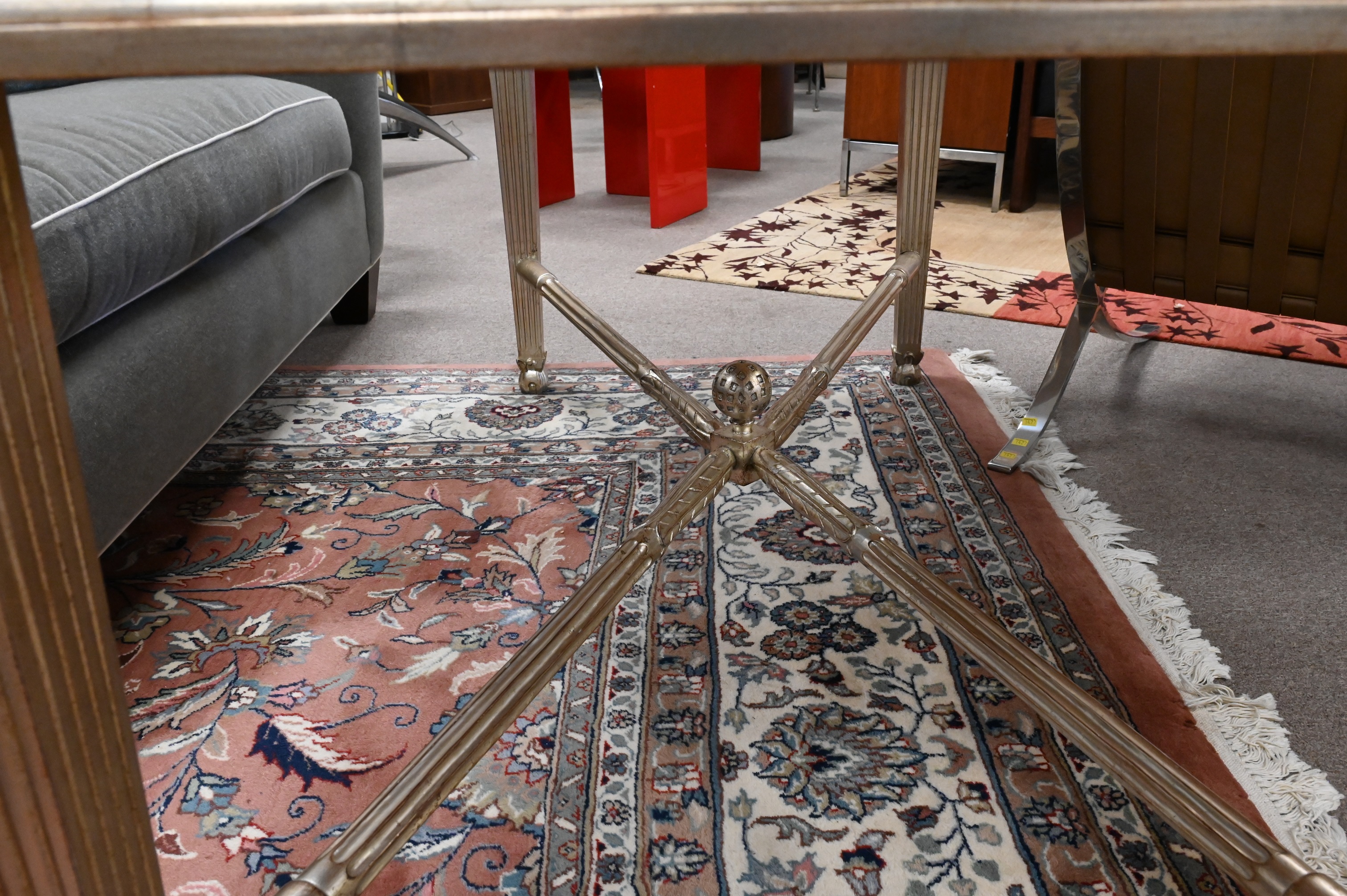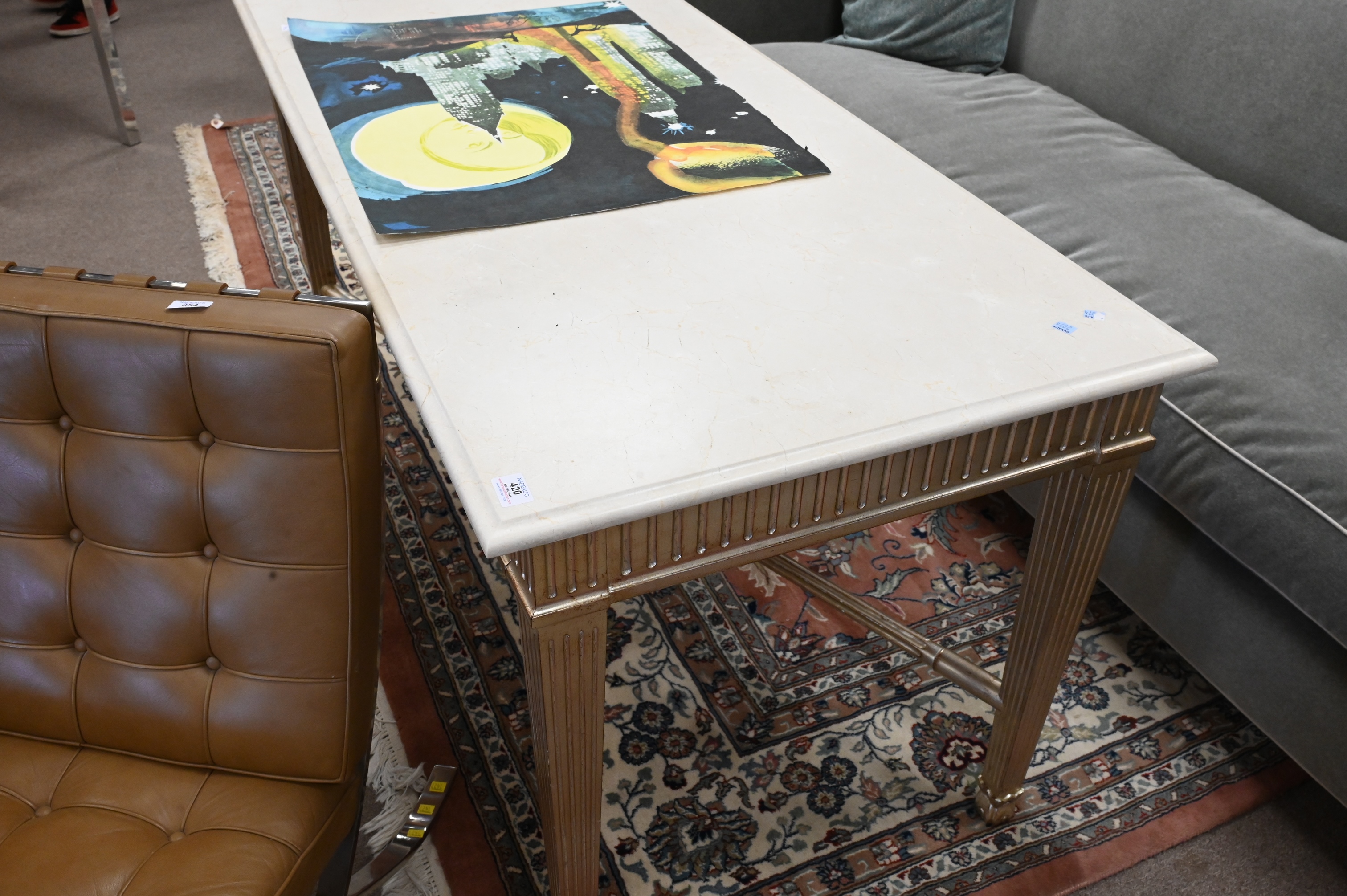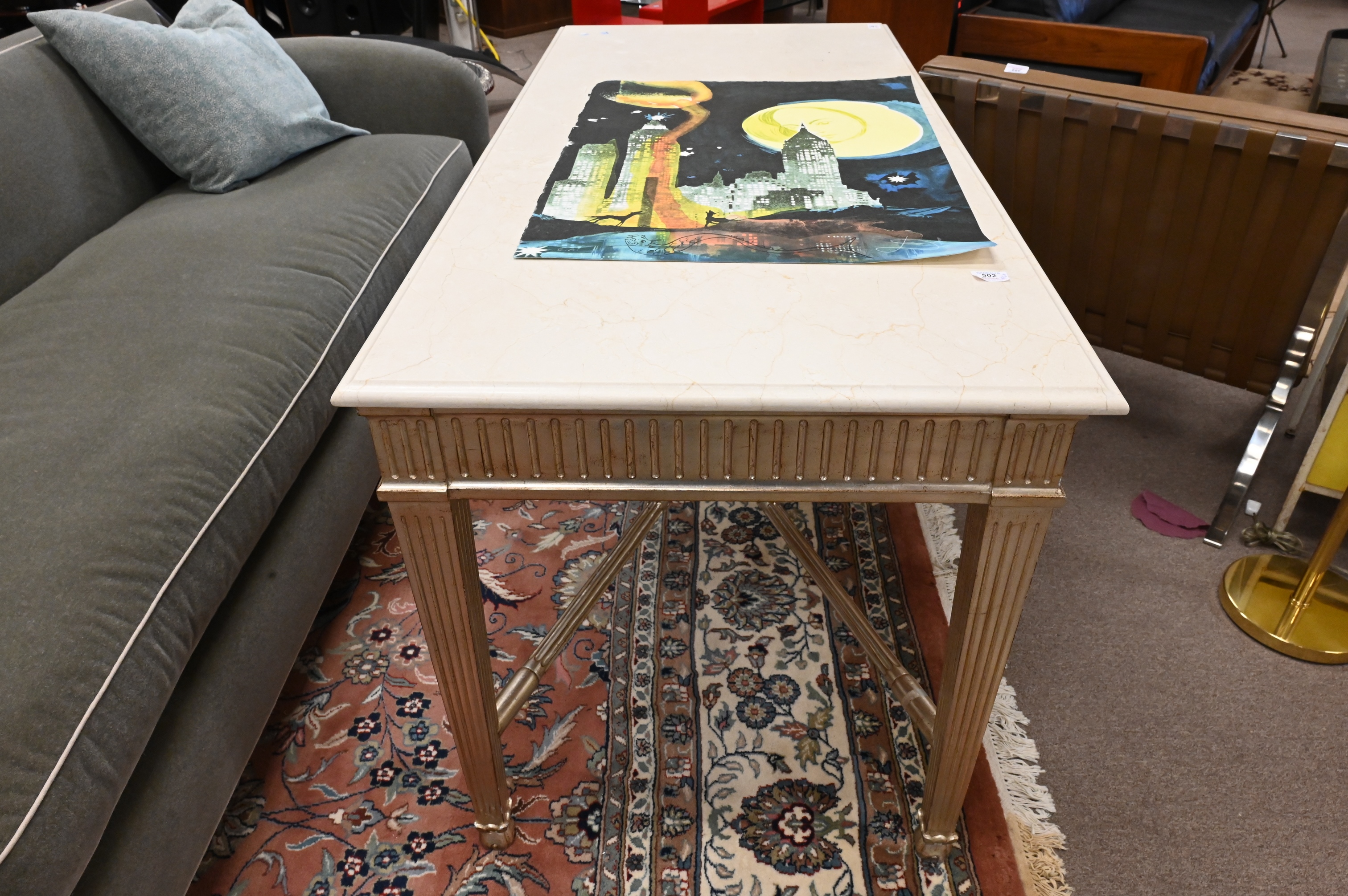 Nancy Corzine Two Drawer Desk, or console table, having silvered gold finish along with rectangular marble top, height 30 inches, top 28″ x 60″.