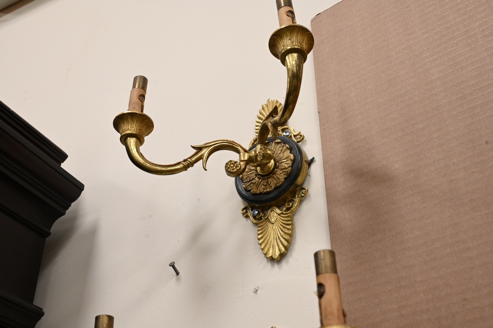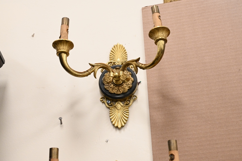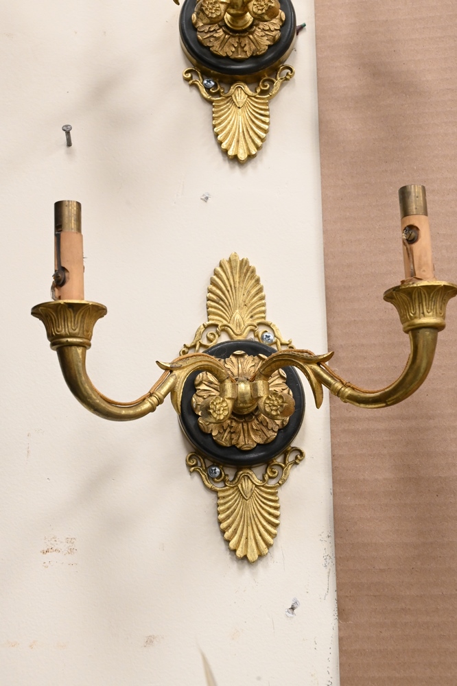 Lot 420: Pair of French Empire Gilt Bronze Wall Sconces, having two arms with acanthus wall plate, height 8 inches, width 9 inches.