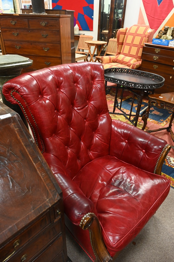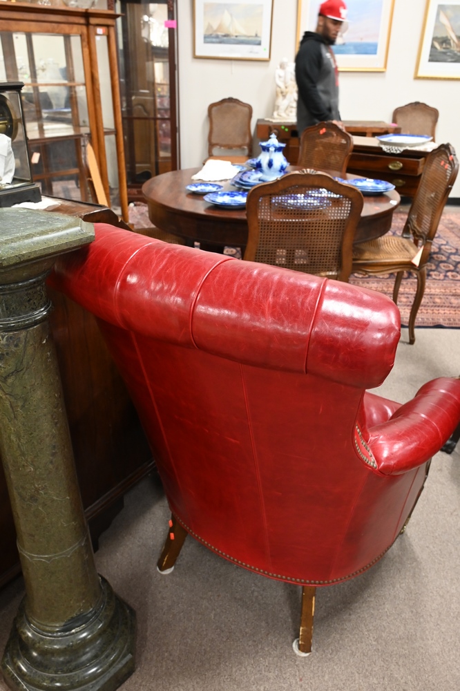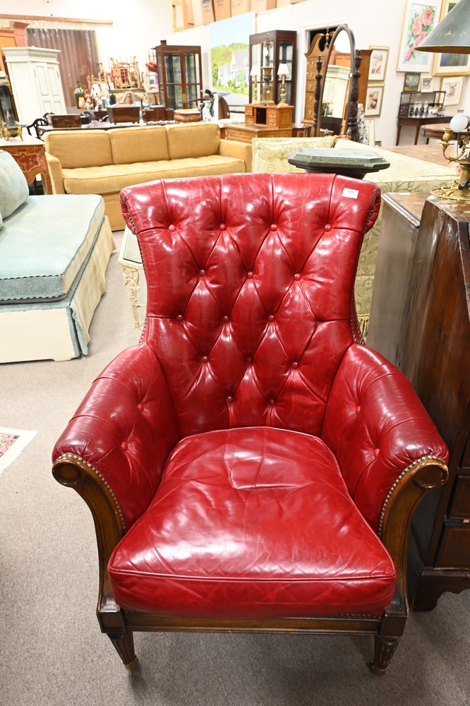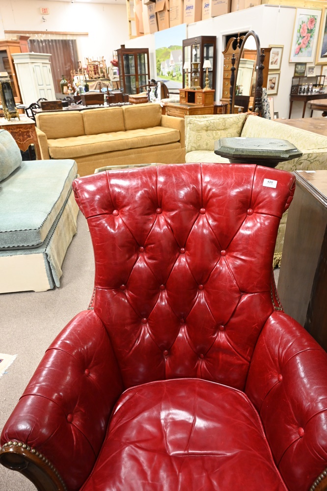 Lot 420: Pair of Lillian August Red Leather Armchairs, having tufted backs and sides, height 41 inches, width 32 inches, (one worn/darkened in spots), Provenance: Estate of James Dana English of New Haven to benefit the New Haven Museum.