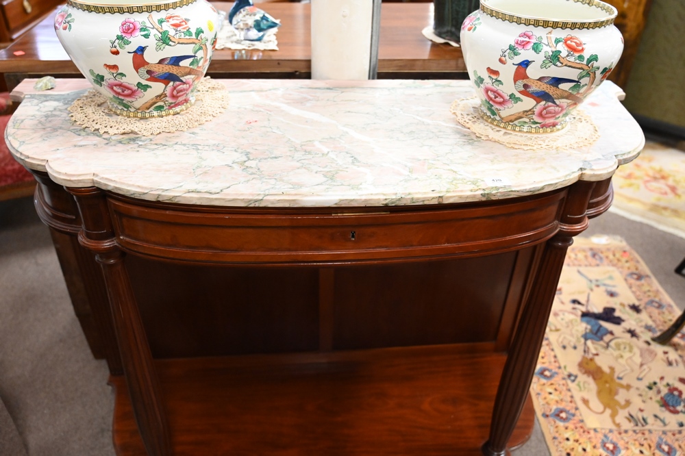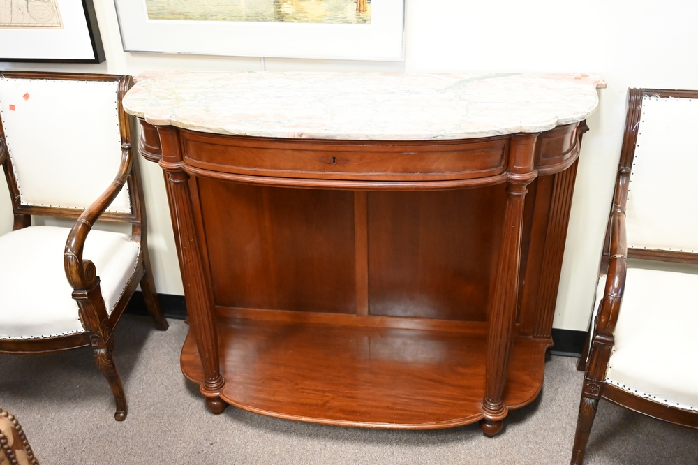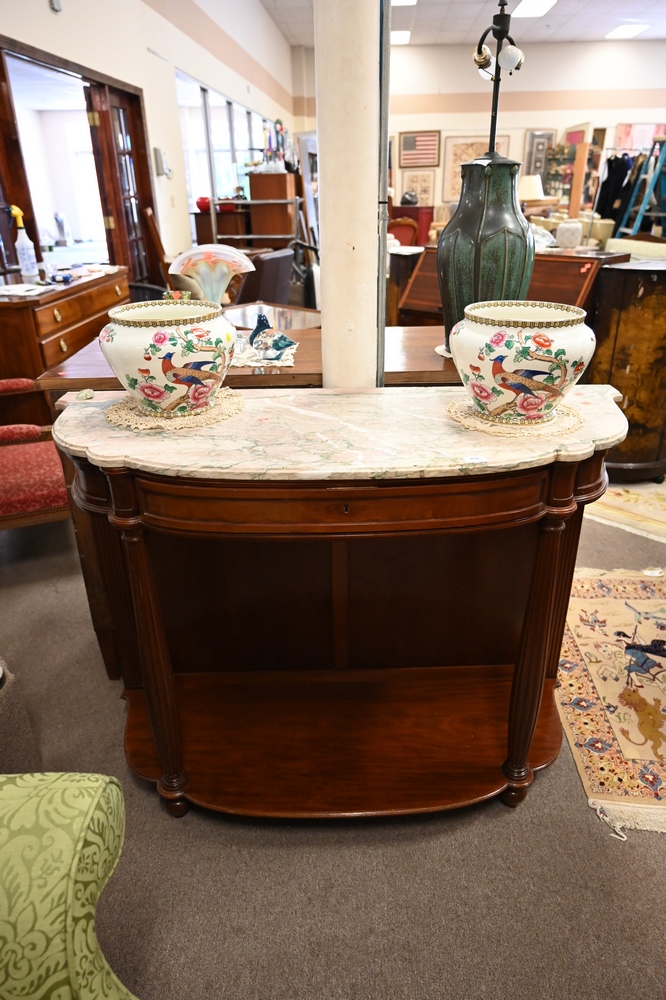Lot 420: Pair of Mahogany Hall Tables, having shaped marble tops, 19th century, height 37 inches, width 49 inches, depth 19 inches, (back corner of marble repaired).