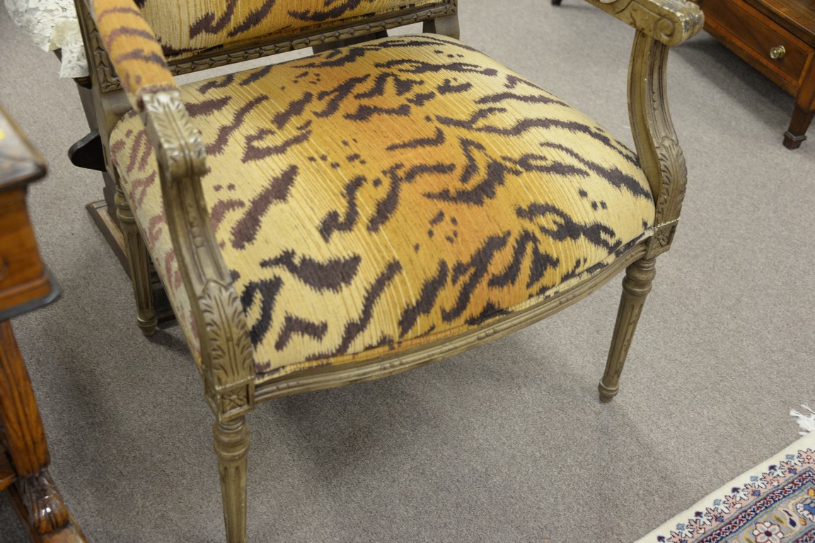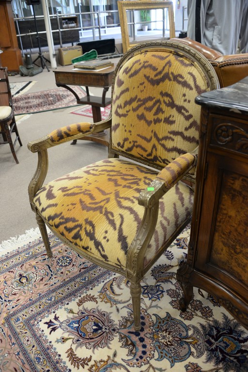 Lot 420: Set of four Henredon Louis XVI style armchairs Desert Finish upholstery having Henredon Upholstery Collection tag on bottom.