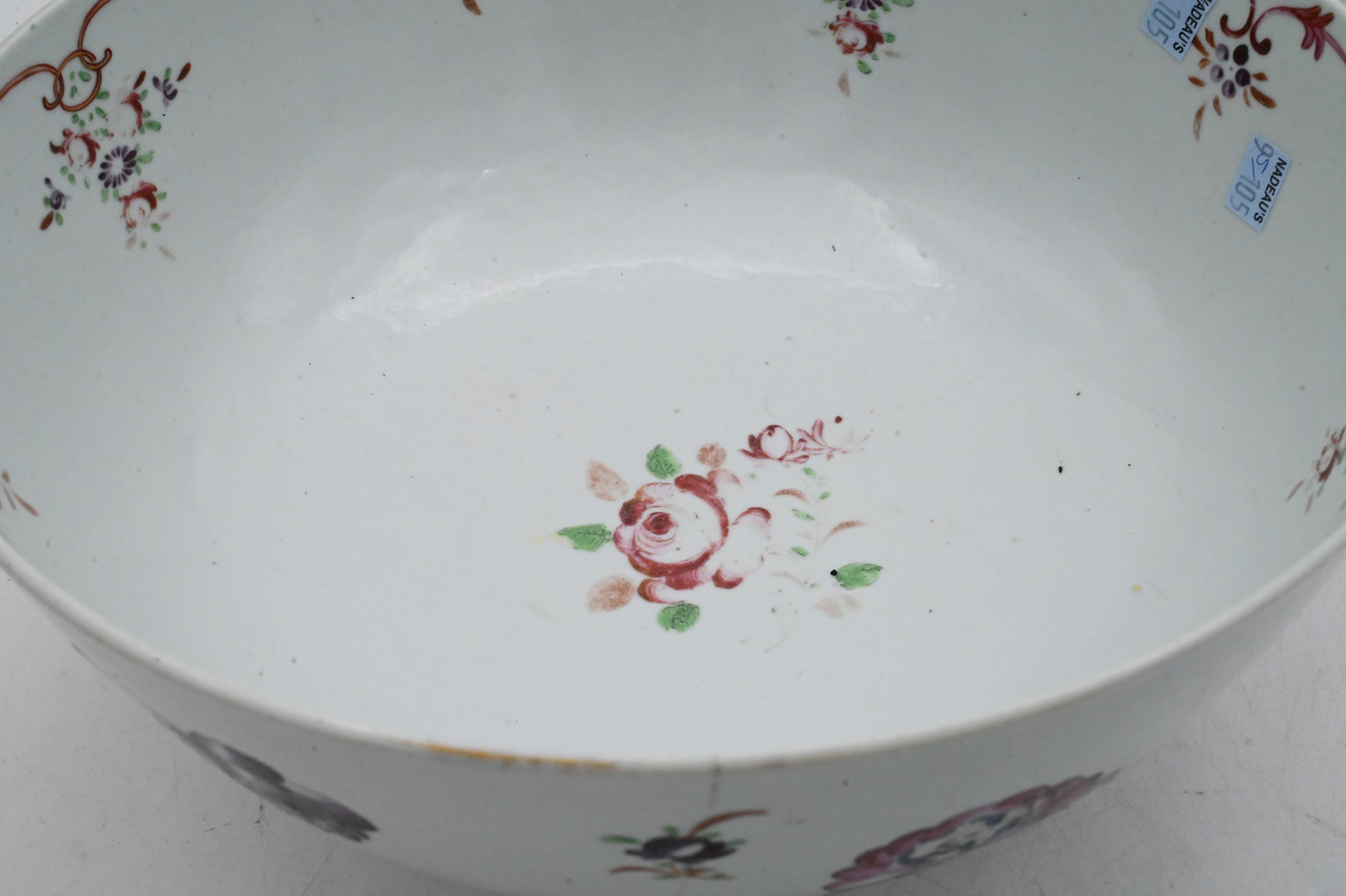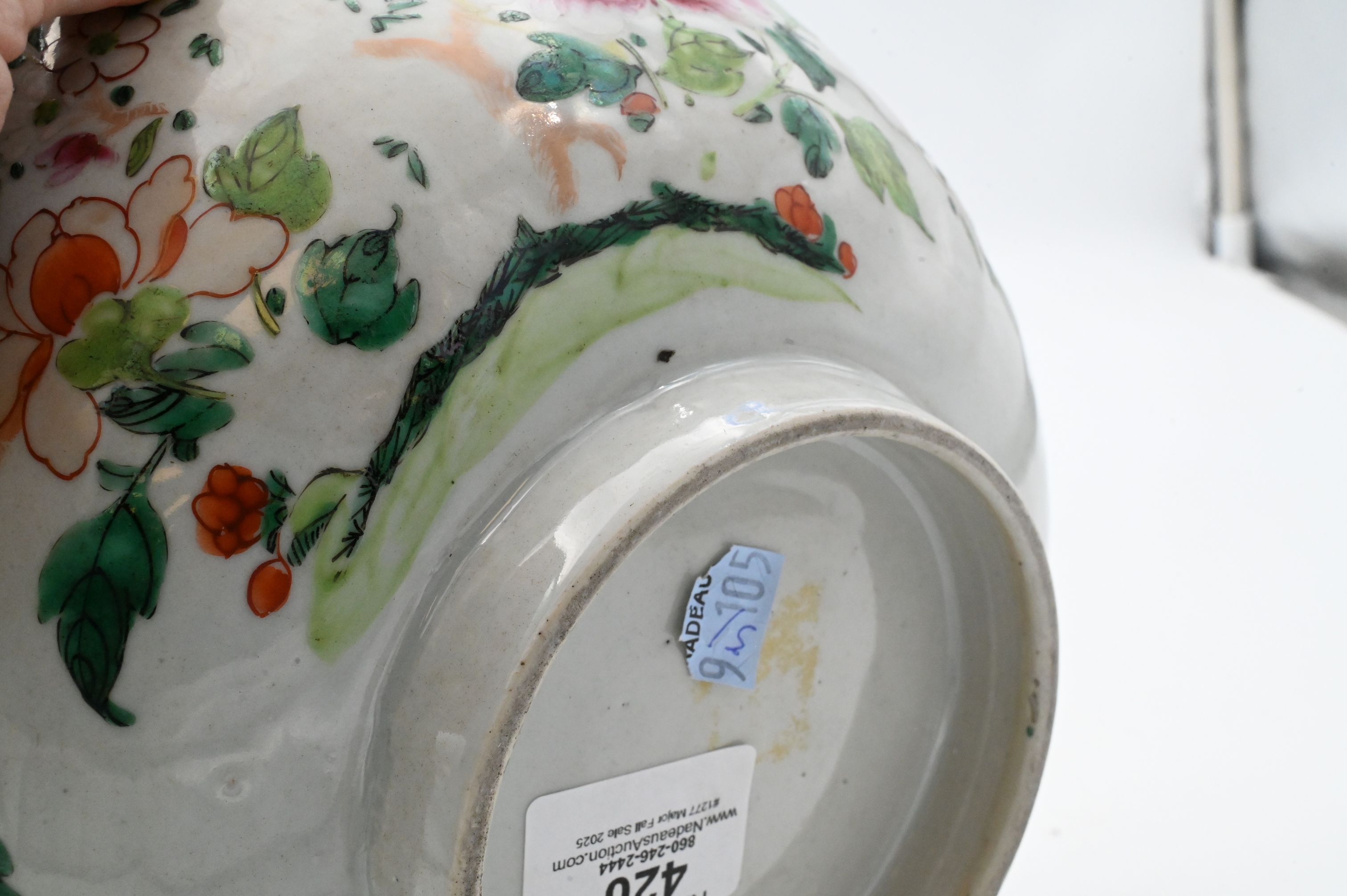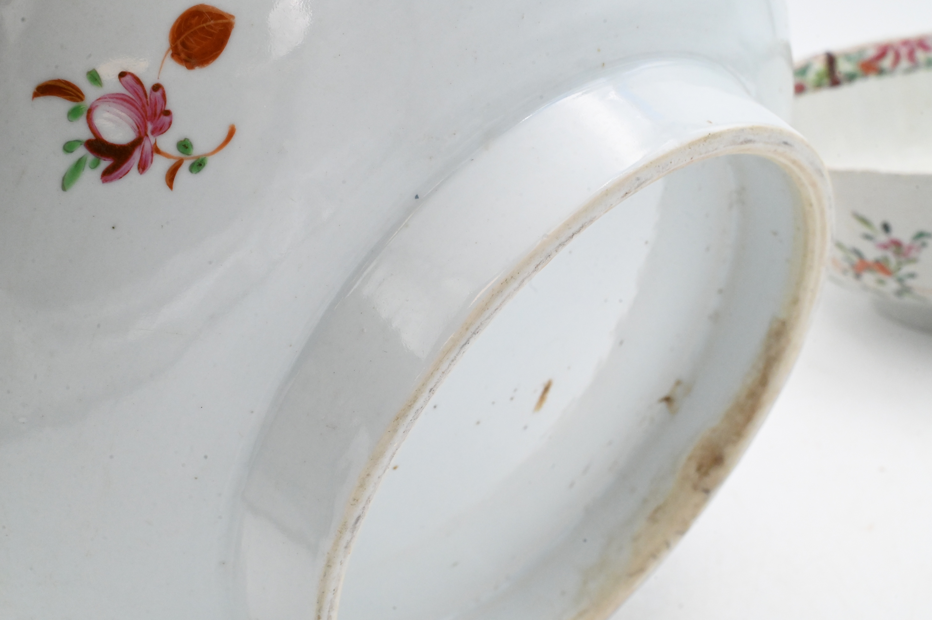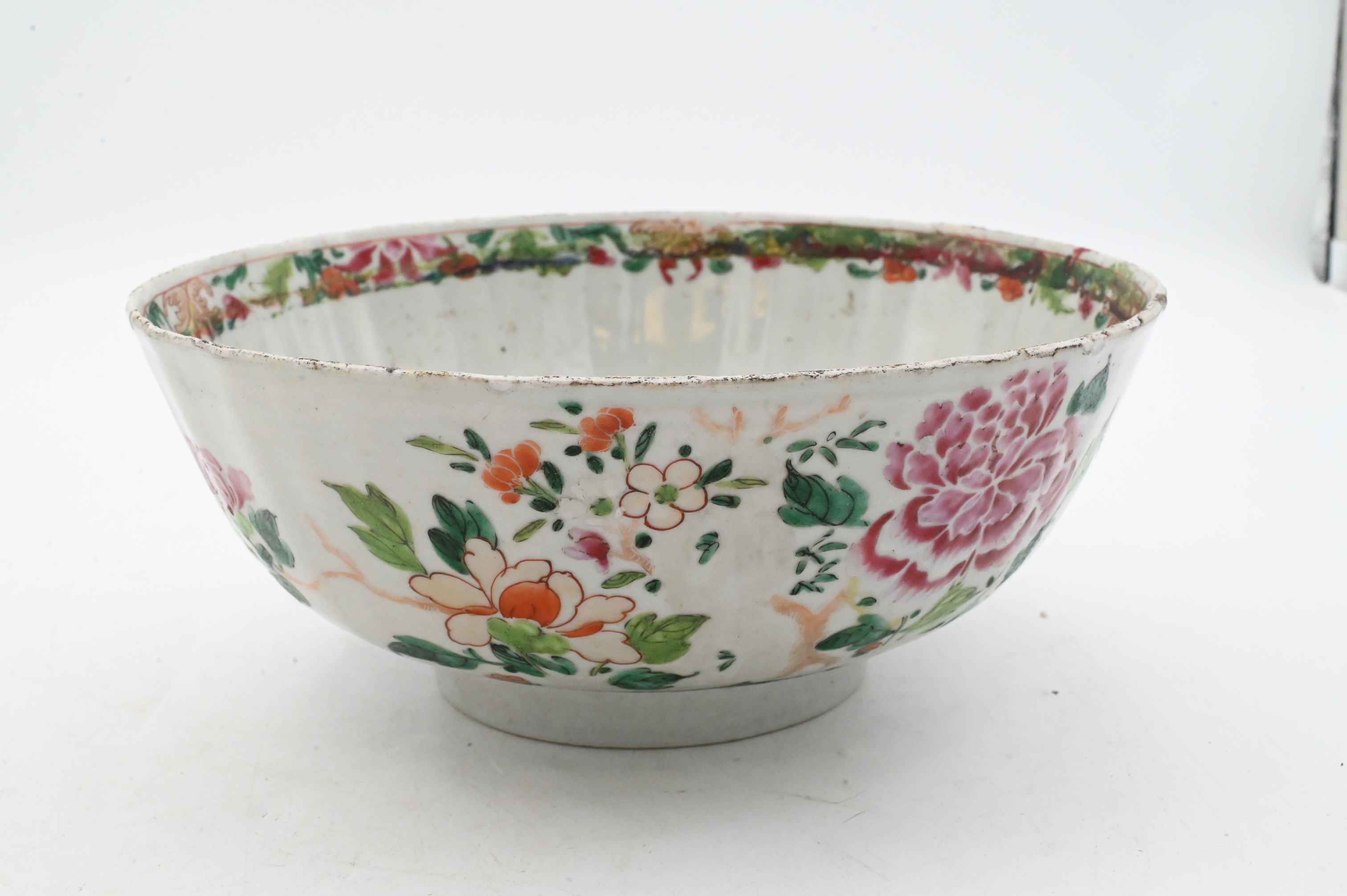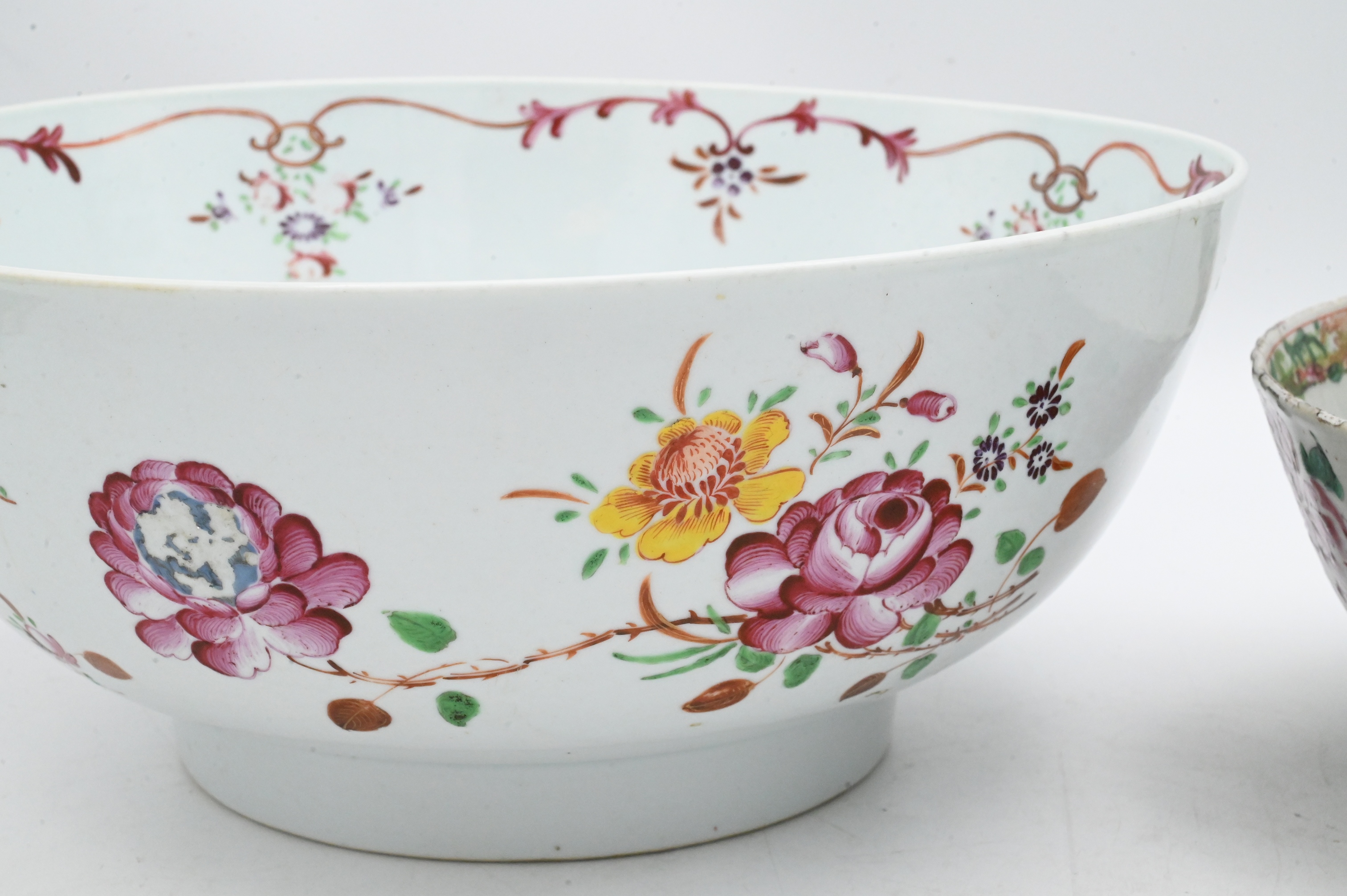 to include one famille rose export punch bowl and one smaller bowl, both decorated with pink peonies, the punch bowl possibly painted in Europe, 18th century