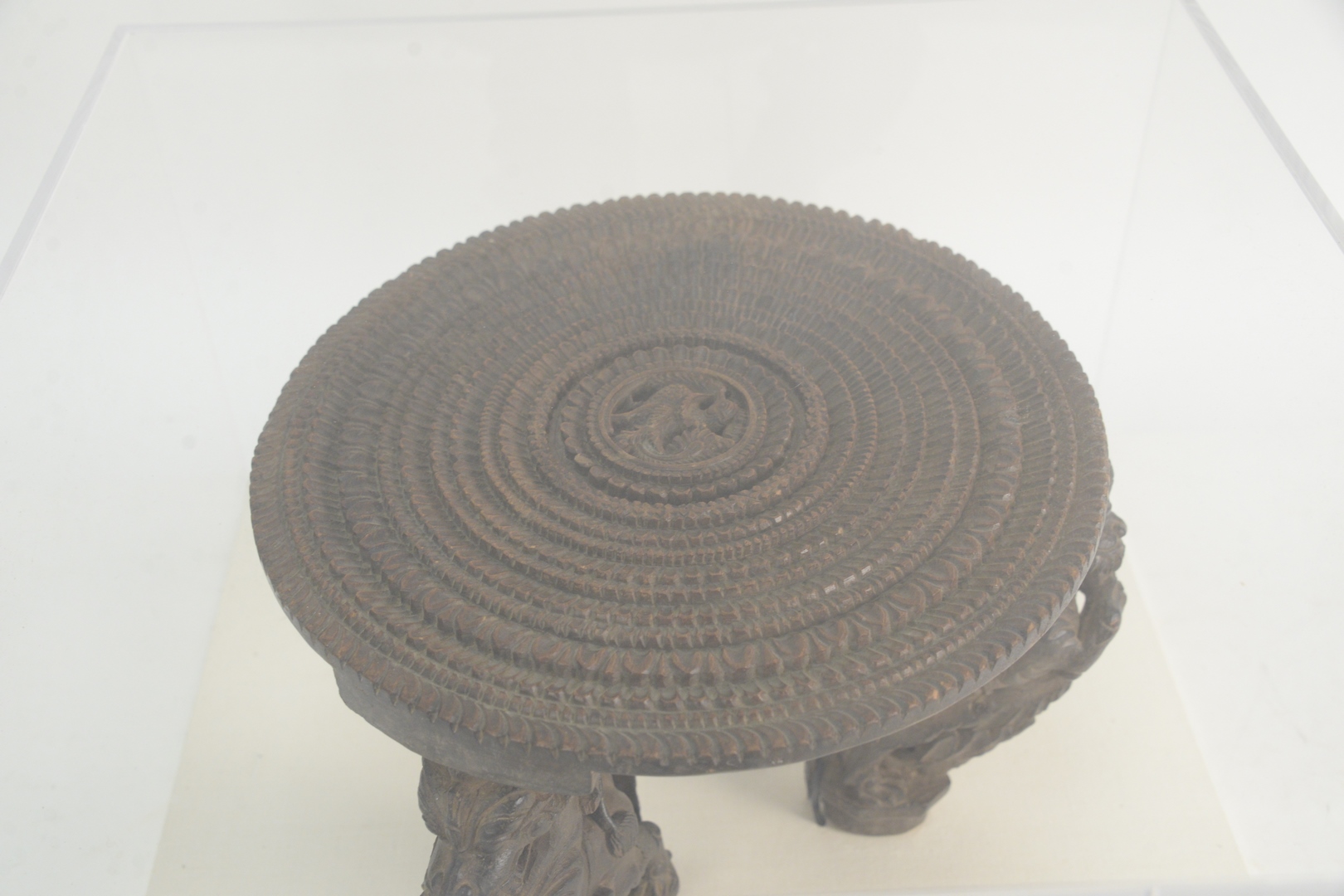 Lot 421: Carved Wood Ceremonial Low Table having 3 carved foo lion legs with round top with carved phoenix bird center, 19th century or later, height 13 1/4 inches, diameter 9 1/4 inches.