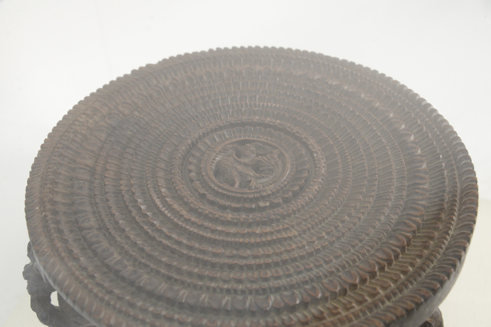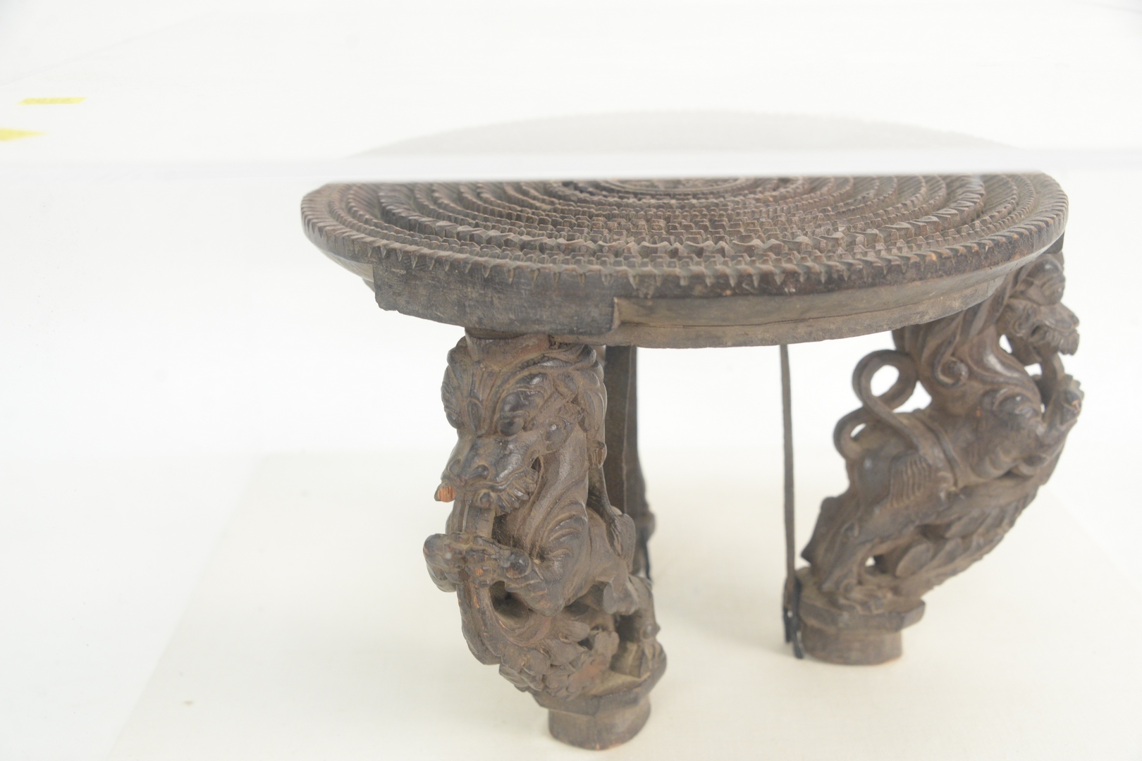 Carved Wood Ceremonial Low Table having 3 carved foo lion legs with round top with carved phoenix bird center, 19th century or later, height 13 1/4 inches, diameter 9 1/4 inches.