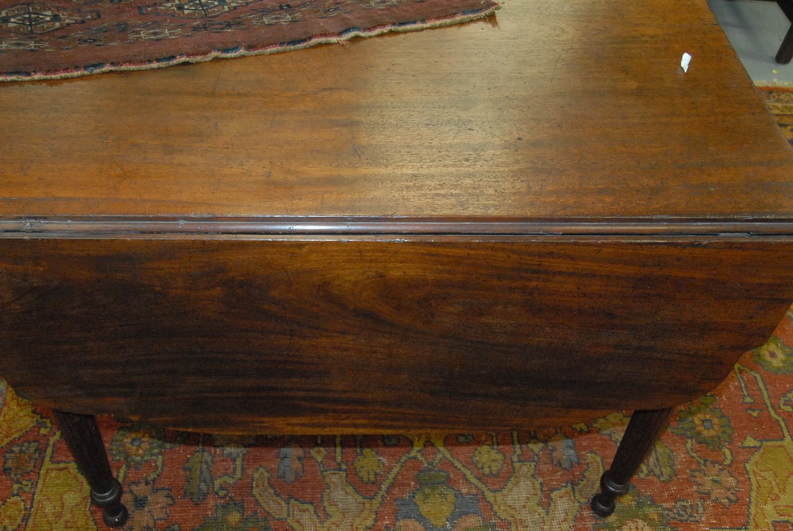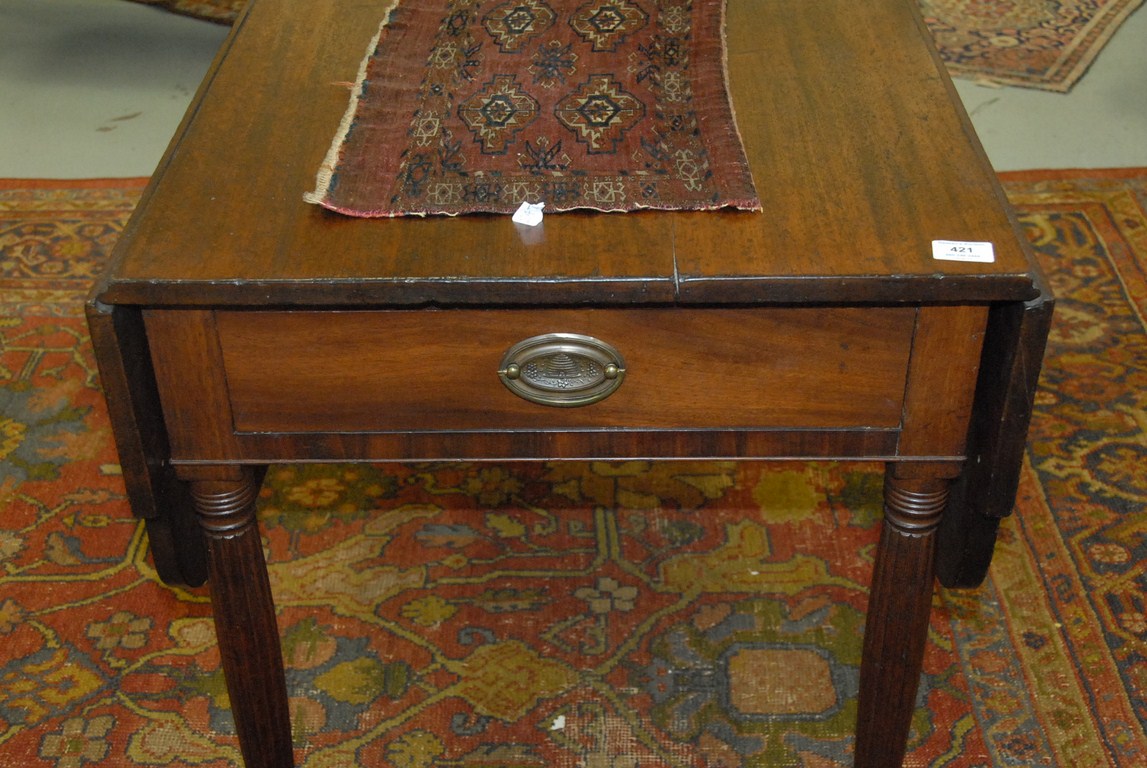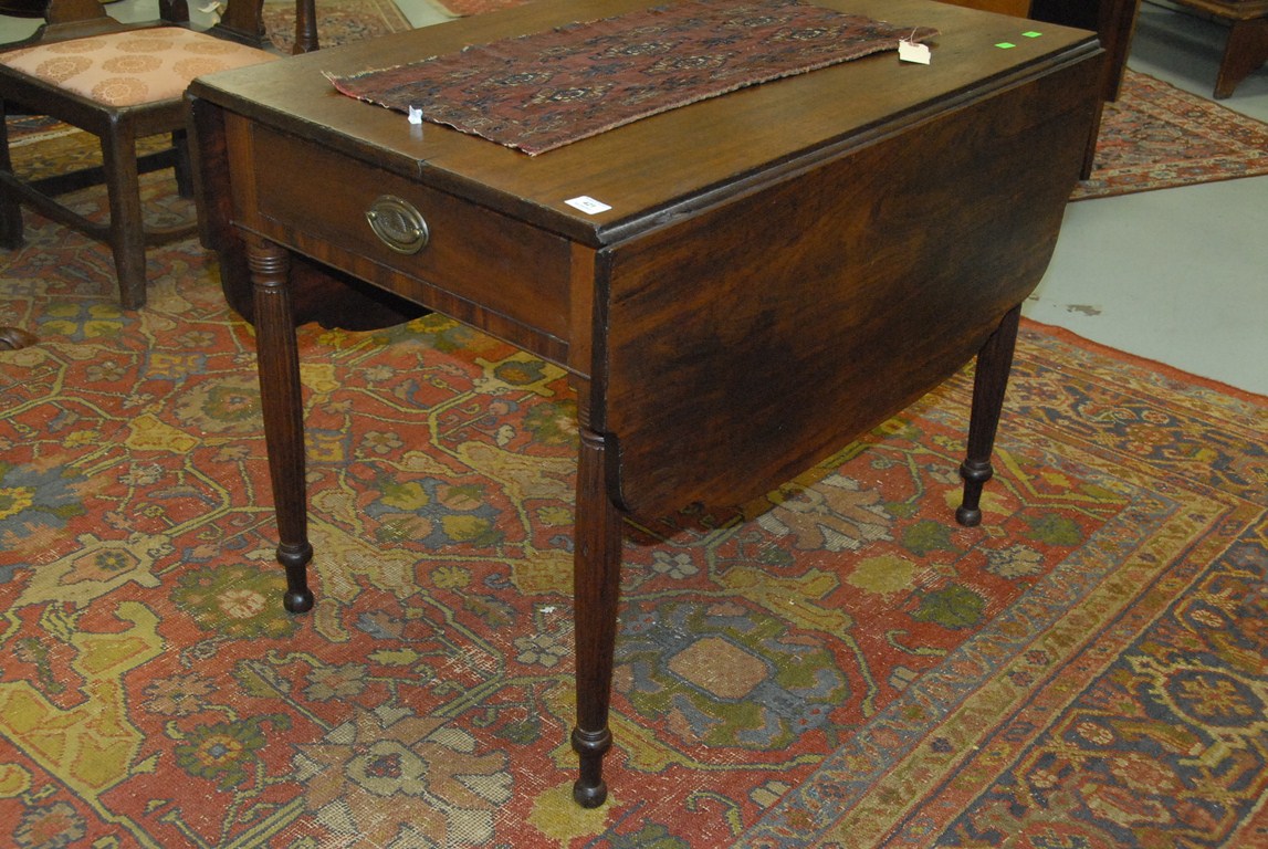 Lot 421: Federal mahogany shaped drop leaf table with end drawer set on reeded legs with turned feet. ht. 28in. lg. 37in. wd. 24in.