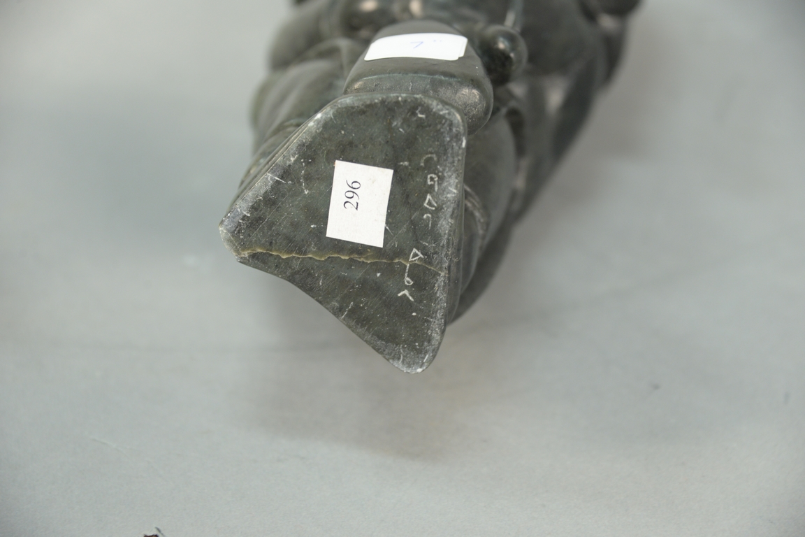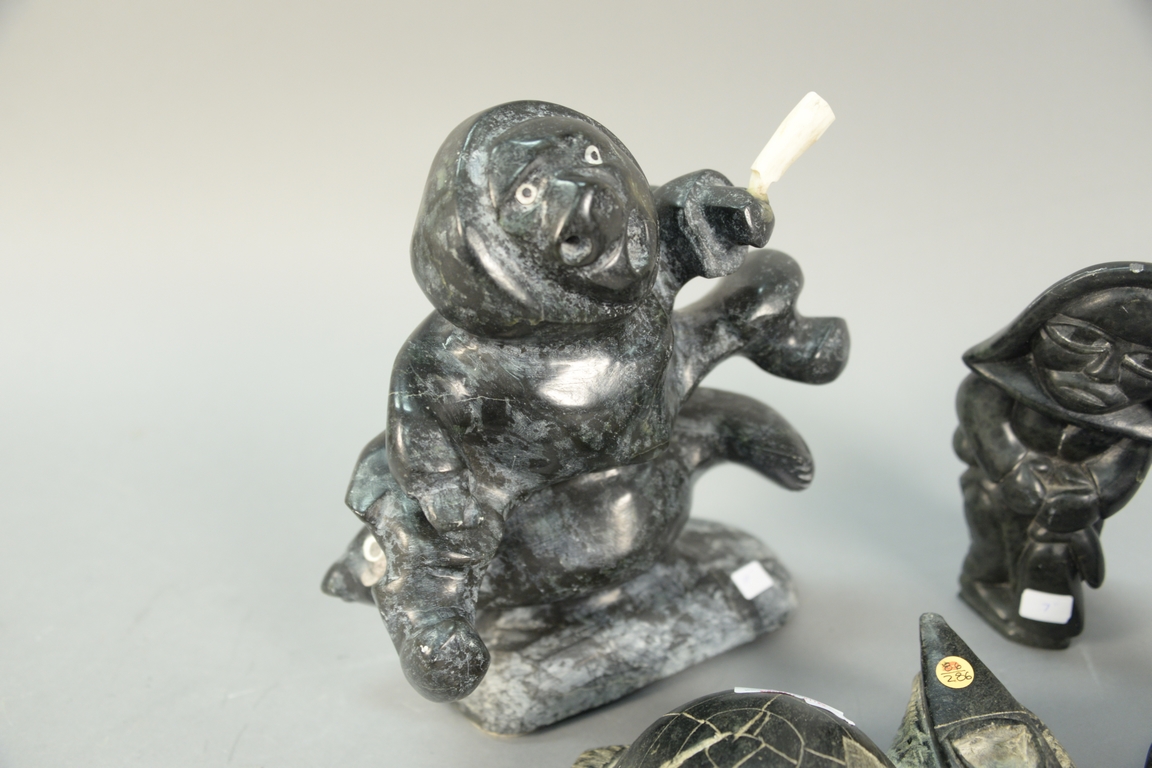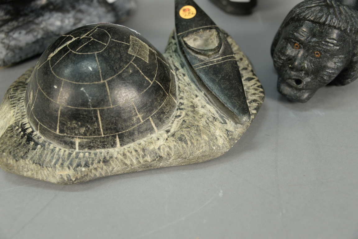 Four Inuit Eskimo figural carvings including Gideon Qauqjuaq Spence Bay dark green serpentine Sedna-Inset Eyes Provenance: Waddington’s Toronto, Canada, 6, Eli Sabee Cape Dorset grey soapstone Igloo & Canoe 8, Cape Dorset dark green serpentine Woman with Sack ht. 7in., and Johnny Saggiatok Gjoa Haven black/gray serpentine Shaman/Bird Transformation Provenance: Waddington’s Toronto, Canada, 10.