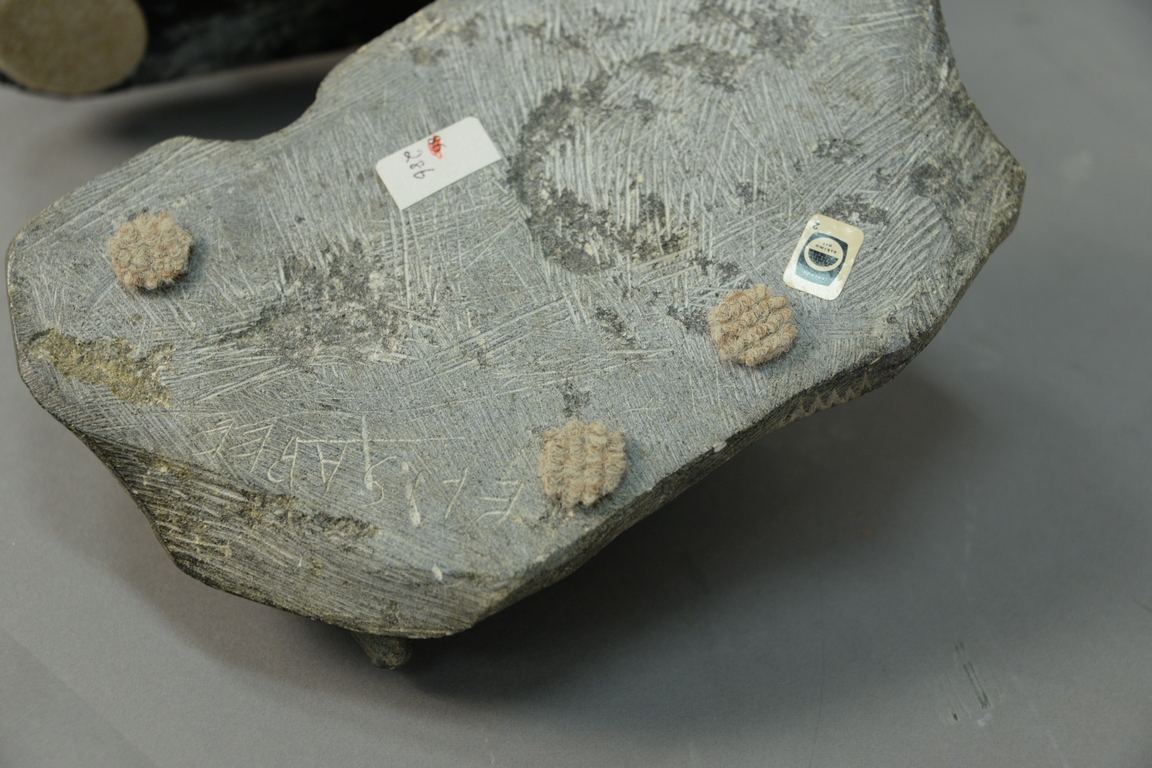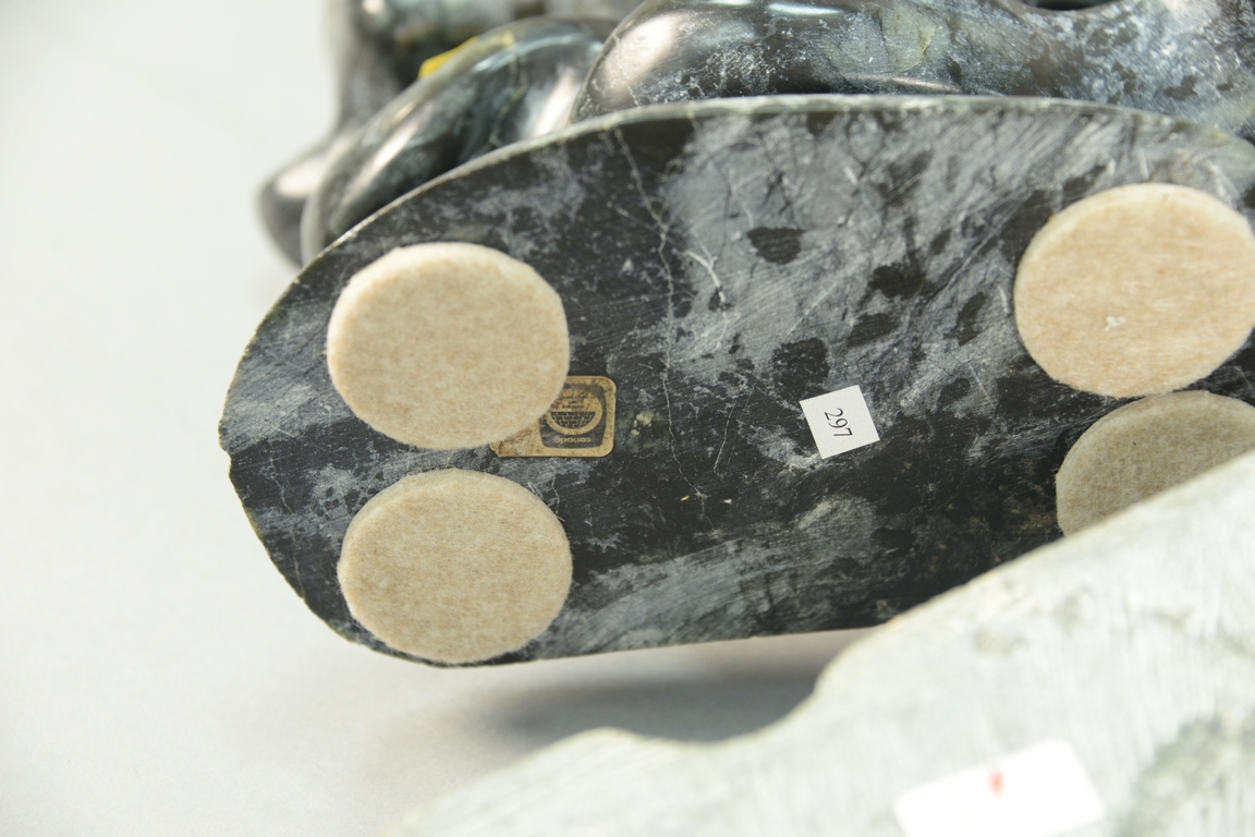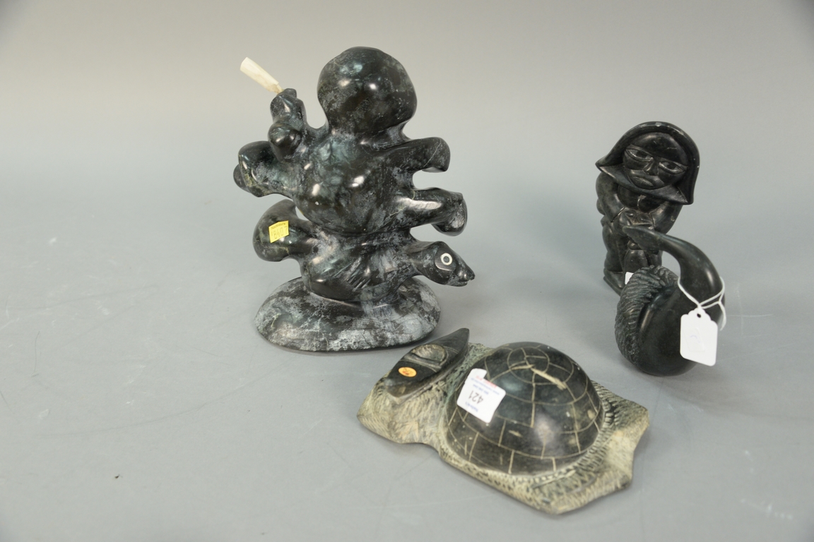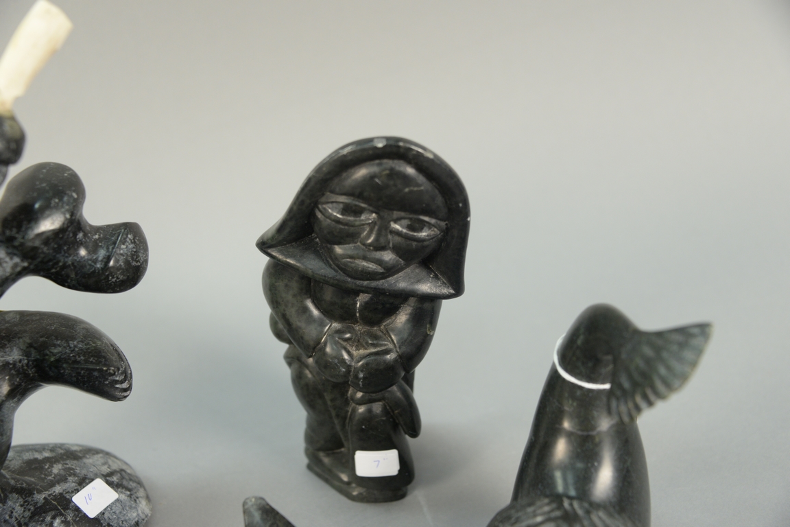 Four Inuit Eskimo figural carvings including Gideon Qauqjuaq Spence Bay dark green serpentine Sedna-Inset Eyes Provenance: Waddington’s Toronto, Canada, 6, Eli Sabee Cape Dorset grey soapstone Igloo & Canoe 8, Cape Dorset dark green serpentine Woman with Sack ht. 7in., and Johnny Saggiatok Gjoa Haven black/gray serpentine Shaman/Bird Transformation Provenance: Waddington’s Toronto, Canada, 10.