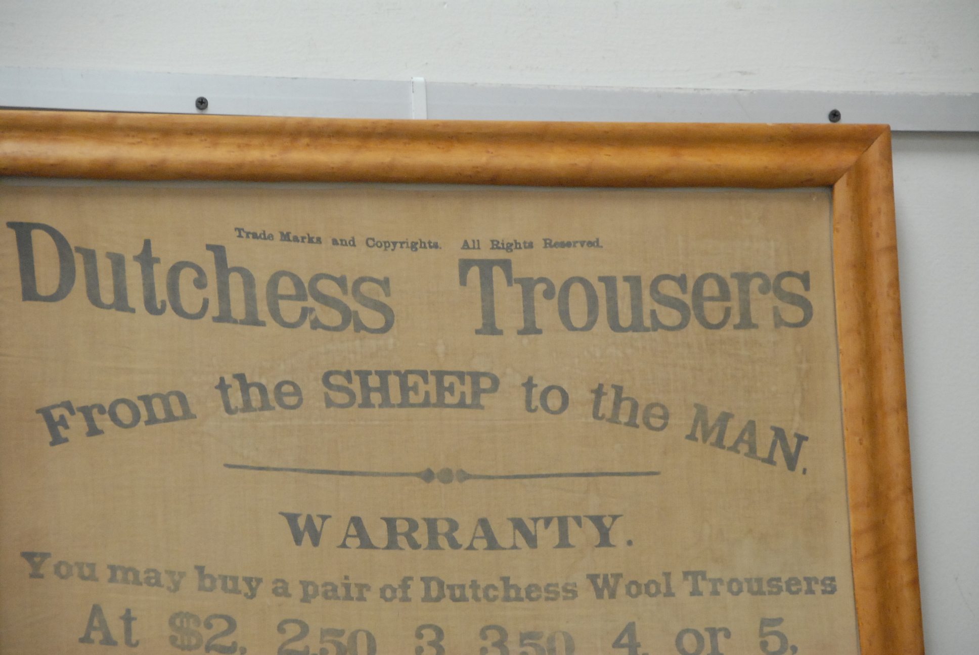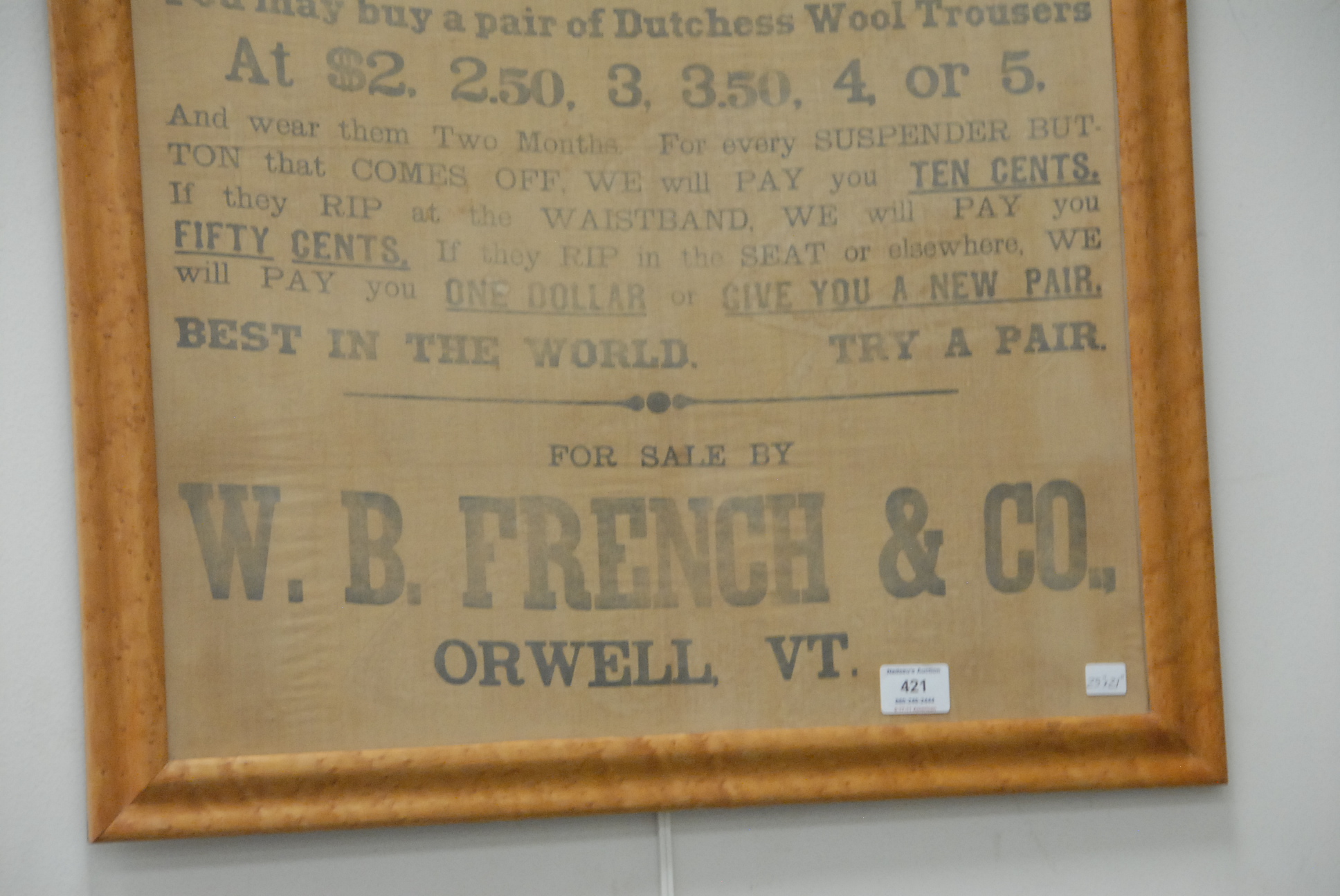 Framed cloth advertising Duchess Trousers W.B. French & Co. Orwell VT.
