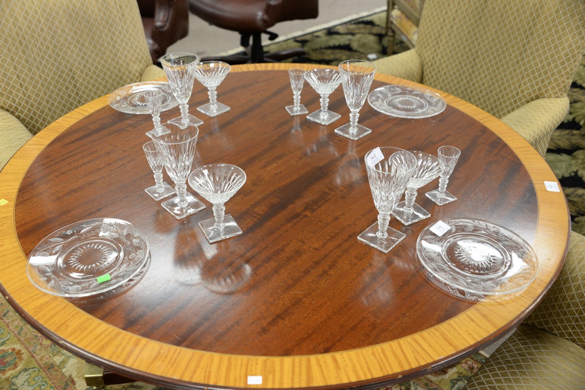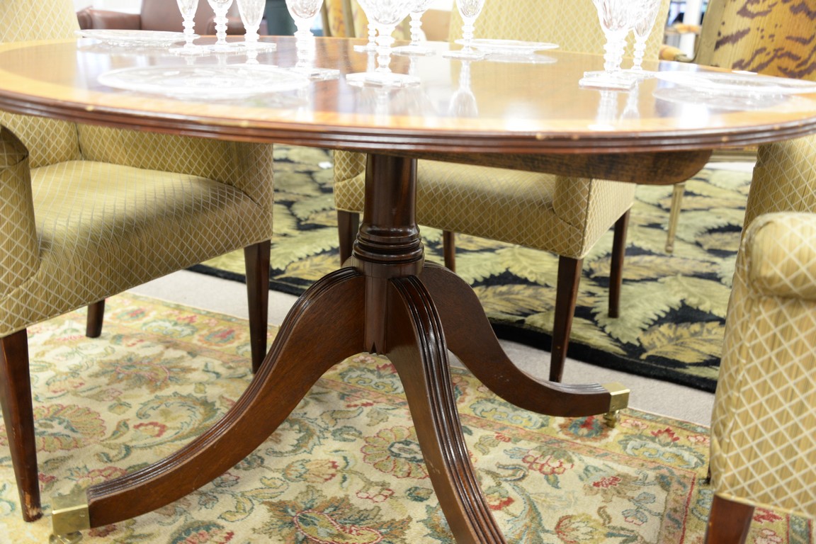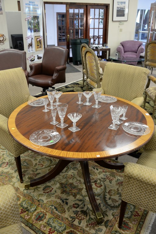 Lot 421: Mahogany banded inlaid round pedestal table with tip top. dia. 48in.