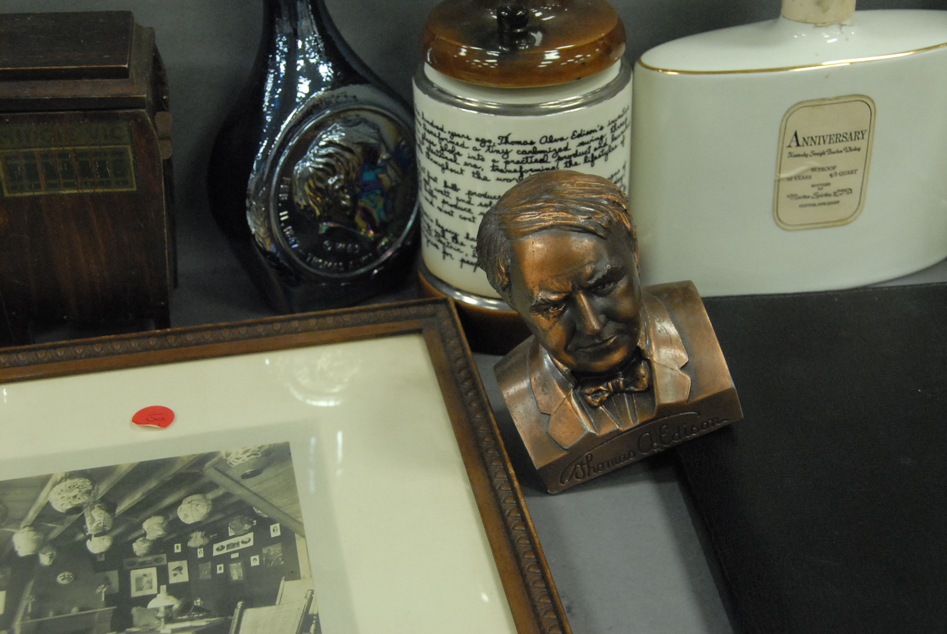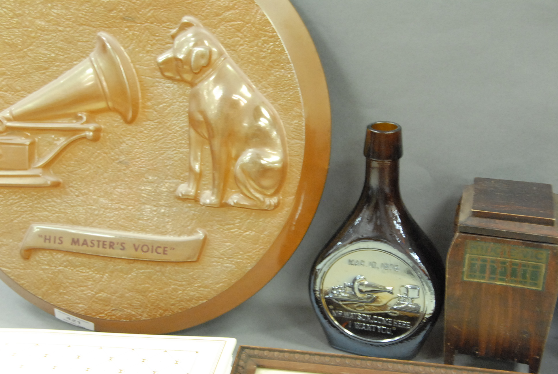 One lot of advertising and photographs, approximately 13 pieces and album with magazine ads, one with photographs, five bottles and a bank.