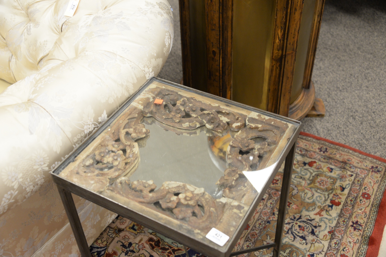 Lot 421: Pair of Steel Side Tables, having glass tops over carved frame on mirror, height 25 inches, top 17 x 16.