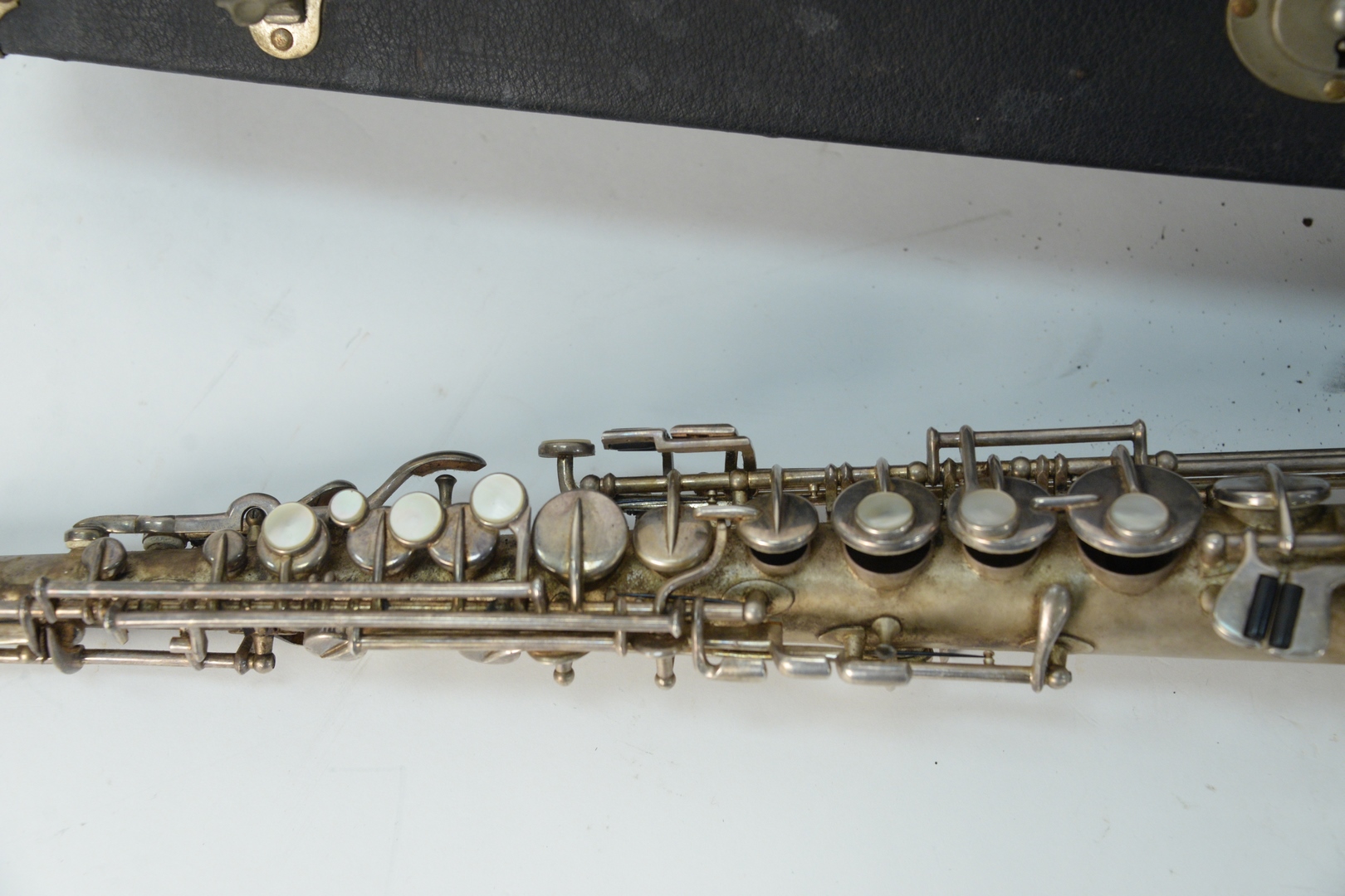 Lot 422: 1926 Buescher True Tone Soprano Saxophone, serial #205429, pads and springs in good shape no mouthpiece, needs new corking, original hard-shell case, case length 26 1/2 inches.