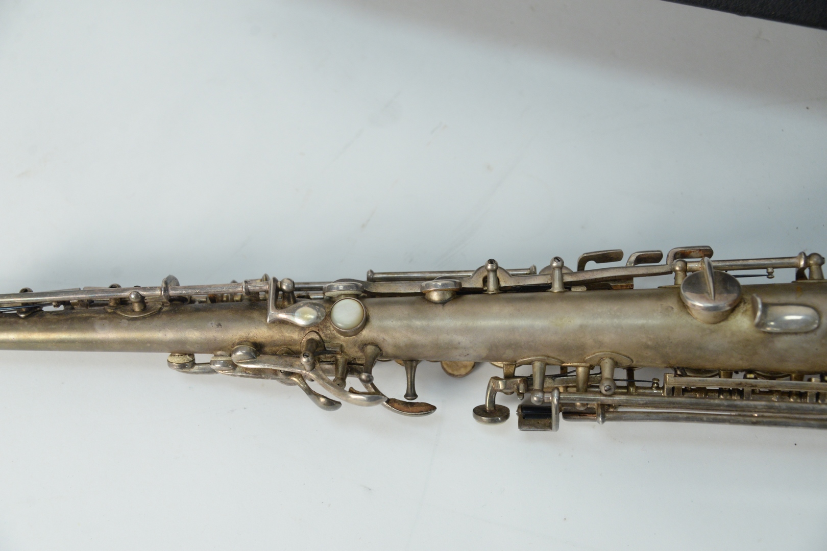 1926 Buescher True Tone Soprano Saxophone, serial #205429, pads and springs in good shape no mouthpiece, needs new corking, original hard-shell case, case length 26 1/2 inches.