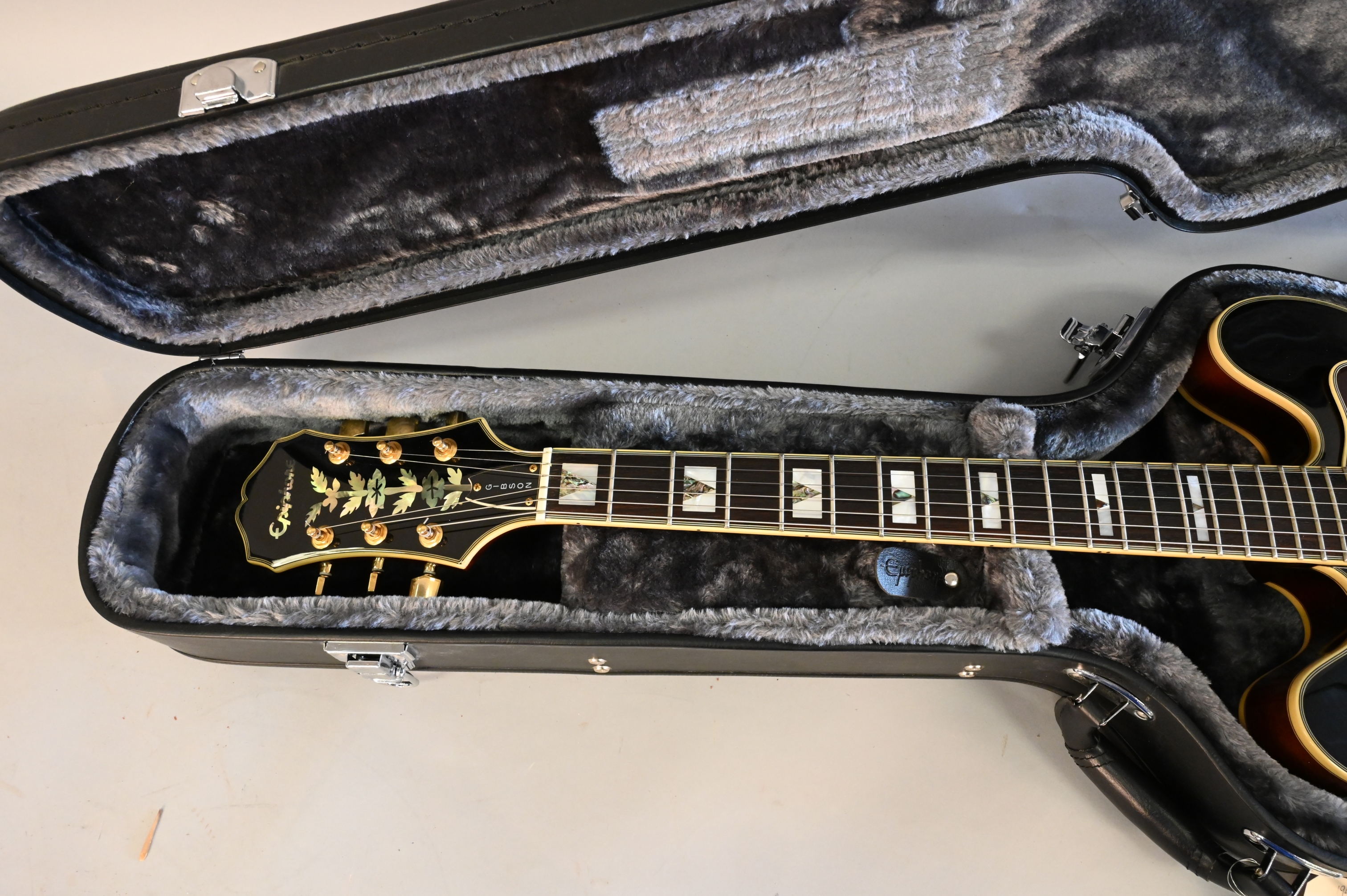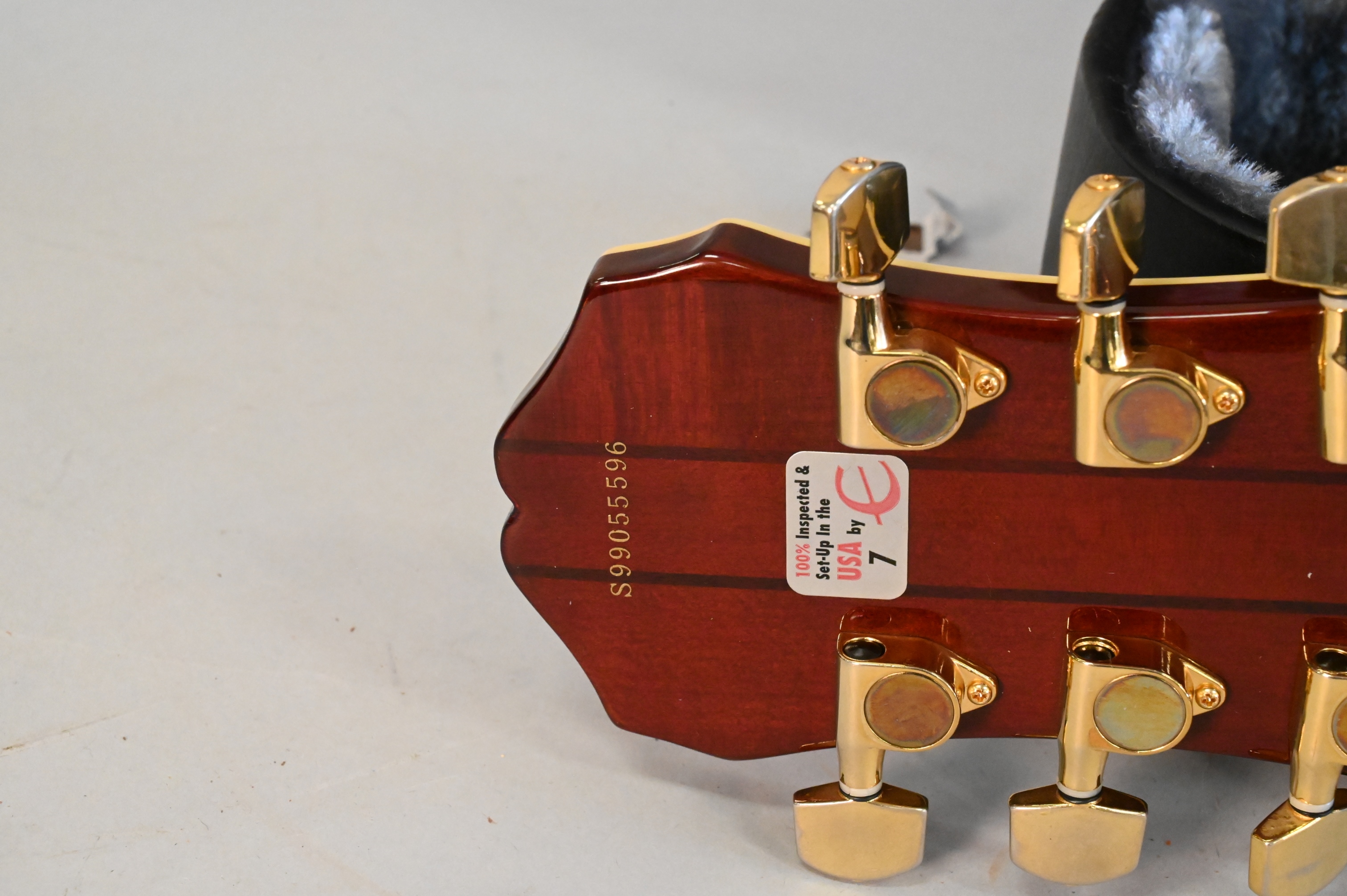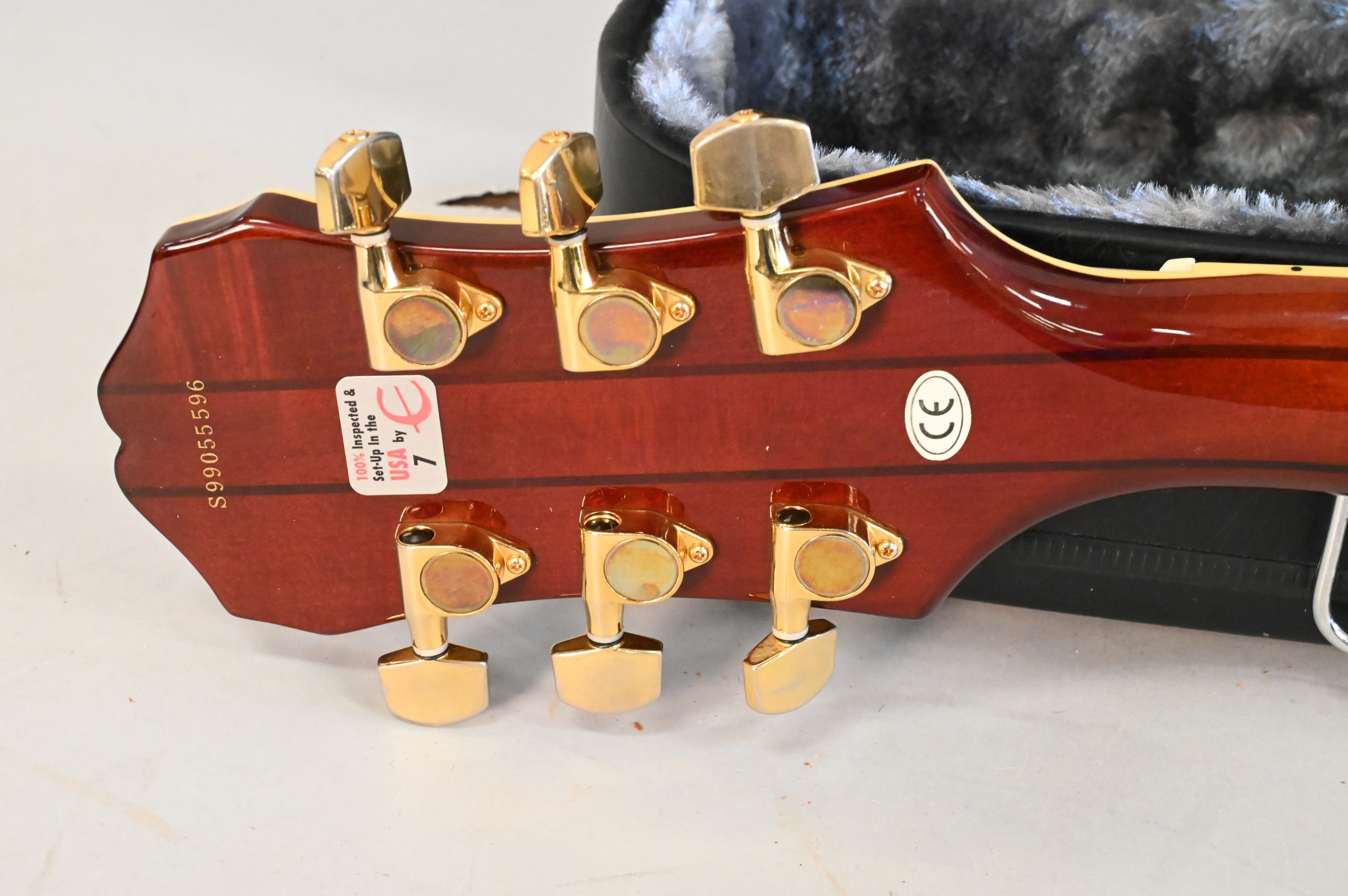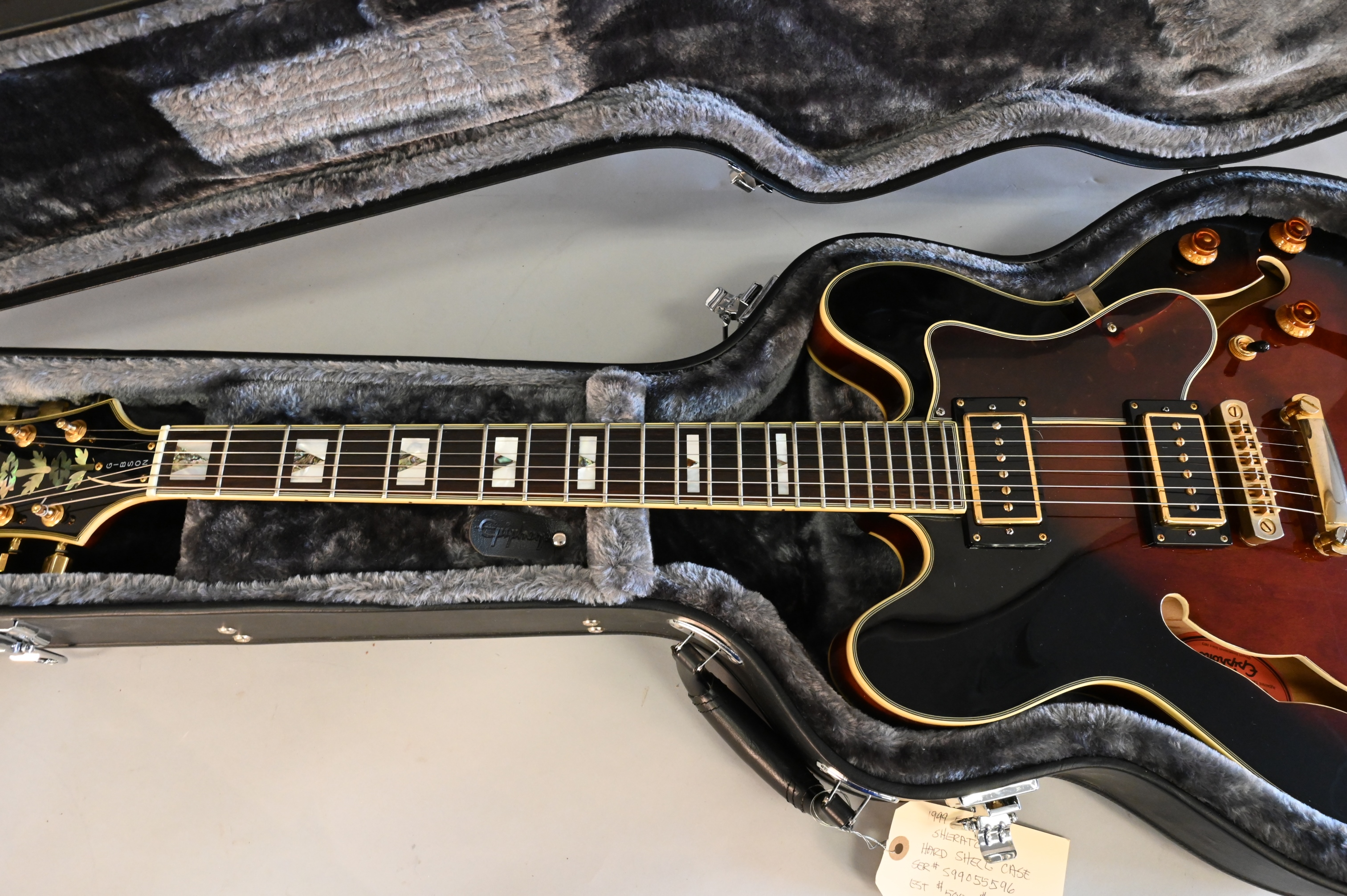 1999 Epiphone Sheraton Guitar, serial #S99055596, with mother of pearl inlay and hard case.