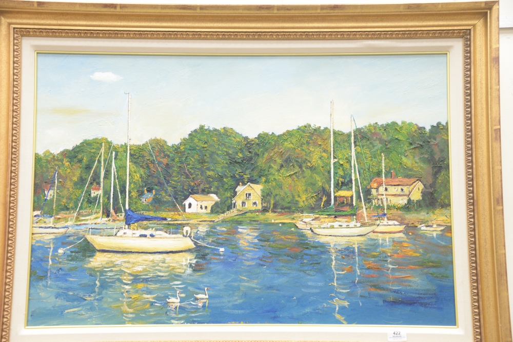 Lot 422: American School (20th Century), Sailboats in the dock, oil on canvas, unsigned, 24″ x 36″, Provenance: David and Cynthia Kim, 22 Sto…