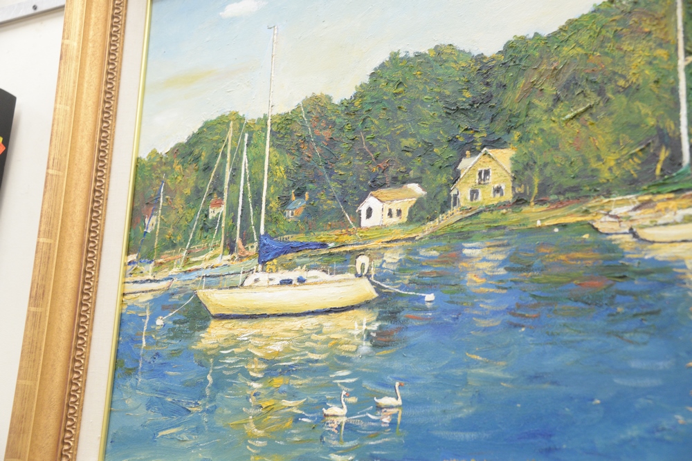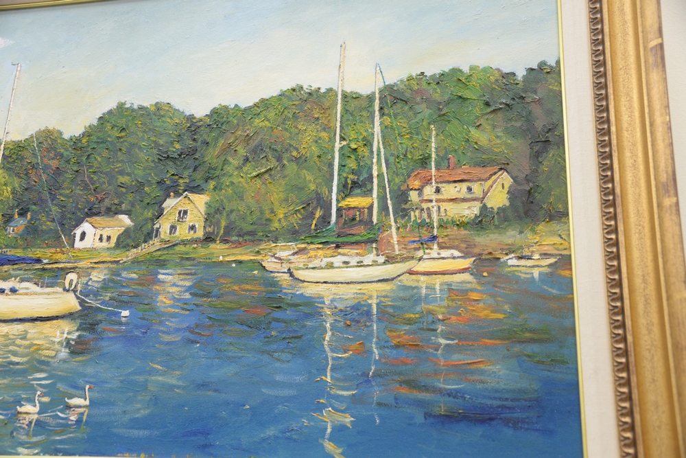 American School (20th Century), Sailboats in the dock, oil on canvas, unsigned, 24″ x 36″, Provenance: David and Cynthia Kim, 22 Stoney Wylde Lane, Greenwich, Connecticut. View home by visiting: https://www.zillow.com/homedetails/22-Stoney-Wylde-Ln-Greenwich-CT-06830/177238281_zpid/.