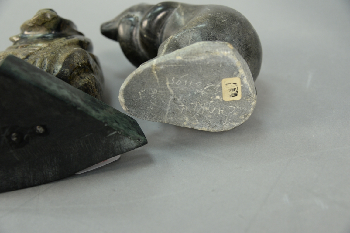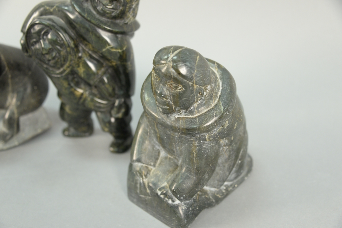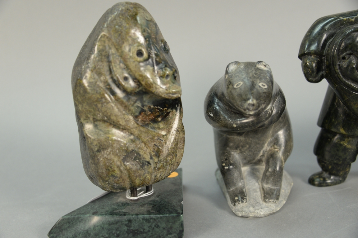 Lot 422: Four Inuit Eskimo carvings including Bear, Woman Kneeling, Monkey, and a Double figure. ht. 5 1/2in. to 8in.
