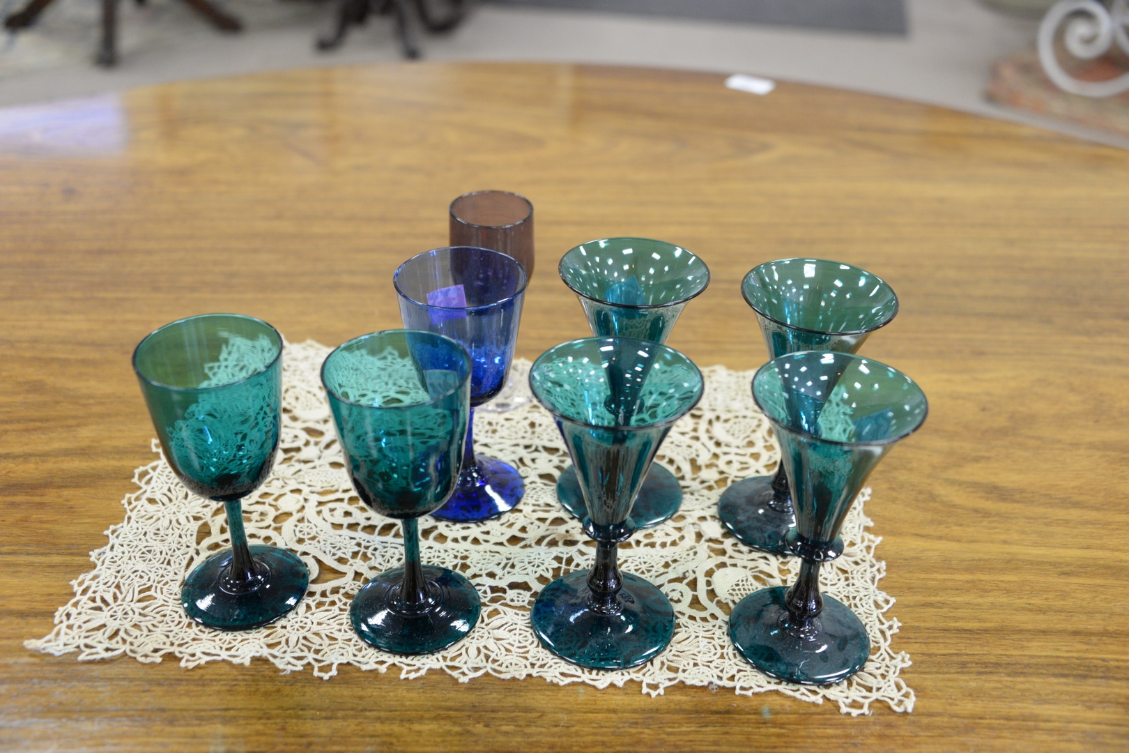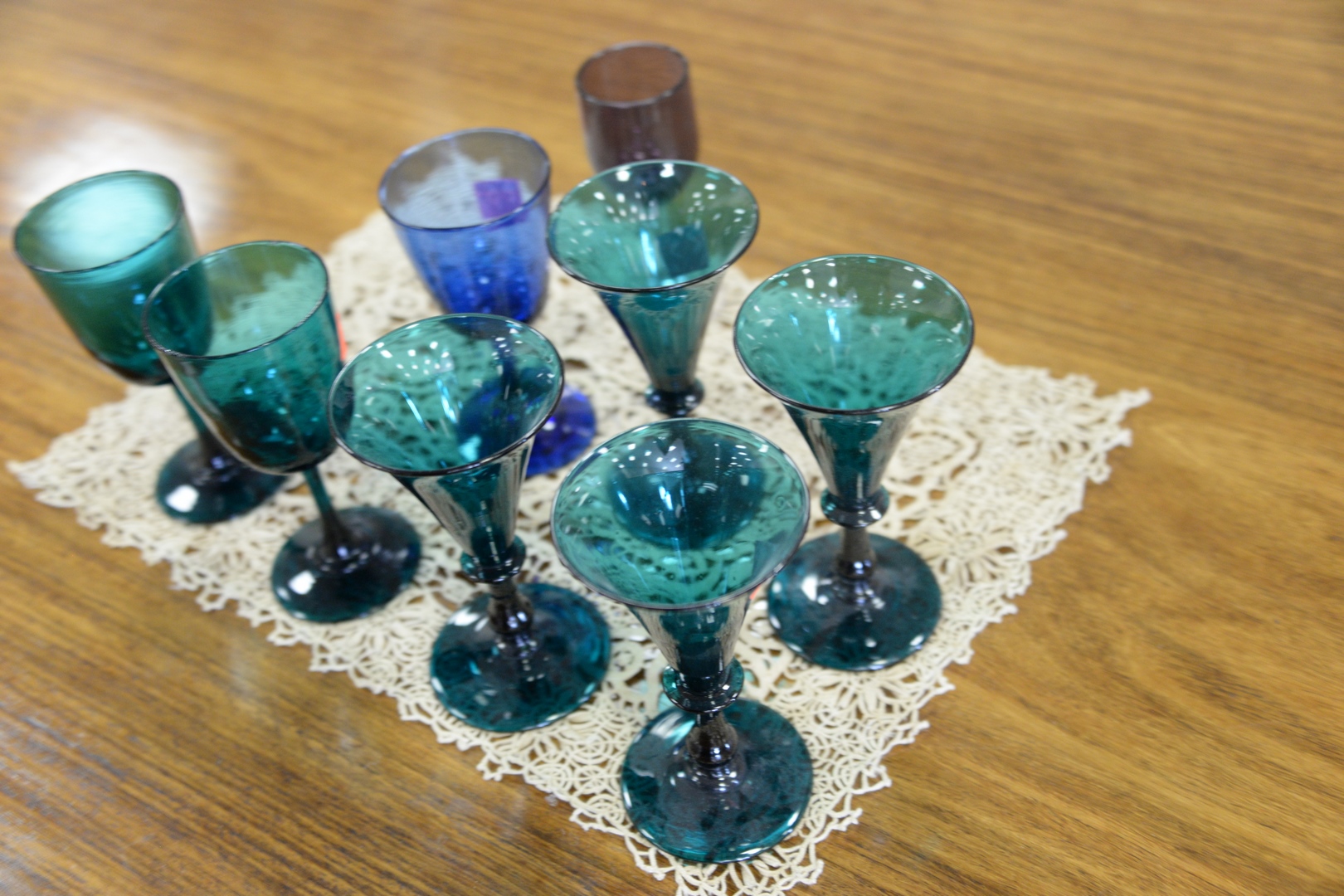 to include set of 5 green glasses with trumpet flared rim 3 amethyst, 2 blue and 2 other green 1 cobalt blue tumbler