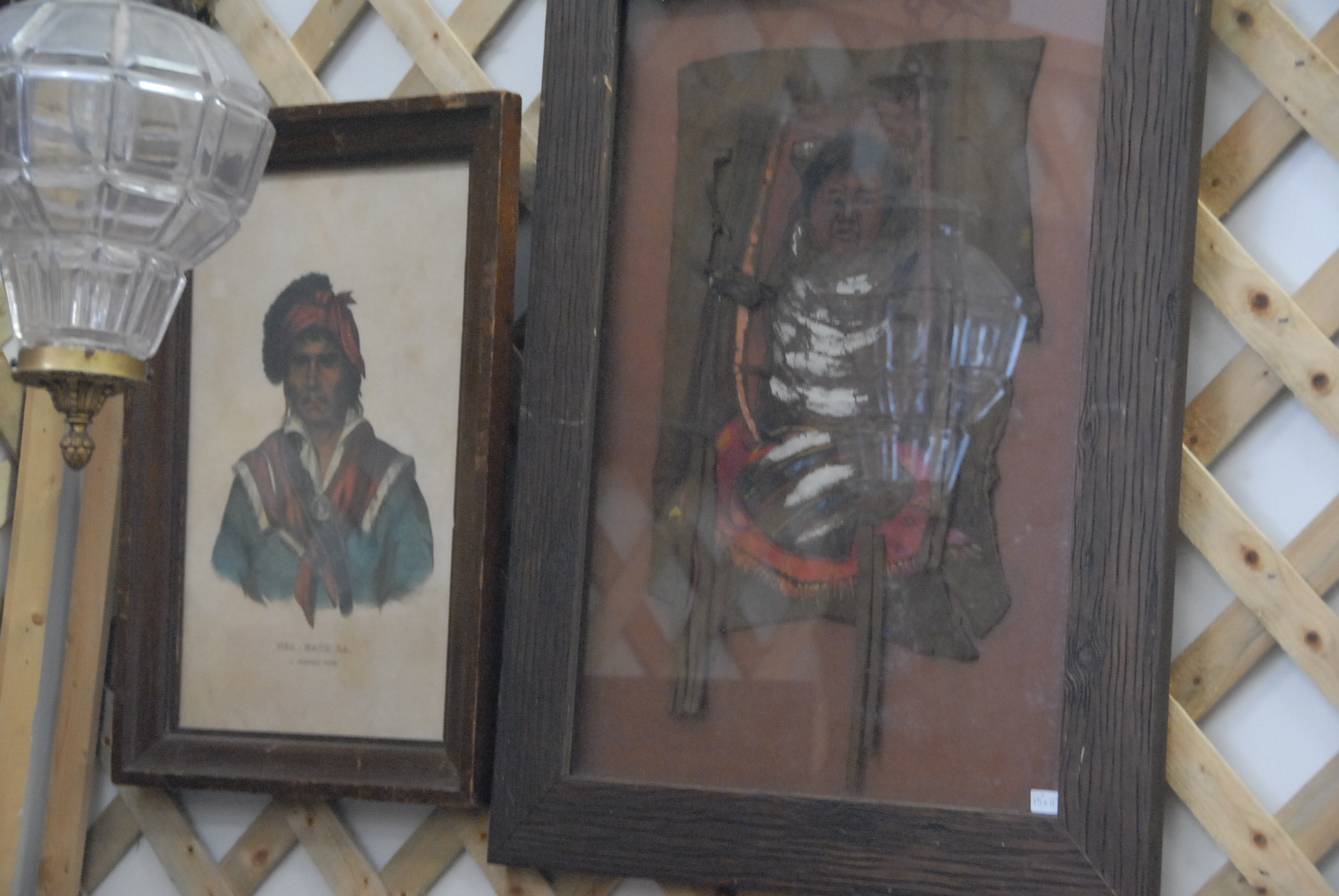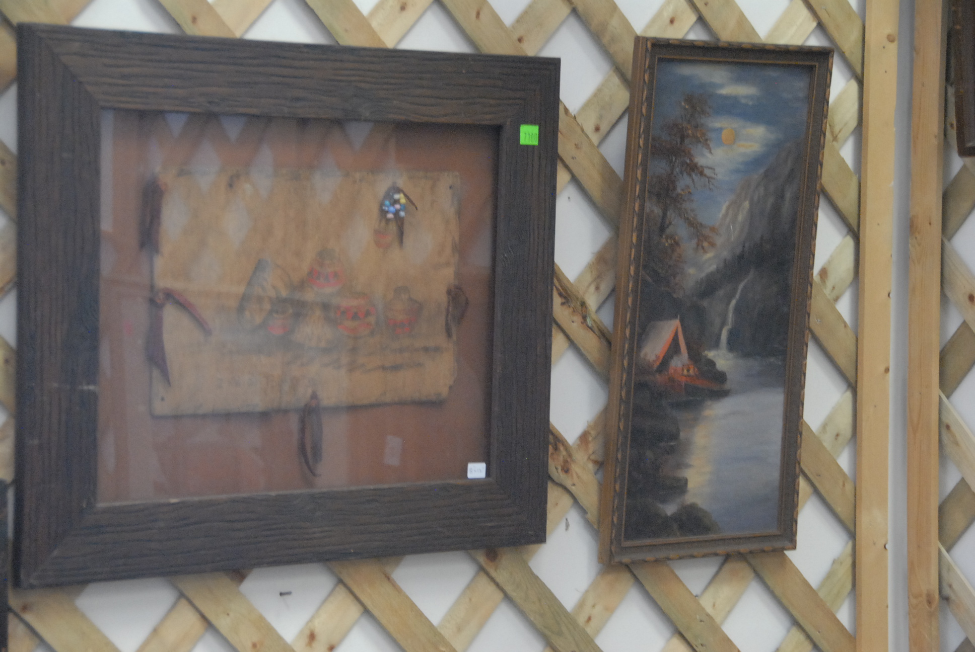 Group of nine framed Indian pieces, prints, oil on canvas, three dimensional items, etc.