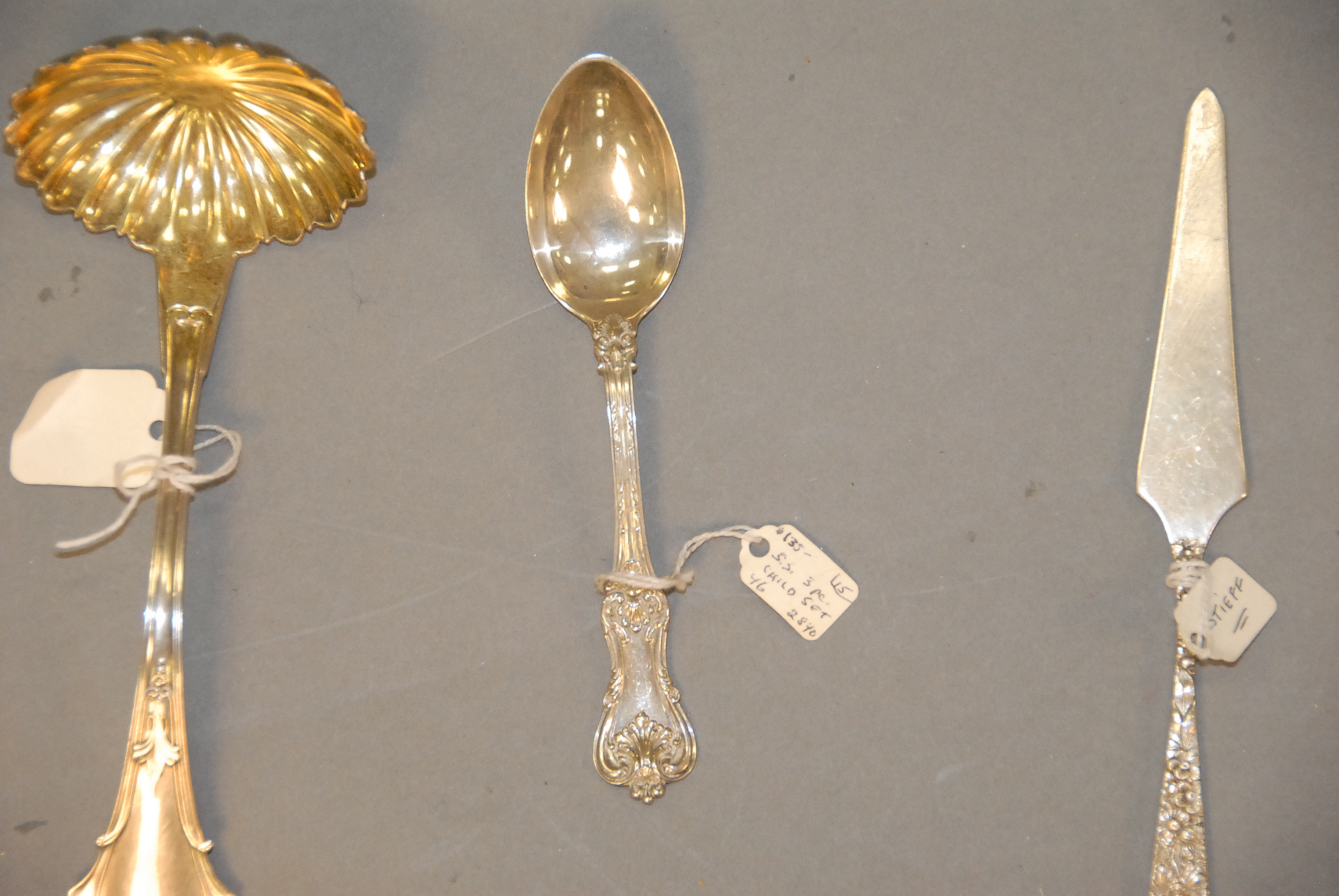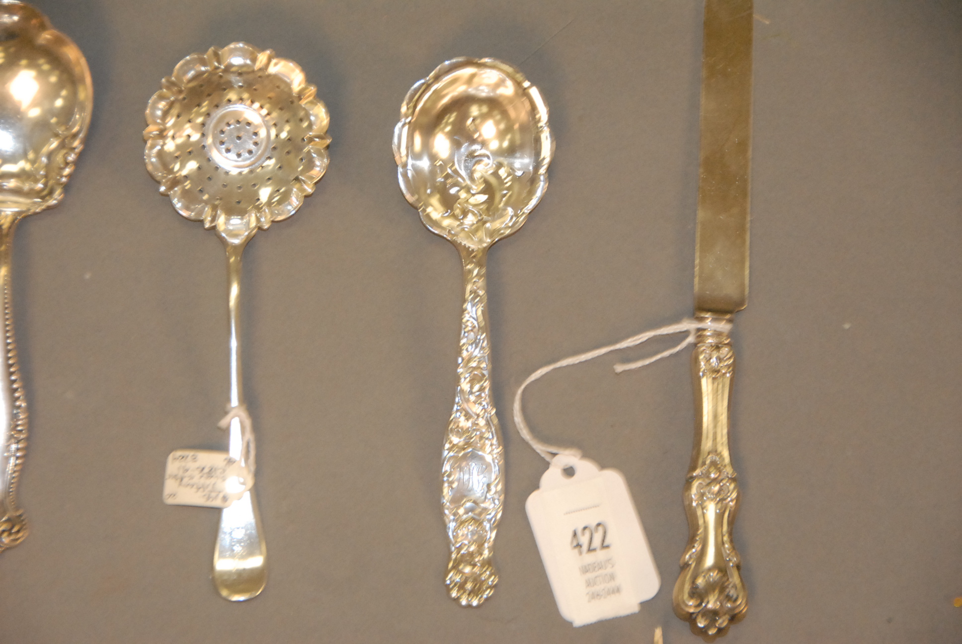 Group of sterling decorative spoons, ladles, pinchers, Tiffany & Co. spoon, etc., 9.8 t oz. weighable plus one small weighted handled knife.