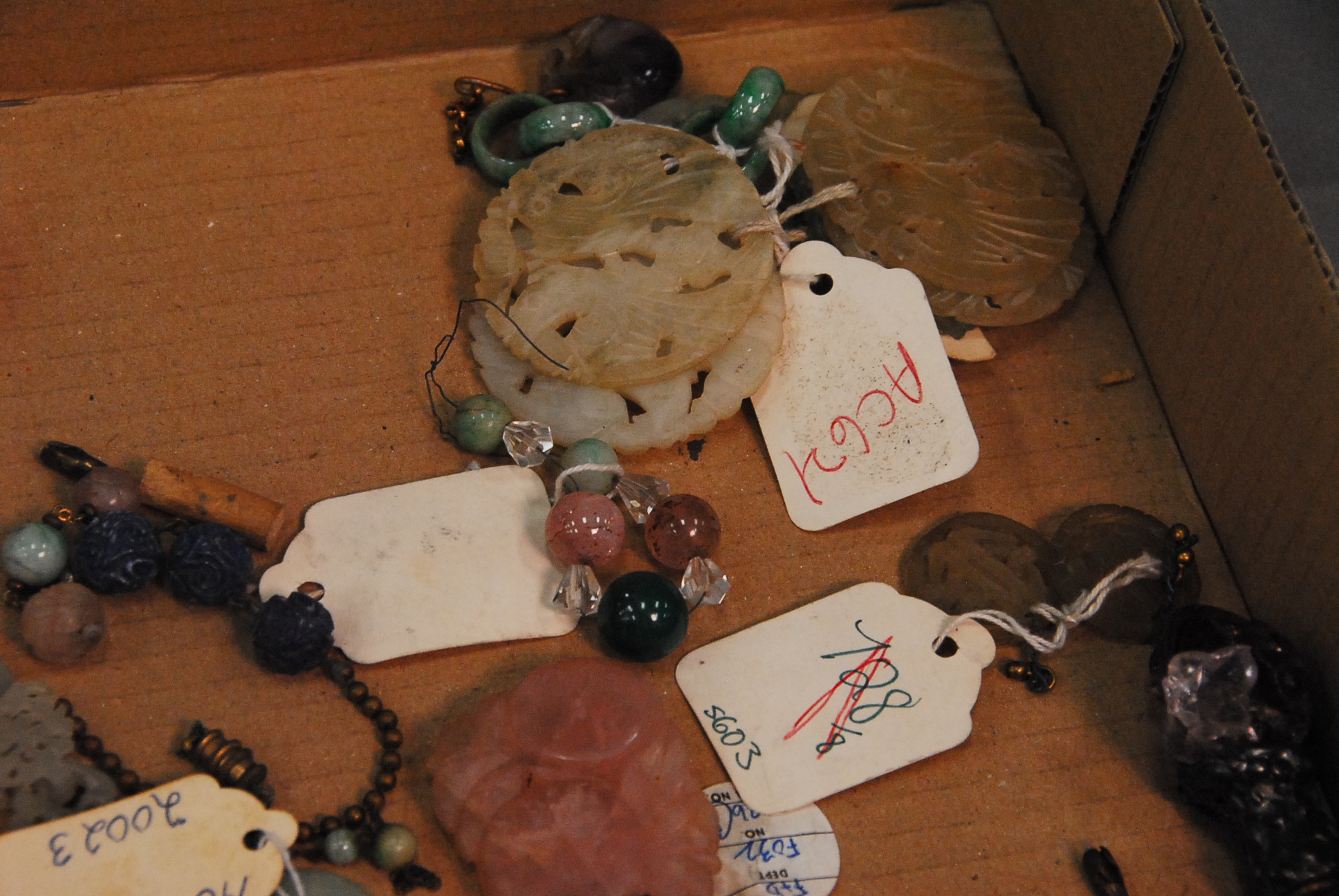 Lot 422: Large group of quartz, jade, hardstone, and amethyst, to include medallions, beads, finials, and small rings, 1/2 to 2 1/2.