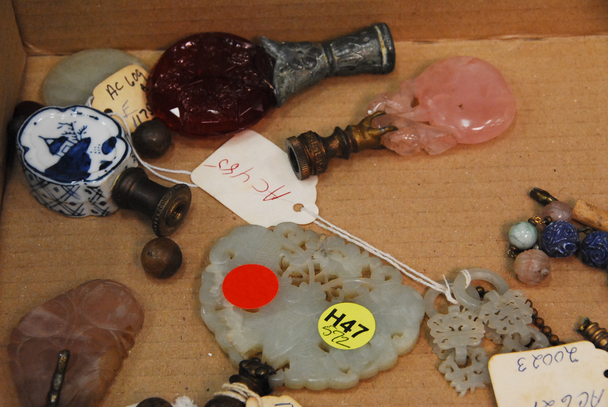 Large group of quartz, jade, hardstone, and amethyst, to include medallions, beads, finials, and small rings, 1/2 to 2 1/2.